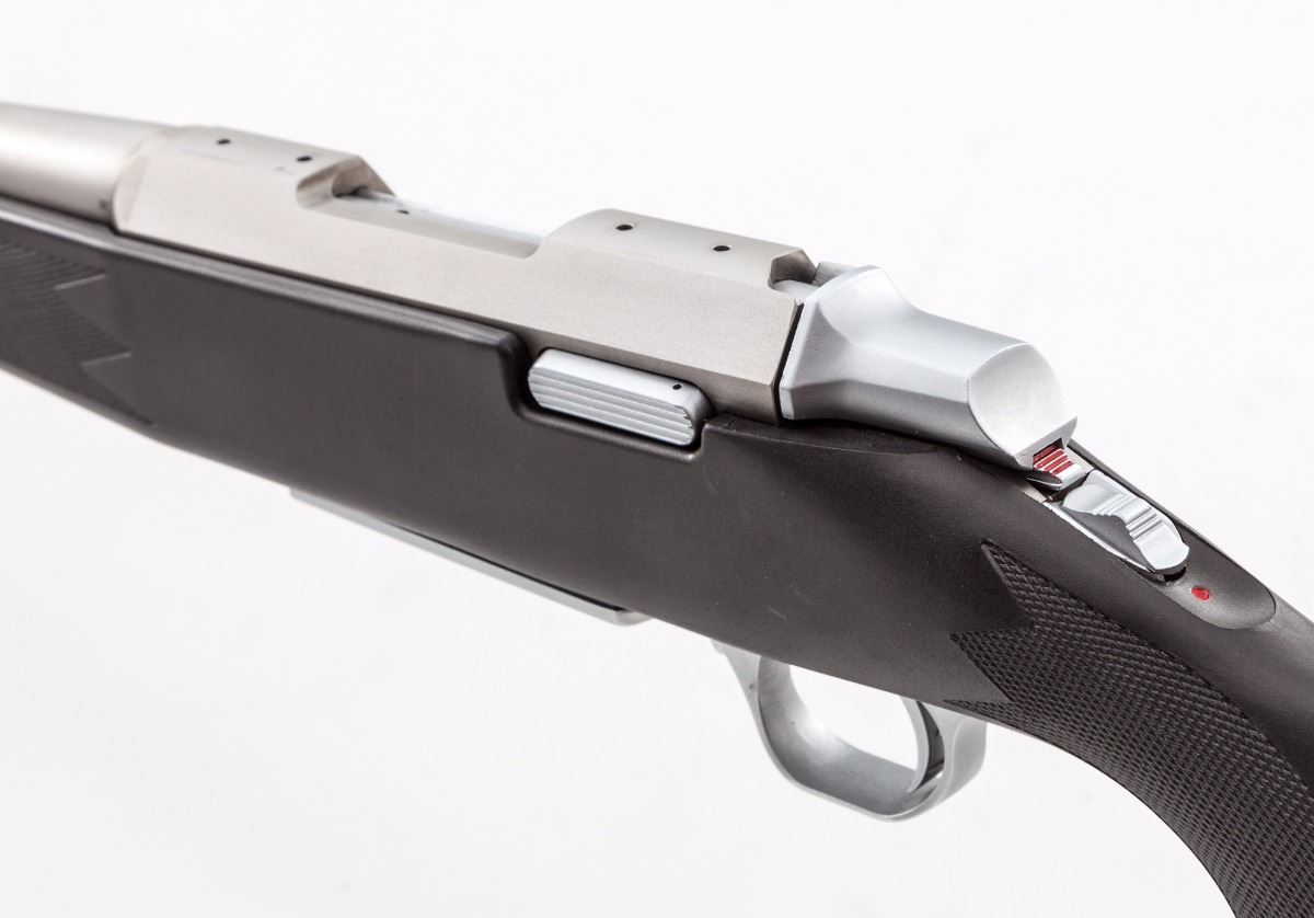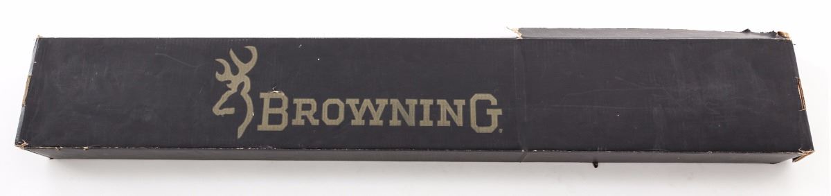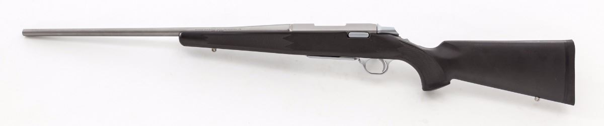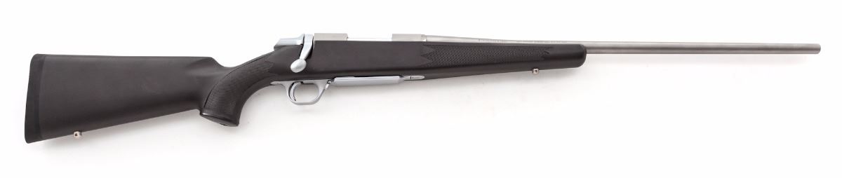 Browning Stalker A-Bolt II Bolt Action Rifle, #20826NR8S7, .308 cal., 22'' barrel, stainless steel, checkered black synthetic pistol-grip stock, black hard rubber Browning recoil pad, sling swivel studs, tapped for scope base. Condition is near excellent. Receiver with a shallow scratch to left side and marks to top where scope base was removed. Stock with a few scattered scuffs and scratches. Checkering is crisp. Action is crisp, bore is bright. In original box with matching end label, owner's manual and other Browning paperwork. Box with some external scuffs and one large tear to end flap and long edge. Est.: $500-$750. (Modern)
