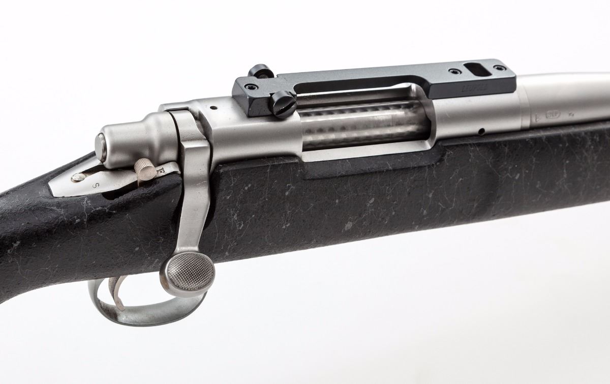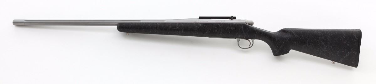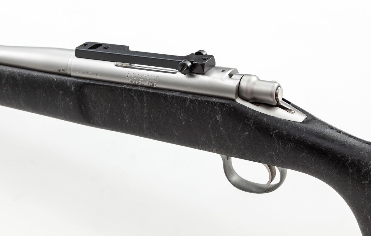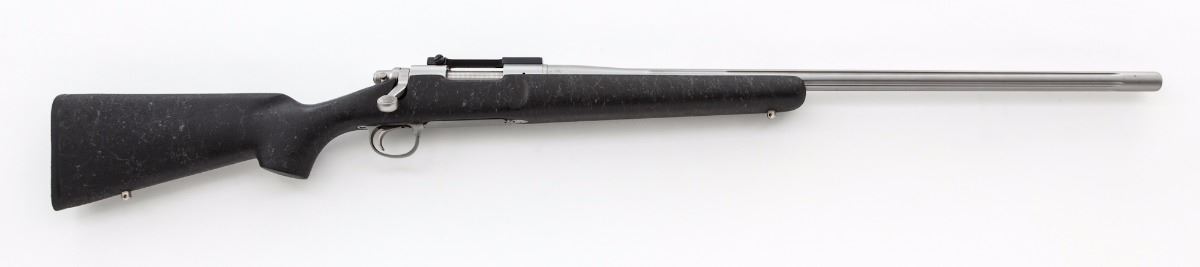 Remington Model 700 Bolt Action Rifle, #S6273373, .22-250 cal., 26'' fluted barrel, matte stainless, textured pistol-grip black synthetic stock with gray accents, sling swivel studs, topped with a Leupold one-piece scope base. Condition is near excellent showing normal signs of moderate use, including scattered light scuffs and other marks from handling, the most noticeable being to the floorplate and triggerguard. Action and bore are excellent. Est.: $500-$800. (Modern)