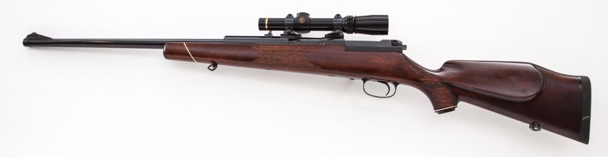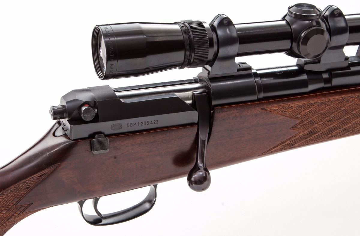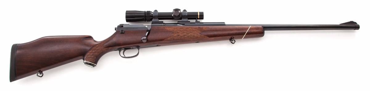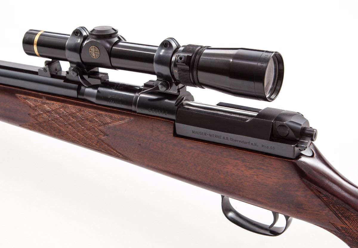 Mauser Oberndorf Model 66 Safari/Big Game Bolt Action Rifle, #G20852, .458 Win. mag. cal., 25-1/2'' barrel, blue finish, skipline checkered pistol-grip walnut stock with cheekpiece, decorative black Mauser grip cap, Pachmay Decelerator black rubber recoil pad, with sling swivels, ramped brass bead front sight and folding rear sight. Topped with a Leupold Vari-X III 1.5x5 scope on quick-detachable mount. Top of receiver is marked with the Mauser Banner logo. Condition to metal surfaces is excellent retaining approx. 98% blue, with scattered light marks from handling, the most noticeable being to the right side of the barrel near the rear sight. Stock is about fine as refinished, retaining a somewhat dark reddish brown overall color. Stock with general light to moderate impressions, a few which extend into the checker pattern. Action is crisp, bore is bright, scope optics are bright and clear. Est.: $1,200-$1,800. (Modern)