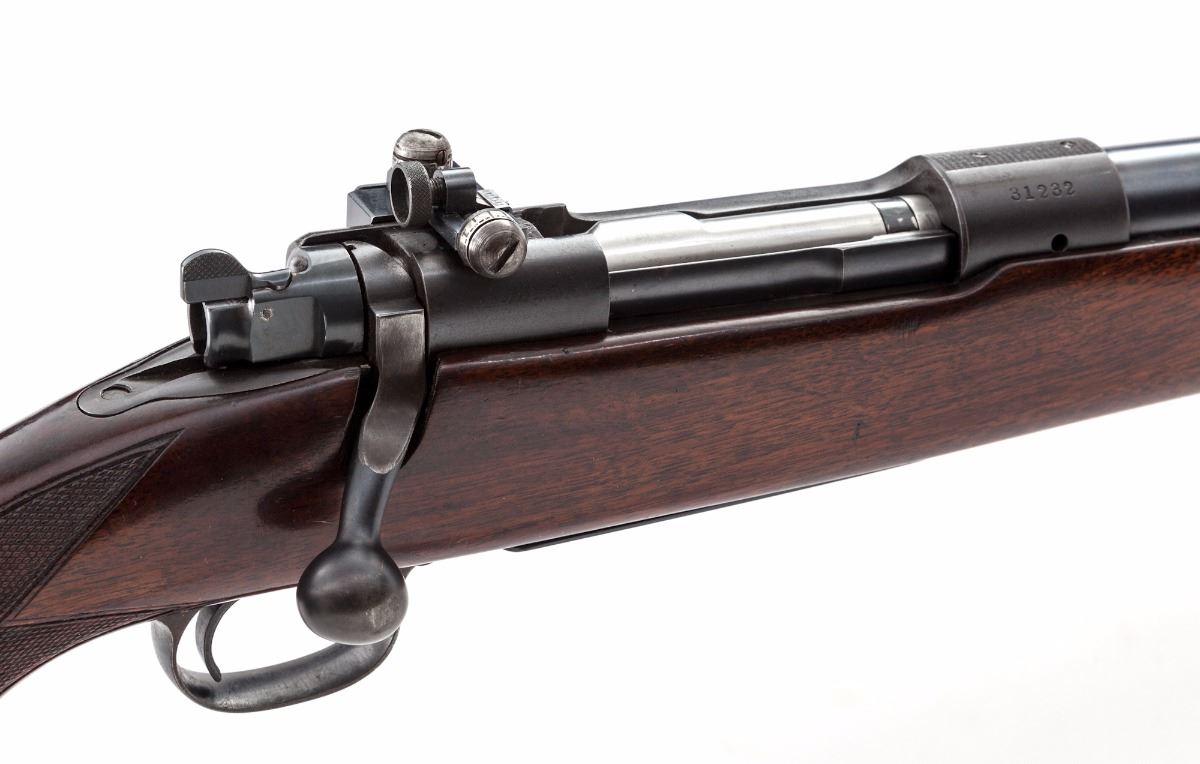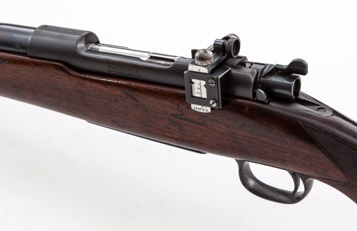 Pre-War Winchester Model 70 Bolt Action Rifle, #31232, .30-06 cal., 24'' barrel, blue finish, checkered walnut stock, with original checkered blue steel buttplate. Redfield peep rear sight, gold bead front sight, pre-war type doll's head upper tang. Mfg'd 1940. Condition is fine retaining approx. 92% original blue. Stock with light general marks overall from field use. Magazine floorplate with scuffs and scratches, yet still retaining approx. 80% blue. Action is good, bore is bright. Est.: $1,000-$1,500. (C&R)