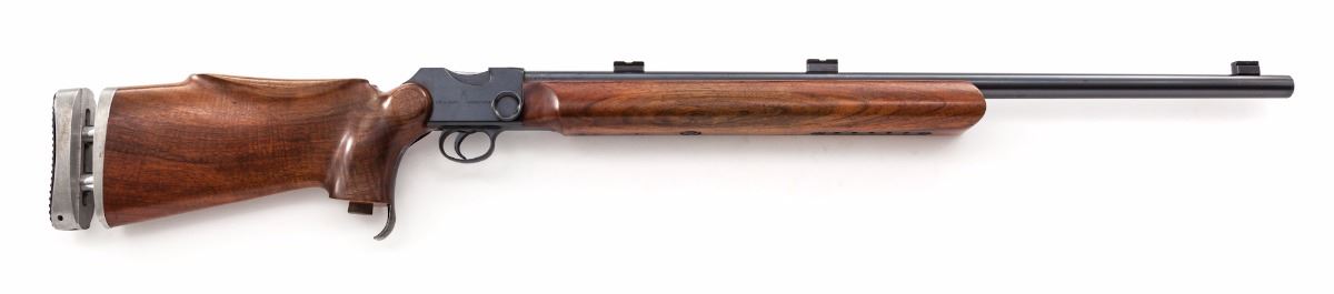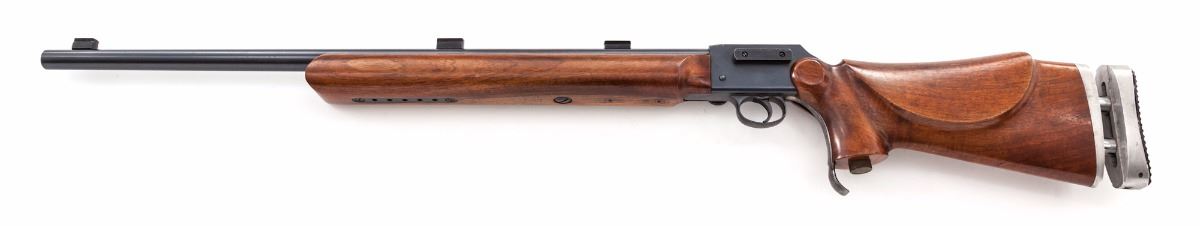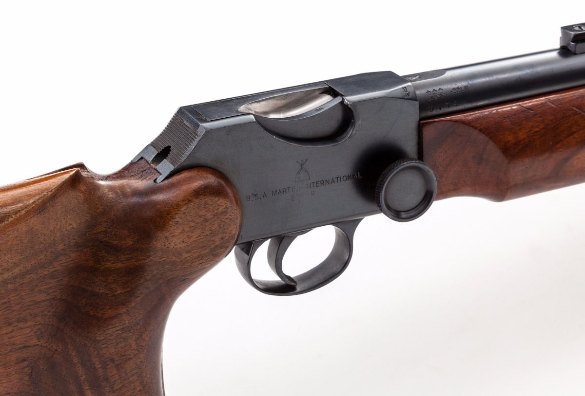 Custom BSA-Martini Falling Block Takedown Target Rifle, #U174, .22LR cal., 28'' barrel with three scope/sight blocks and receiver side block for attaching a peep sight; walnut stock has a semi-gloss finish with roll-over Monte Carlo high-comb and adjustable front handstop rail; Canjar steel buttplate is adjustable for drop and length of pull, weight is 13 lbs. Overall condition is very good with bright bore, sharp rifling, and light pitting on the muzzle. Blue finish remains approx. 95% with scattered freckling and scuffing on the top of barrel between the scope blocks. Stock has a few small handling marks and extra holes drilled in the underside of the forend for a palm rest. Est.: $600-$900. (C&R)
