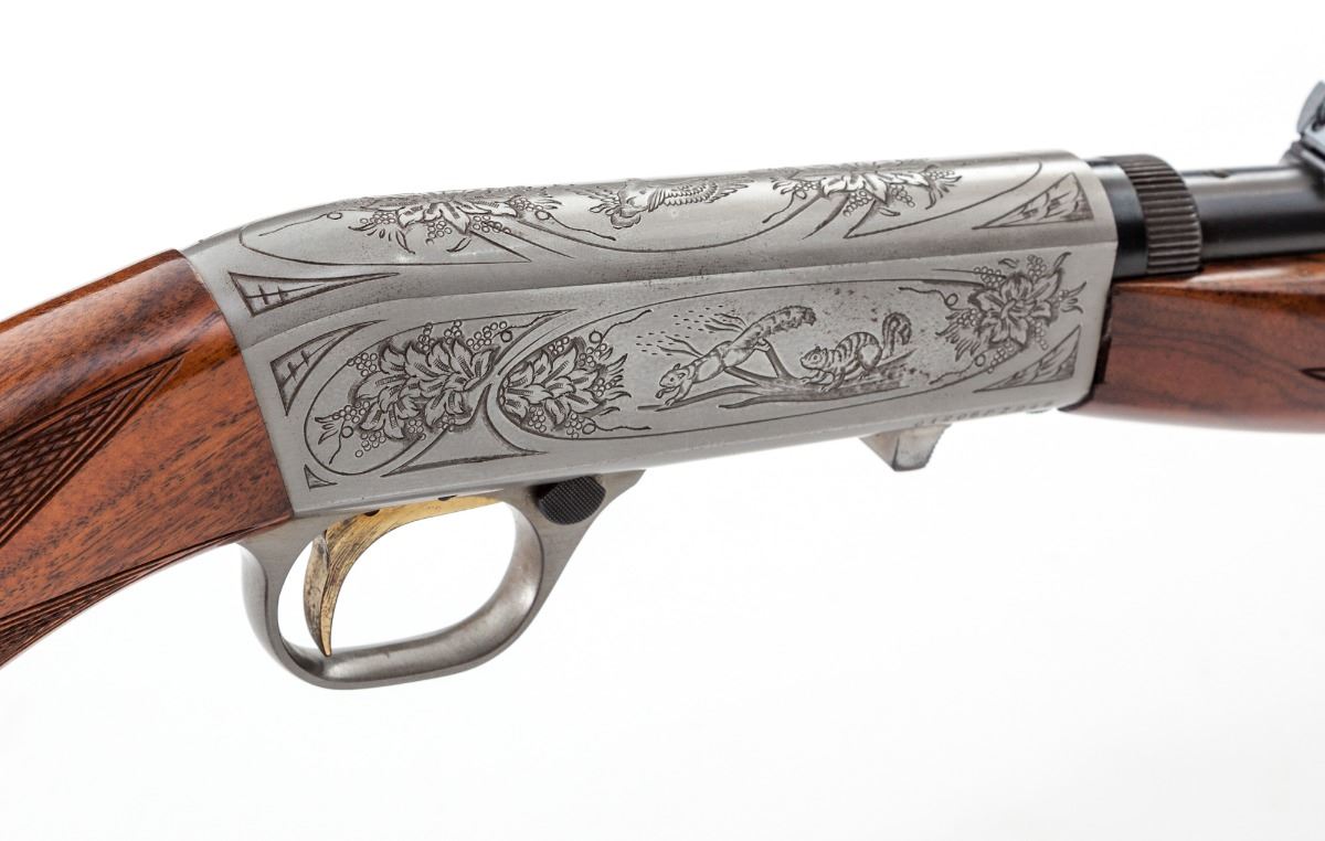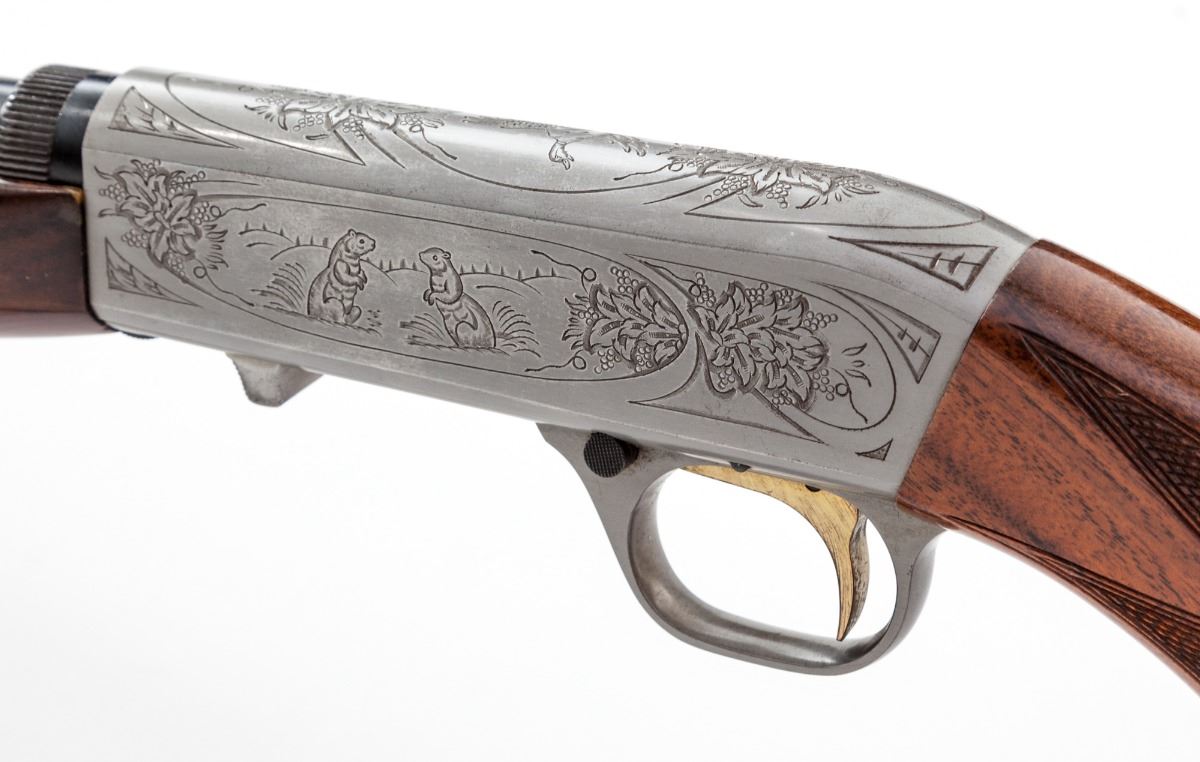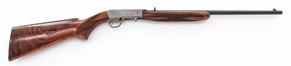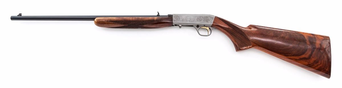 Browning Grade II .22 Semi-Automatic Takedown Rifle, #01206PZ246, .22 LR cal., 19'' blue finish barrel with folding rear sight and front beaded blade sight, also drilled and tapped for barrel mounted scope base. Receiver has a French gray finish with foliate scroll engraving, highlighting small game scene cameos on the sides, with duck in flight on the top. Trigger is gold plated and triggerguard has a push-button safety. Checkered pistol-grip stock and forend are highly figured walnut with a gloss finish and 13-3/4'' length of pull to a grooved metal buttplate. Mfg. ca. 1981 by Miroku. Overall condition is very good with signs of moderate use. Bore has residual fouling and oxidation; bolt and receiver have a layer of fine oxidation and light pitting. Stock and forend finishes have scattered small dings and scratches with a few scuffs in the checkering. Est.: $750-$1,000. (Modern)
