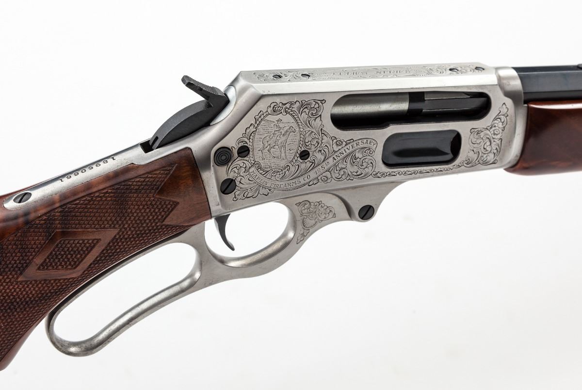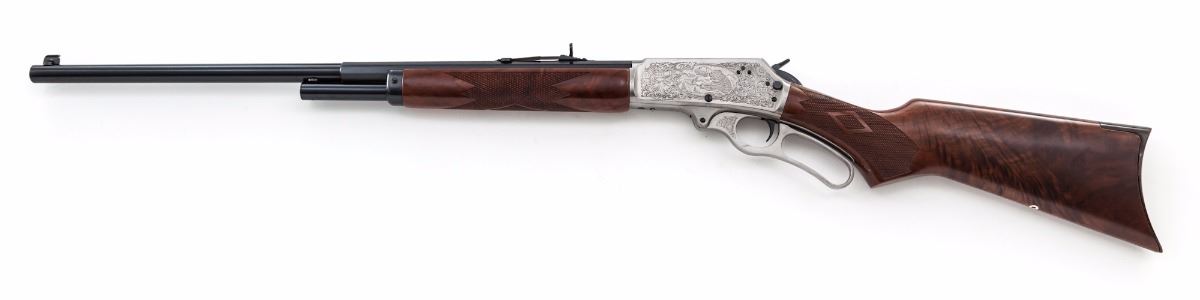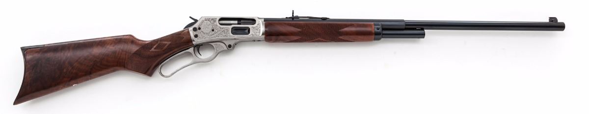 Marlin 125th Anniversary Commemorative Model 1895 Ltd. Lever Action Rifle, #18950661, .45-70 cal., 24'' part-round barrel, bright finished scroll and floral engraved game scene receiver, celebrating the 125th anniversary of Marlin firearms, as well as the 100th anniversary of the 1895. Select fancy checkered walnut stock and forend, with buckhorn rear and gold bead front sight. Condition is excellent. Rifle appears unfired and shows only the lightest marks from handling. Action is crisp, bore is bright. Est.: $800-$1,200. (Modern)