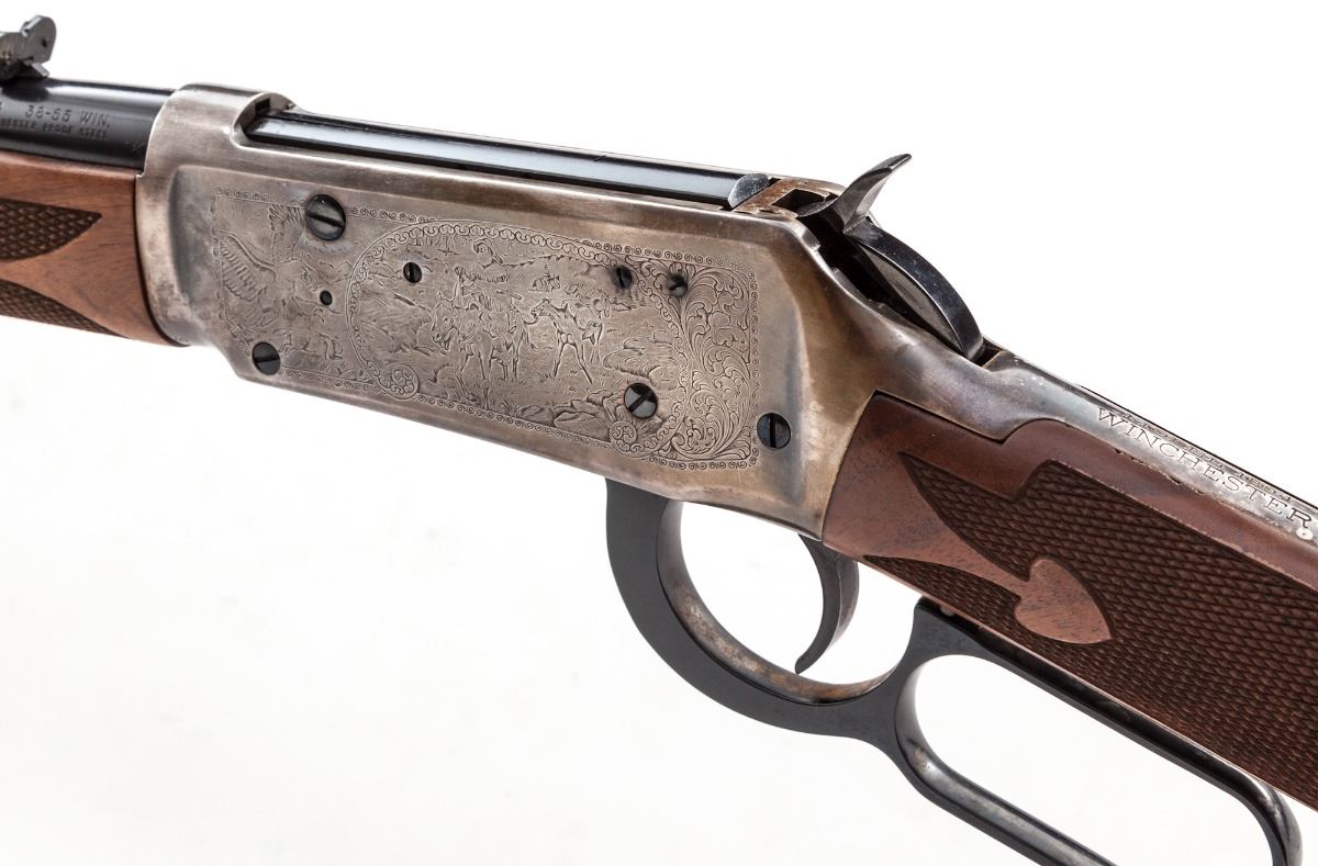 Winchester Legendary Frontiersman Model 94 Lever Action Carbine, #LF13536, .38-55 cal., 24'' blue barrel marked ''Legendary Frontiersman in gold, silver frame, fancy oiled checkered American walnut straight stock, with crescent blue steel buttplate. Condition is excellent, appearing near new, with only slight tarnishing to receiver that can be easily cleaned. Stock is excellent. In original box with polychrome slipcover. Est.: $800-$1,200. (Modern)