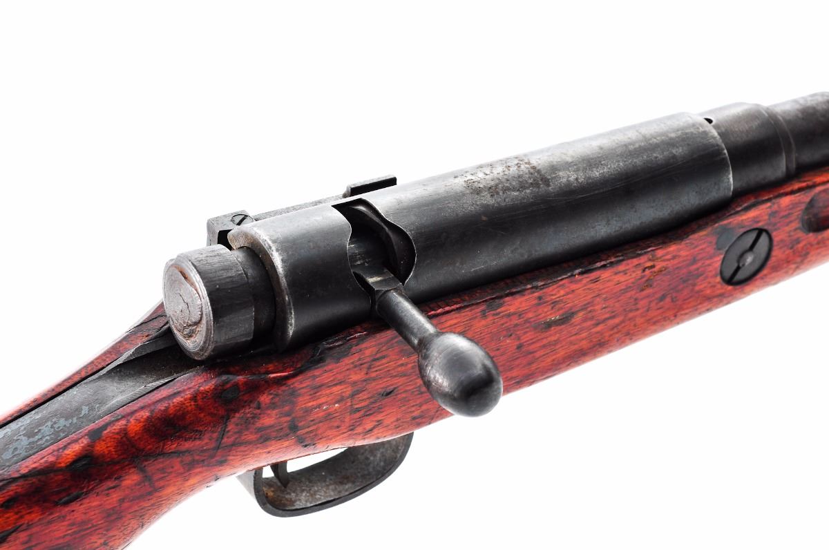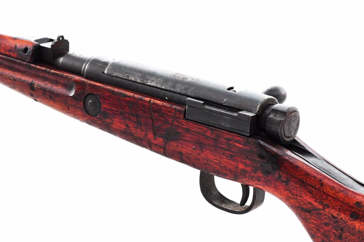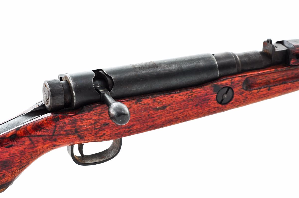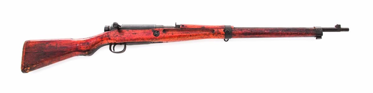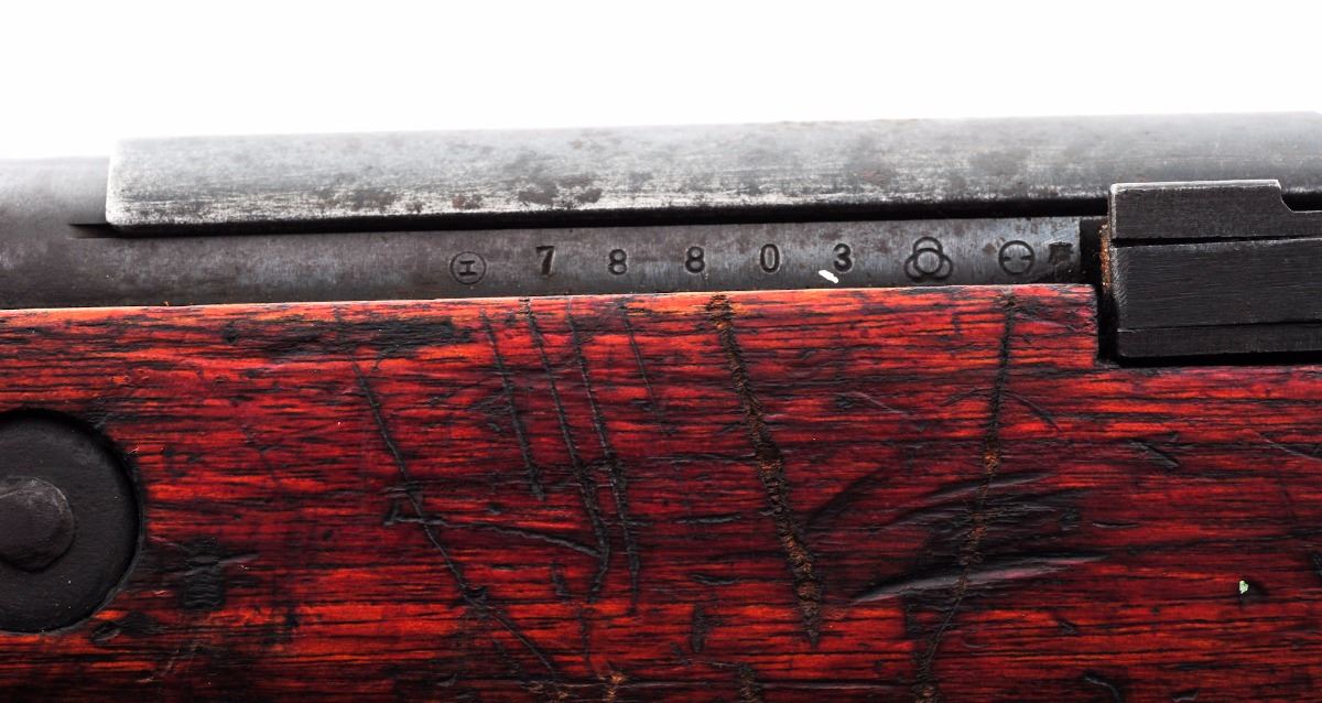 Japanese Type 99 ''Last Ditch'' Bolt Action Rifle, by Tokyo Kogyo Arsenal, #78803, 7.7mm, 26'' barrel, blue finish, pistol-grip hardwood stock, standard Last Ditch type sights, with dustcover, wood buttplate and sling swivels. Mum has been ground. Condition is good with very little blue finish remaining and an overall dark patina with fine surface rust. Stock has been lightly sanded with an additional coat of varnish, as well as a crack to wrist on the right side (crack appears to be old). Action is tight, bore is very good with moderate frosting. Est.: $125-$250. (C&R)