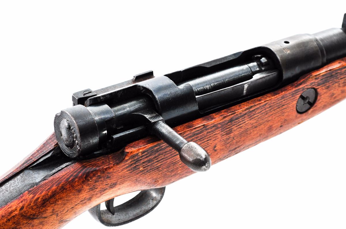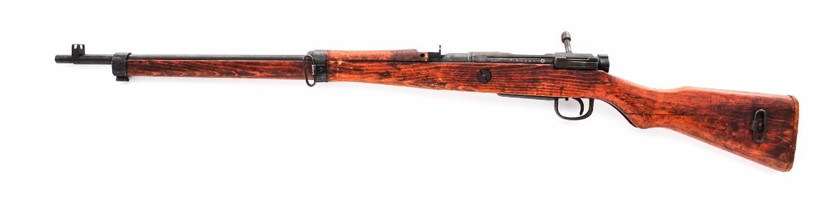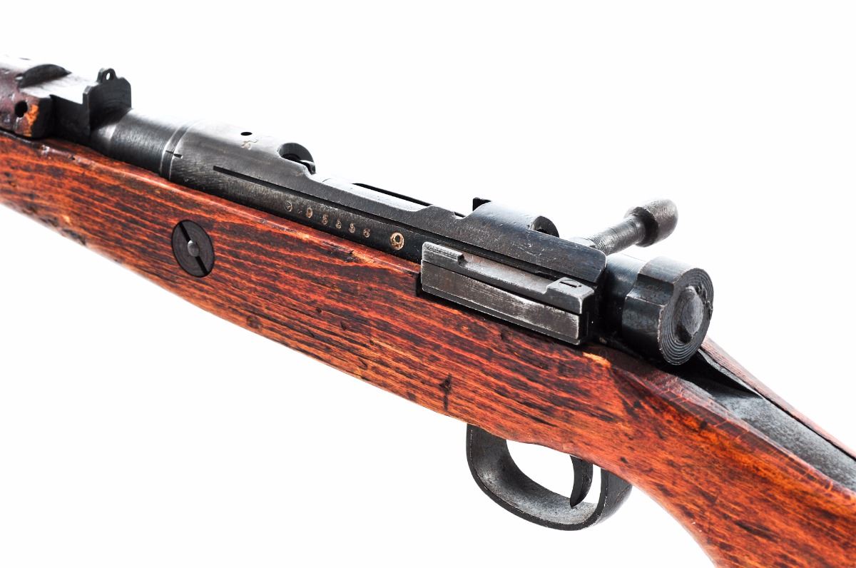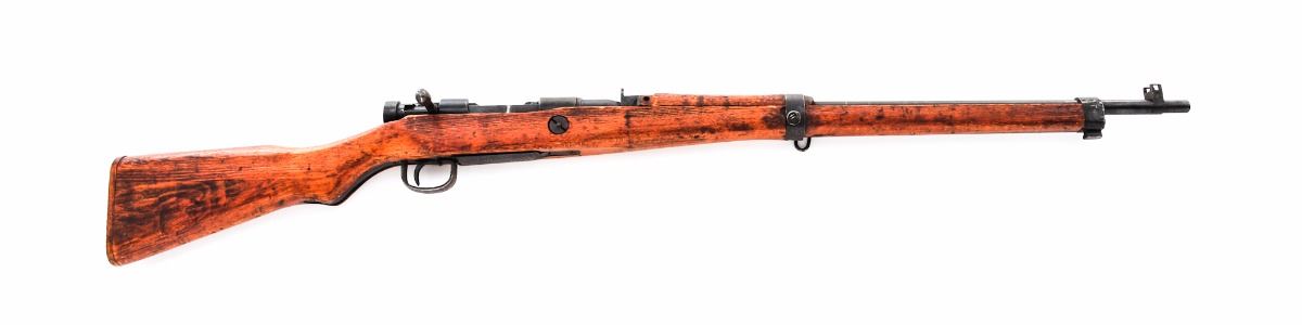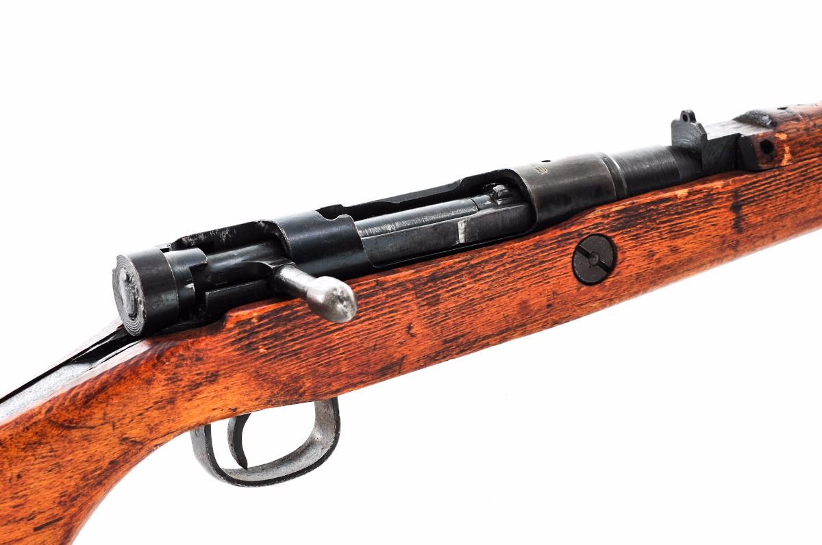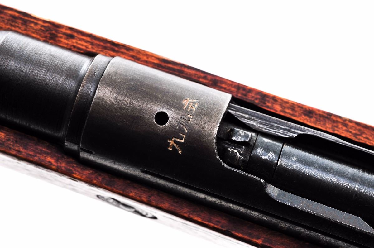 Japanese Type 99 ''Last Ditch'' Bolt Action Rifle, by Nagoya Arsenal, #95556, 7.7mm, 26'' barrel, blue finish, pistol-grip hardwood stock, standard Last Ditch type sights, with wood buttplate and sling swivels. Mum has been ground. Condition is good retaining approx. 70% blue that has darkening considerably. Stock has been lightly sanded with an additional coat of aging varnish. Many small parts are crudely cast as you would expect from a Last Ditch rifle and some with surface rust. Bolt, extractor and receiver with matching serial numbers. Action is tight, bore is fine with light frosting. Est.: $150-$300. (C&R)