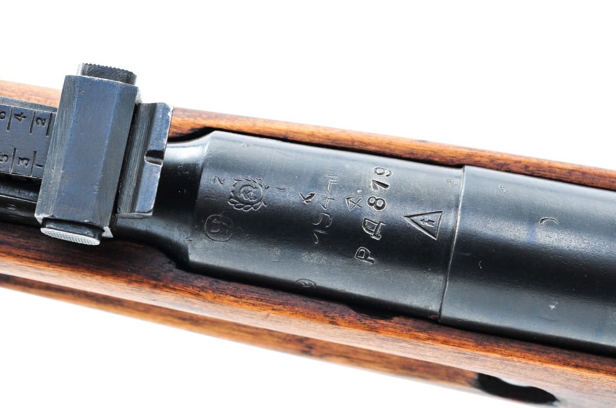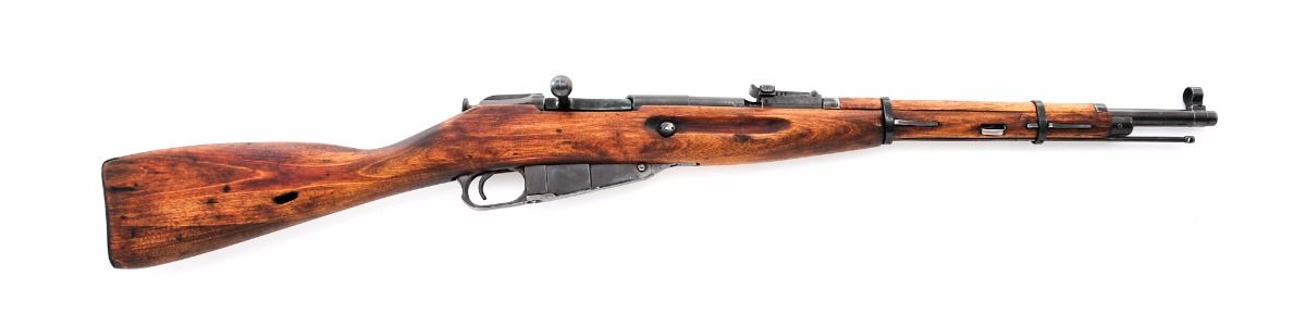 Mosin-Nagant Model 38 Bolt Action Carbine, by Izhevsk, #PA819, 7.62x54Rmm, 20'' barrel, blue finish, European walnut stock, with standard sights and cleaning rod. Receiver is dated 1944 with Russian hammer and sickle, and Izhevsk arrow and triangle. Triggerguard and bolt are serial numbered to the gun. Condition is very good retaining approx. 93%-95% blue. Stock has been sanded and had small well-executed repairs near upper barrel band to both the right and left side. Import marked to bottom of barrel. Action is crisp, bore is fine with light frosting. Est.: $150-$250. (C&R)