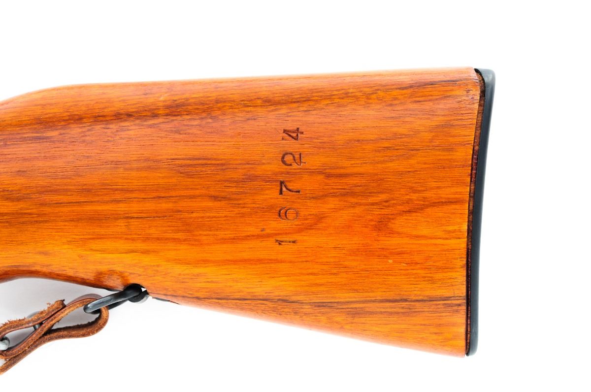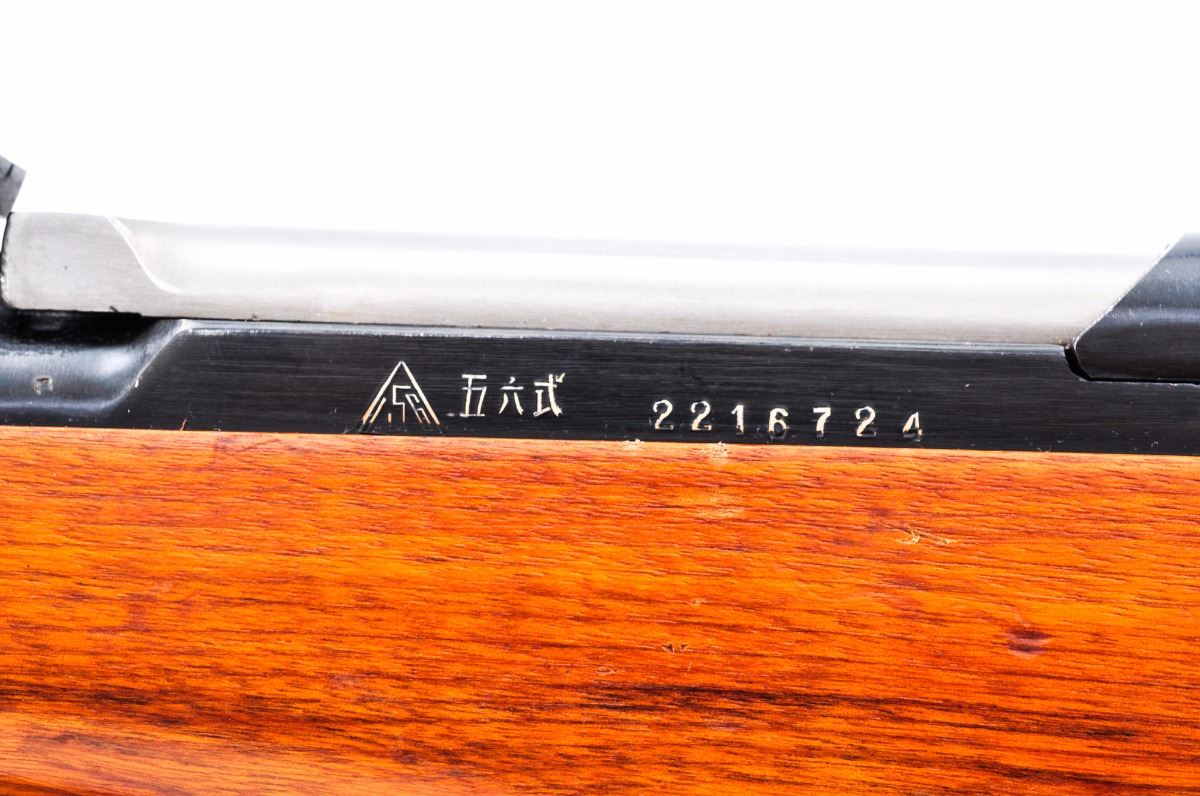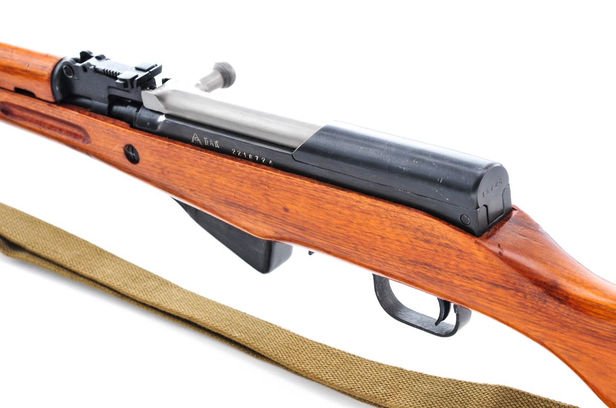 Norinco SKS Semi-Automatic Rifle, #2216724, 7.62x39mm, 20-1/2'' barrel, blue finish, hardwood stock, with green canvas sling, standard sights, and folding 3-edged bayonet. Arsenal 156 markings to left side of receiver. Condition is near excellent with all visible matching numbers, retaining approx. 97% blue with clear maker's marks and a few scattered light to moderate scratches, mainly to receiver. Stock with scuffs and impressions. Import marked to lower right side of barrel. Action is crisp, bore is bright. Est.: $400-$550. (C&R)