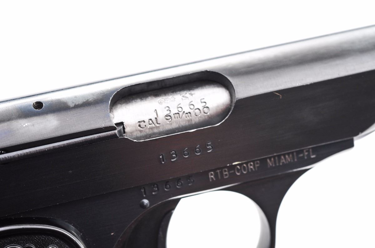 Fabrique Nationale Model 125 Semi-Automatic Pistol, #76Y35665, 9mm Short cal. (.380 ACP), 4-1/2'' barrel, blue finish, black plastic grips, with three (3) military style magazines, Browning commercial style adjustable rear, high ramp front sight, and ''(crown)/J'' proofmarks on barrel behind front sight. Mfg'd 1976. Condition is excellent retaining approx. 99% of its original brushed blue finish. This pistol was produced by FN for the Dutch Army and is marked on the slide with the ''(crown/J'' proofmark of Queen Juliana of the Netherlands. (Browning produced a slight vartiation of this pistol as the Model 10/71 in .380 ACP.) Import marked. Grips are excellent. Action is tight. Grips are excellent, bore is near mint. Est.: $350-$500. (Modern/PPT)