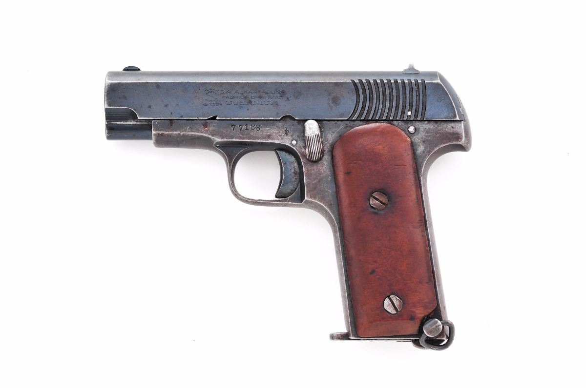 Spanish ''Ruby'' Semi-Automatic Pistol, by S.A. Alkartasuna, #77186, .32 ACP cal., 3-5/8'' barrel, blue finish, smooth hardwood grips, fixed sights, with one magazine. Right side of frame marked ''Spain''. Condition is good to very good retaining approx. 55%-60% thinning and toning blue, with scattered red oxidation and fine corrosion. Grip screws are worn at edges; grips with general light scratches and impressions. Action is tight, bore is good with some fine corrosion. Est.: $200-$350. (C&R)