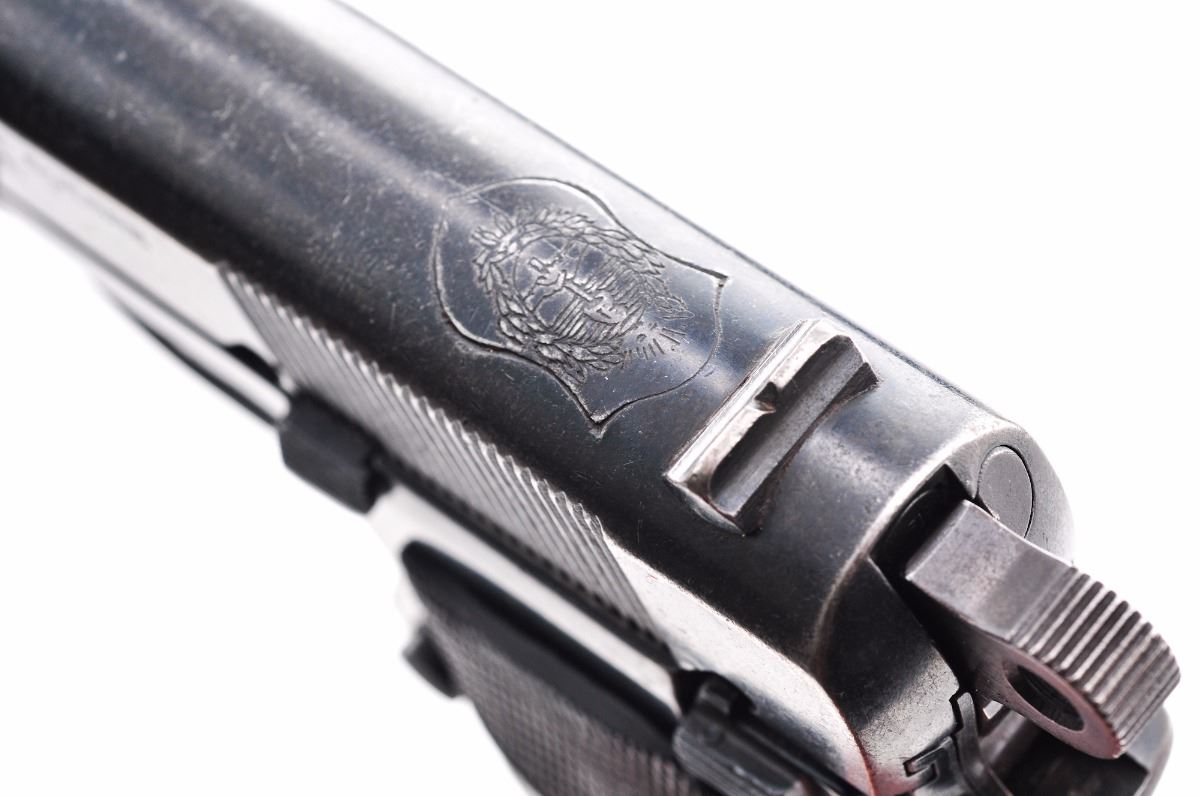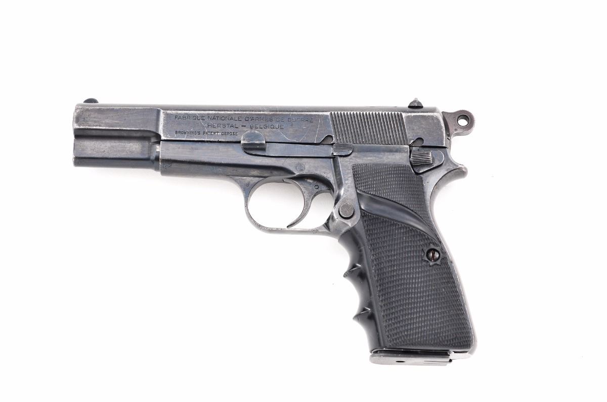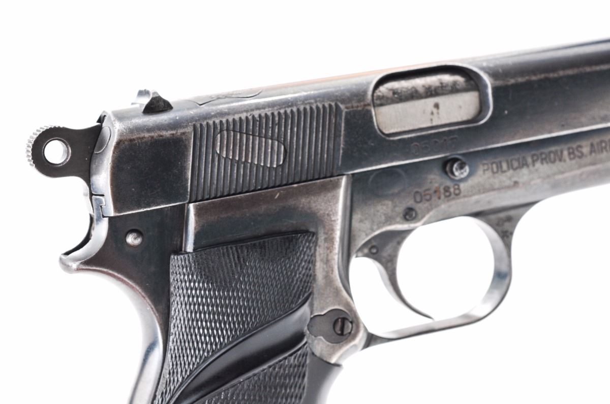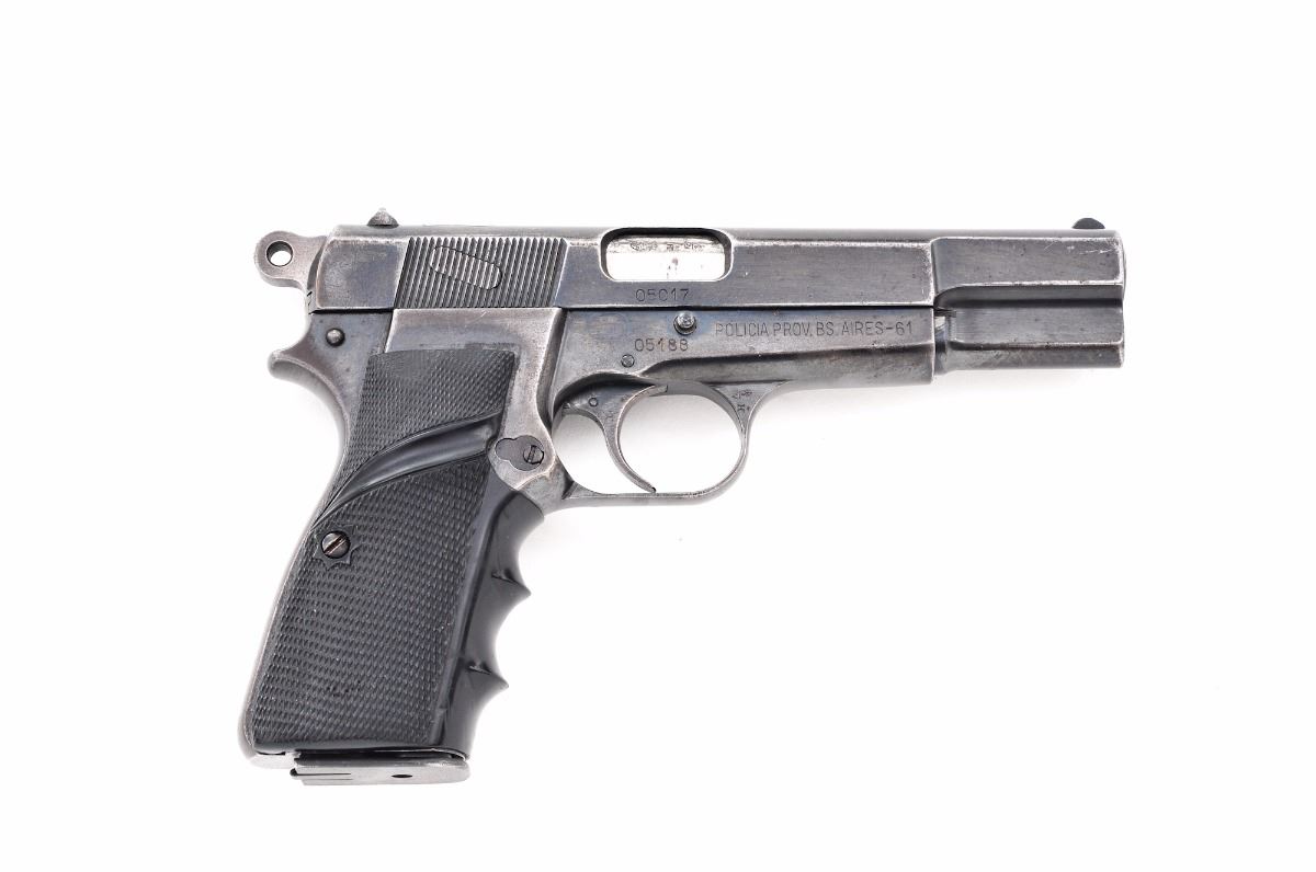 FN Buenos Aires Police marked High-Power Semi-Automatic Pistol, #05188, 9mm, 4-3/4'' barrel, blue finish, black fingergroove rubber grips, standard fixed sights, with one high-cap magazine. Top of slide marked with Argentinean crest; right side of frame marked ''Policia Prov. BS. Aires-61''. Frame and slide with mismatched serial numbers. Condition is very good retaining approx. 75%-80% thinning blue, with wear to the high edges and right side of frame near grip. Markings remain clear. Grips with impressions and some flattening to checkers. Action is tight, bore is very good with light frosting. Est.: $300-$500. (C&R) (High cap mags not available to Calif. residents.)
