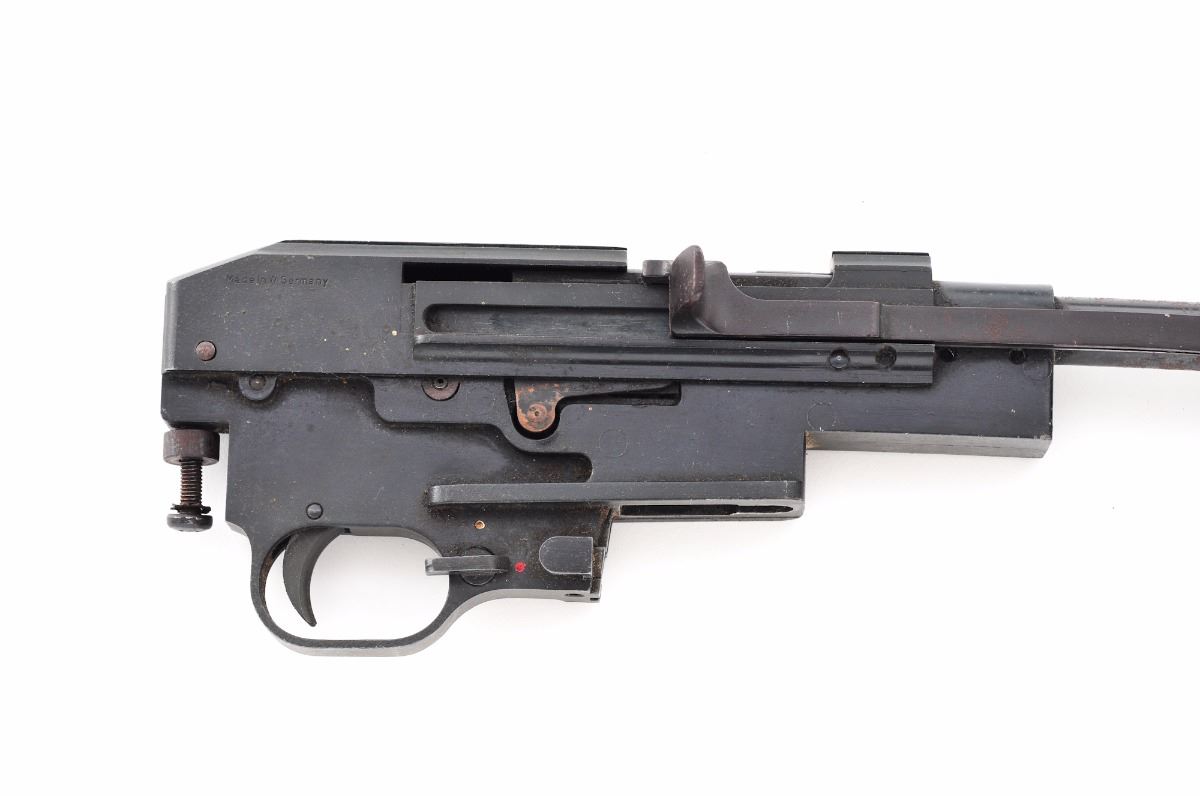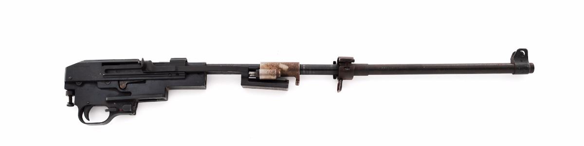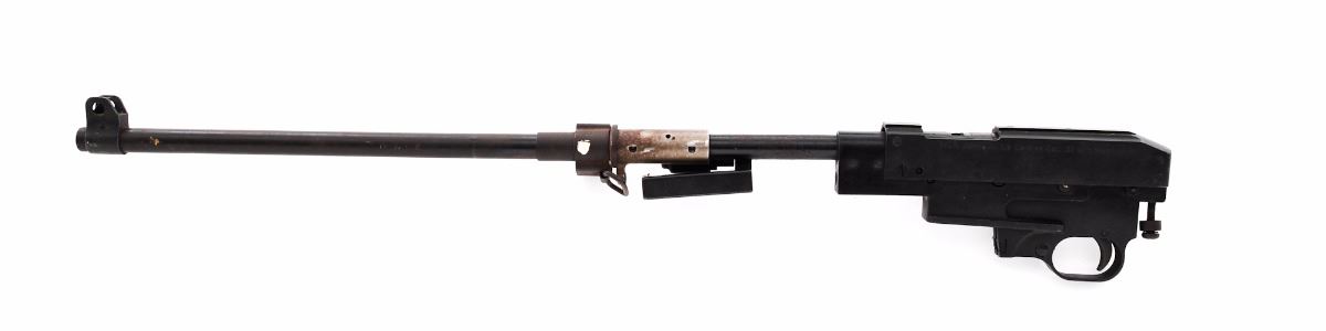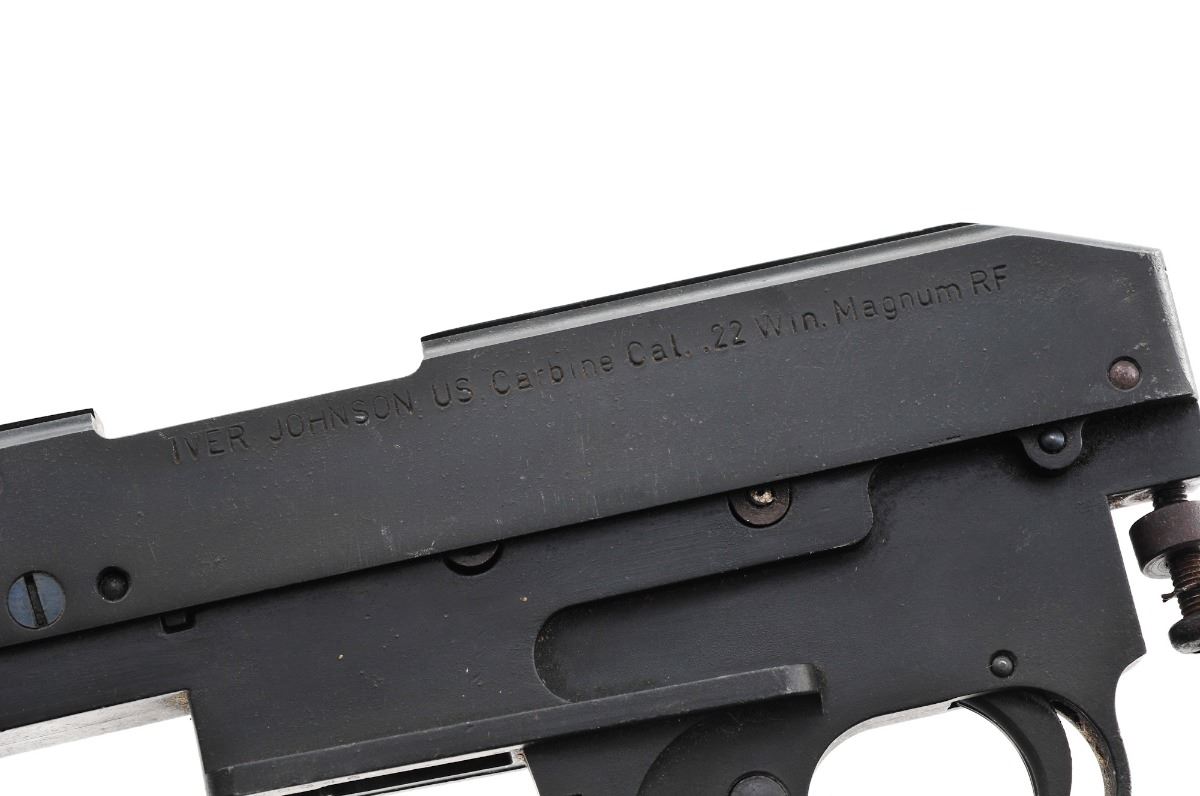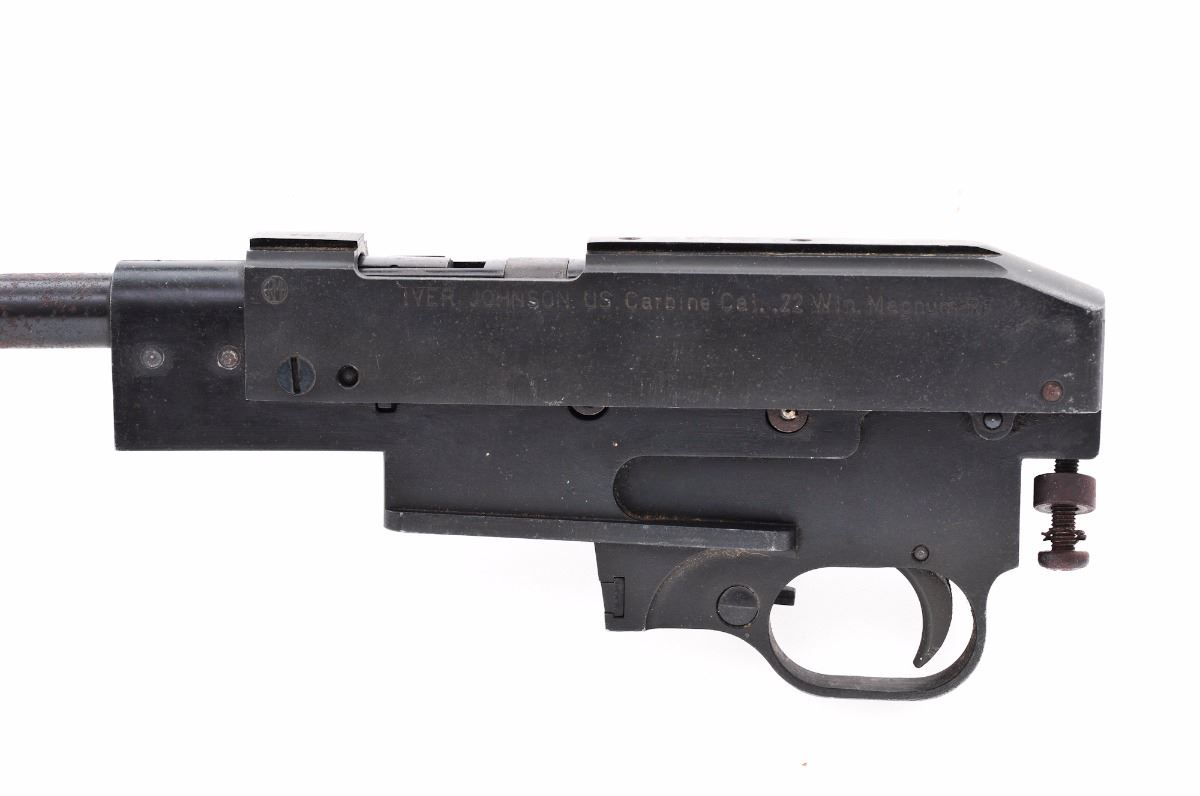 Barreled Action for Iver Johnson ''U.S.'' Semi-Automatic Carbine, #000346, .22 mag. cal., 19'' barrel, matte finish, no stock. Condition is good, needing stock and handguard, and possibly straightening to operating rod. Metal surfaces show general rust to barrel and receiver needs a good cleaning. Good action, bore should clean to fine. Made in West Germany. Est.: $100-$200. (Modern)