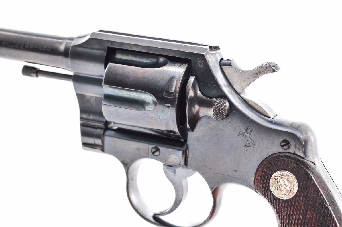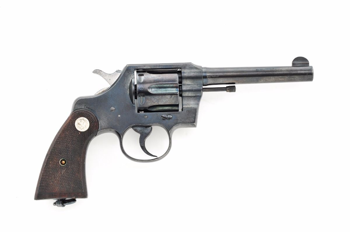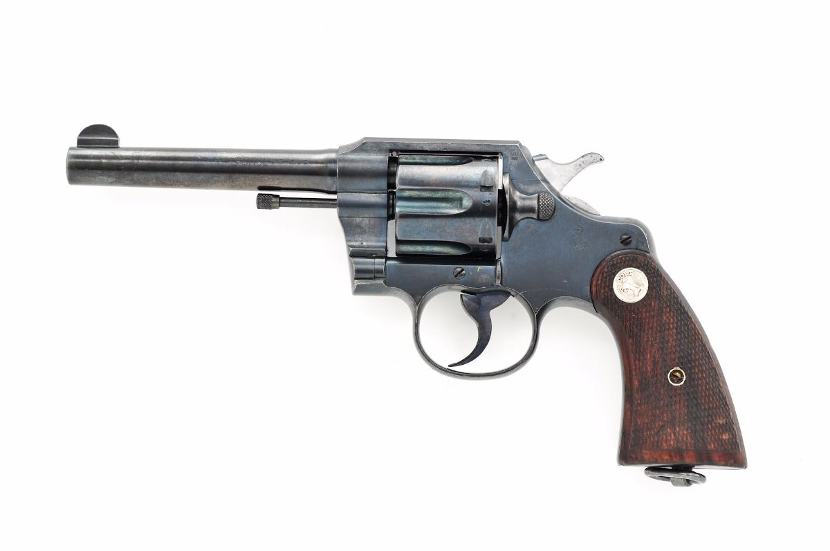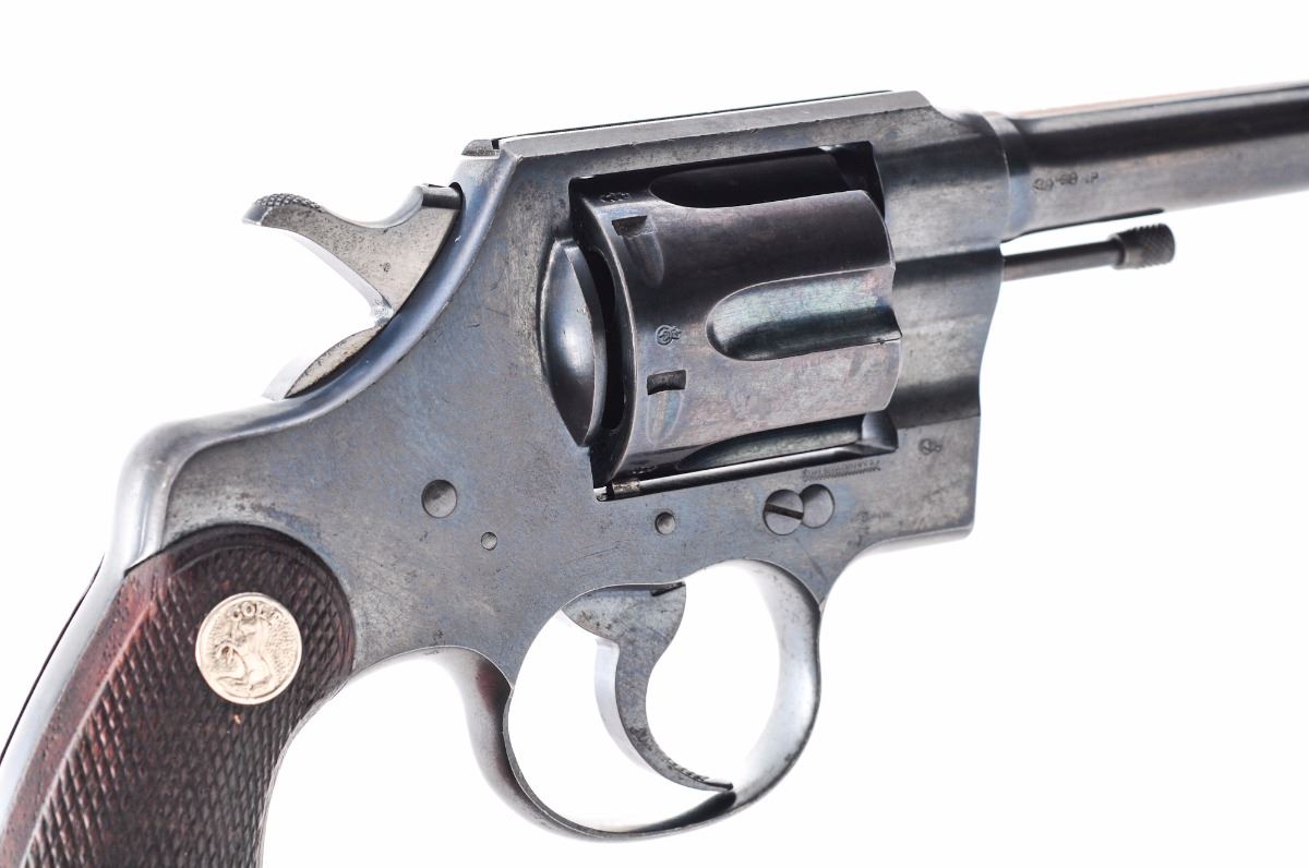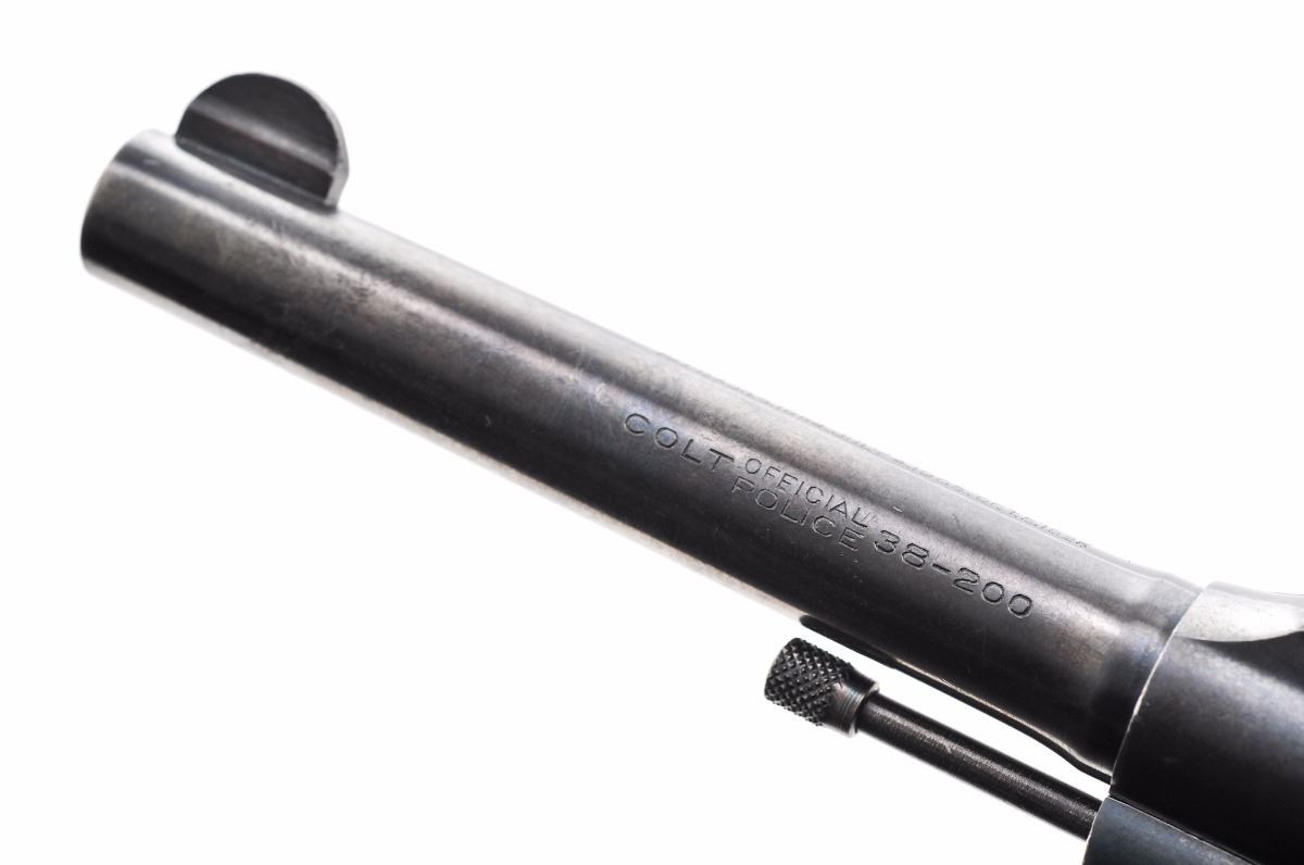 Colt .38/200 British Service Double Action Revolver, #664760, .38-200 (.38 S&W) cal. 6-shot, 5'' barrel, blue finish, checkered walnut service grips with inlaid Colt medallions, lanyard loop in butt, with various British proofmarks of the Woolwich proof house. Mfg'd 1941. Condition is near excellent retaining about 95% original blue with minor dents and micro-scratches mostly to the barrel. Grips show minor flattening to the checkers. Butt is marked with the Woolwich arsenal number 4641 near the lanyard loop. Bore and chambers are excellent showing very little if any use. Colt supplied several thousand of these pistols to the British purchasing agency and apparently they were issued mostly to the London Police. This is a good example of this model. Est.: $450-$600. (C&R/PPT)
