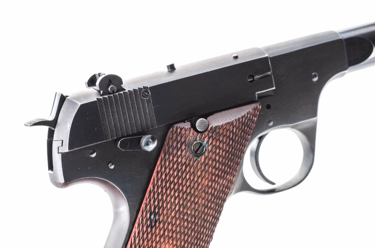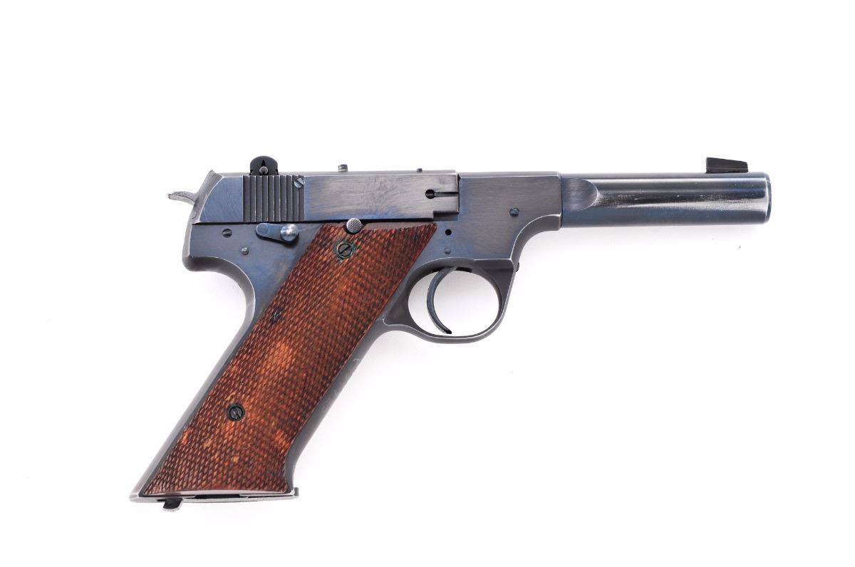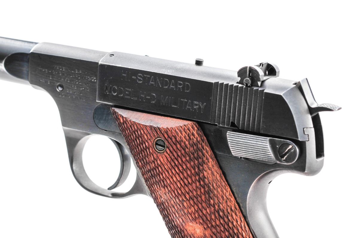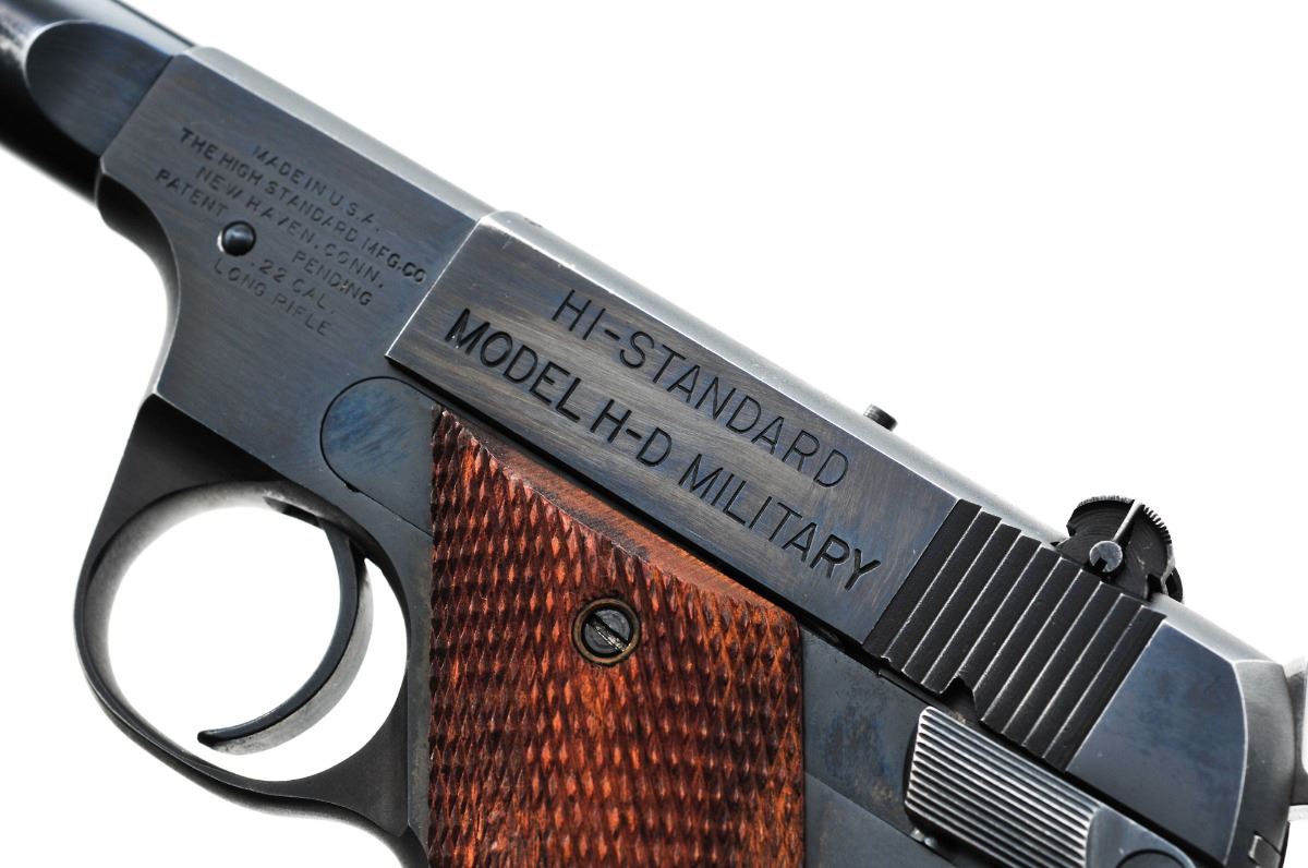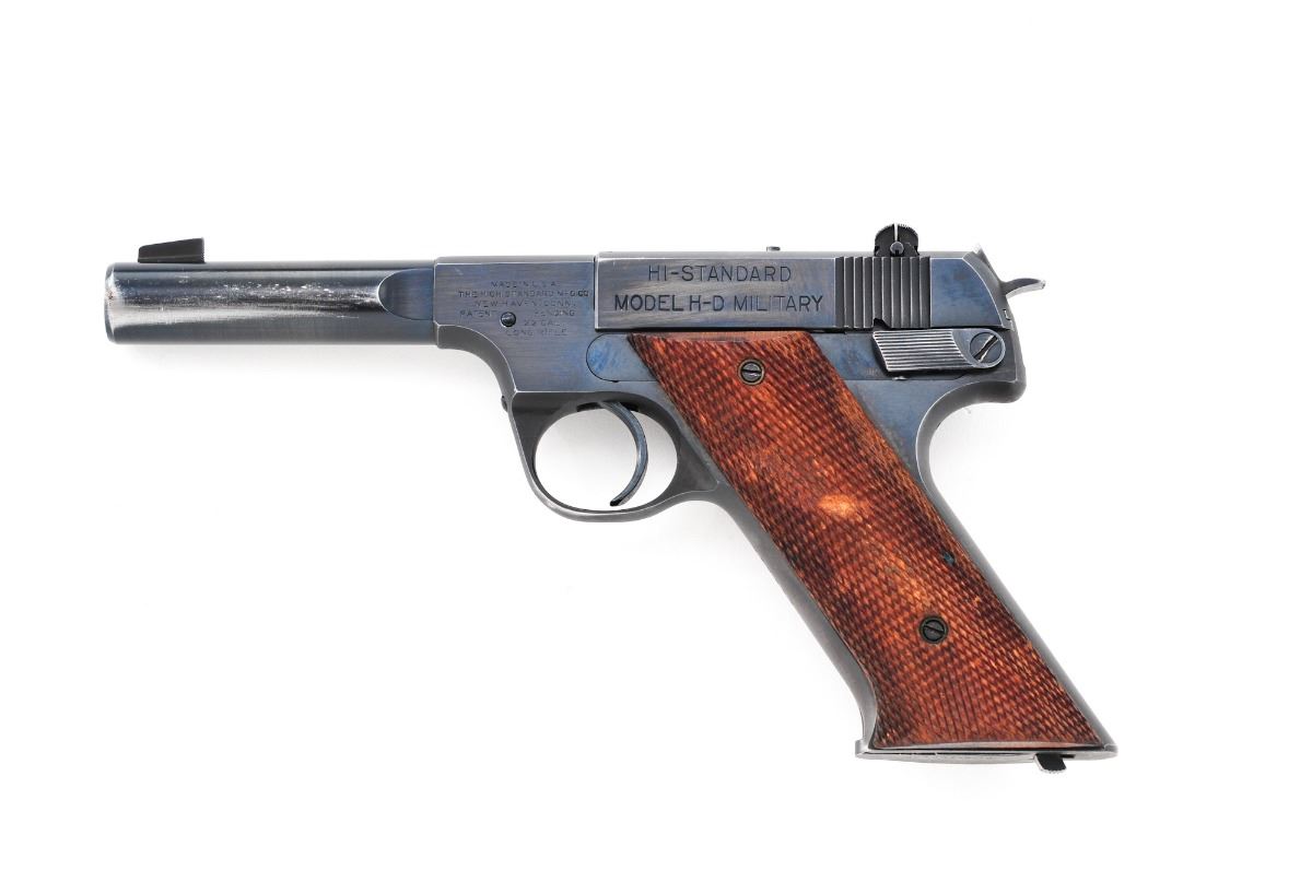 Hi-Standard Model H-D Military Semi-Automatic Pistol, #252853, .22 LR cal., 4-1/2'' barrel, blue finish, factory checkered walnut grips, standard sights, with one correct Hi-Standard magazine. Condition is very good retaining approx. 90% original blue with thinning to front and back grip strap, as well as substantial losses to right and left sides of barrel. Grips with some flattening and impressions, including one larger finger-size impression to the left grip panel. Action and bore are excellent. Est.: $350-$500. (C&R/PPT)