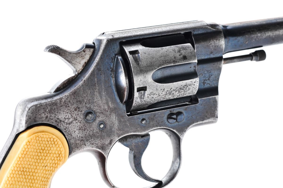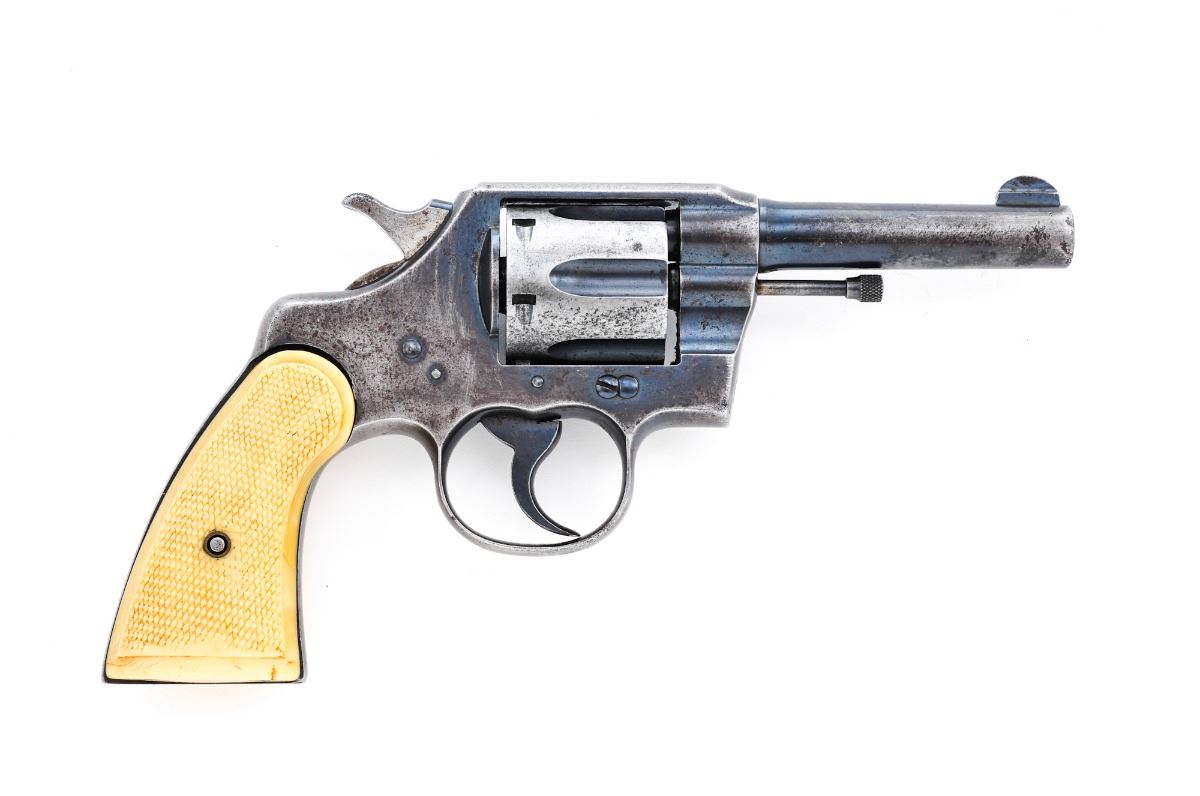 Colt Army Special 38 Double Action Revolver, #480473, .38 Spec. cal. 6-shot 4''barrel, blue finish, checkered white plastic grips, fixed service type sights with half-moon front. Mfg'd 1922. Condition is good with significant loss to bluing overall and general surface freckling. Grips are aftermarket replacements. Action is tight, bore is bright with some surface roughness near the muzzle. Est.: $150-$300. (C&R)