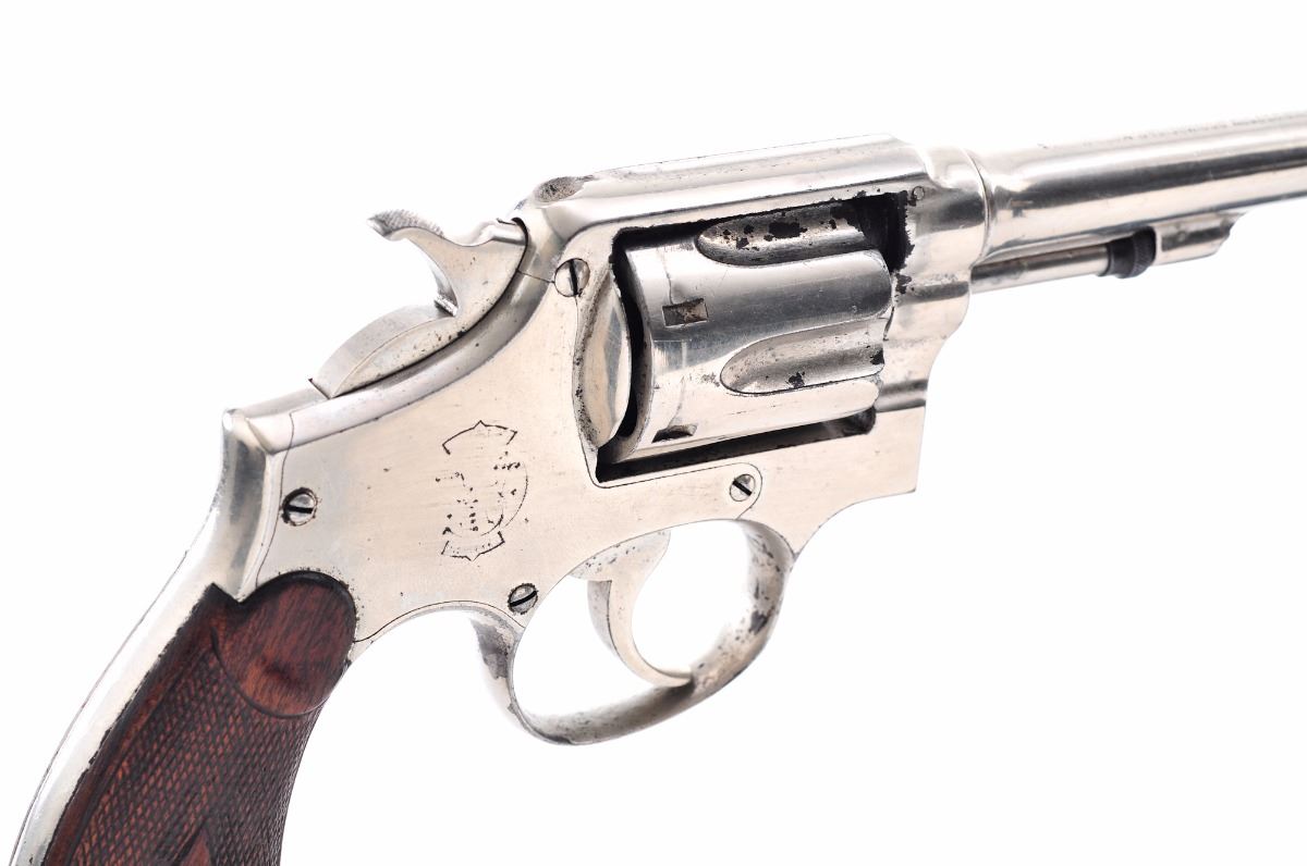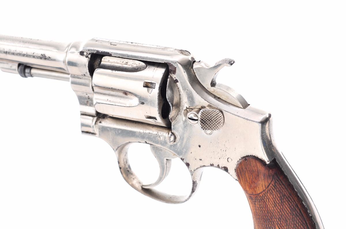 Smith & Wesson M&P (Model of 1902) 1st Change Double Action Revolver, #77757, .38 S&W cal., 5'' barrel, nickel finish, dished/checkered walnut service grips. Condition is good as refinished in nickel with overall minor losses to finish; all original markings are buffed. Walnut grips are worn with loss to front of left panel. Action is tight, bore is good with some frosting and light pitting. Est.: $150-$300. (C&R)