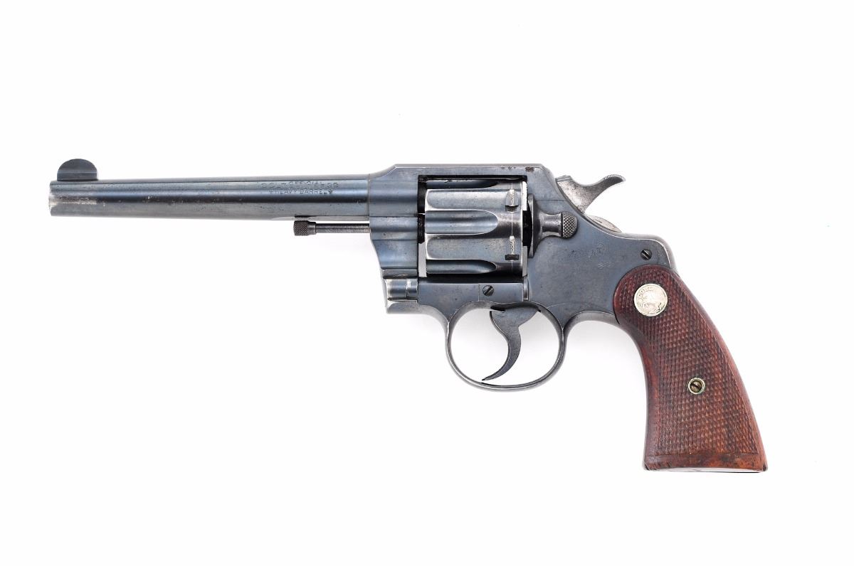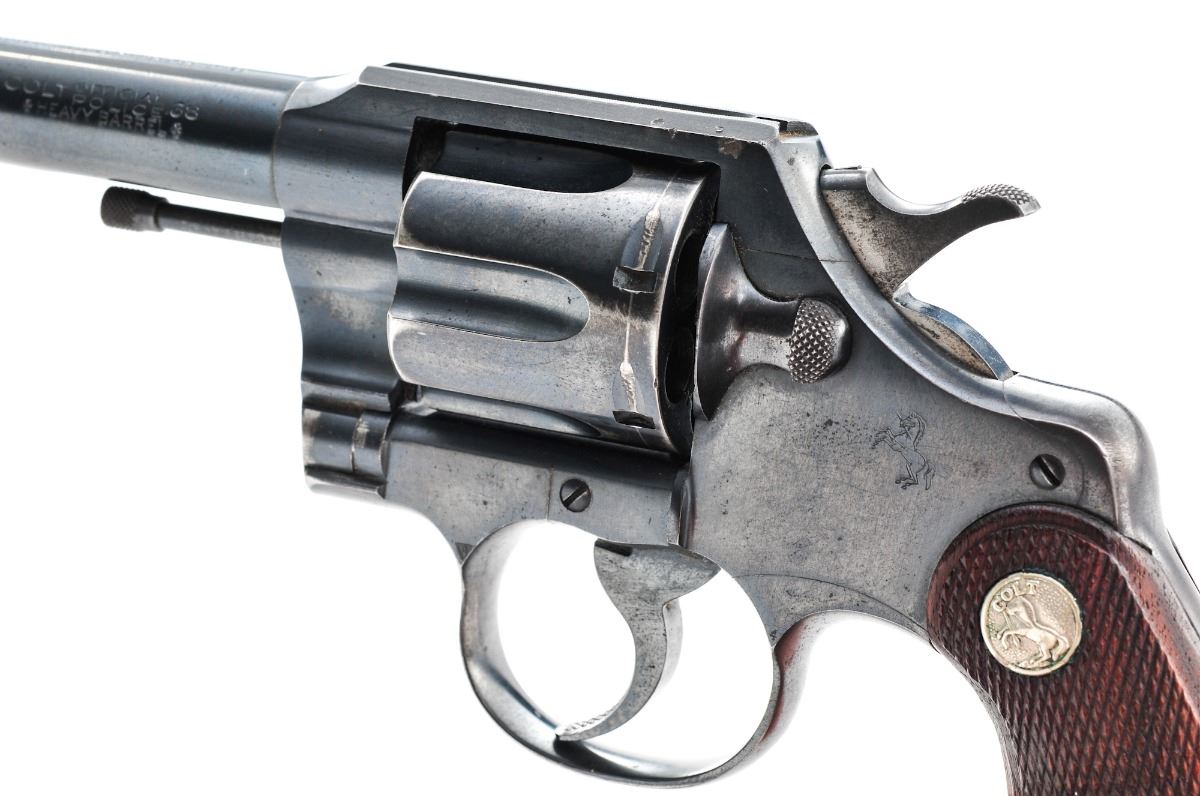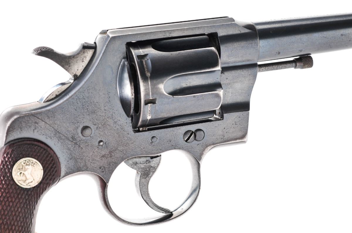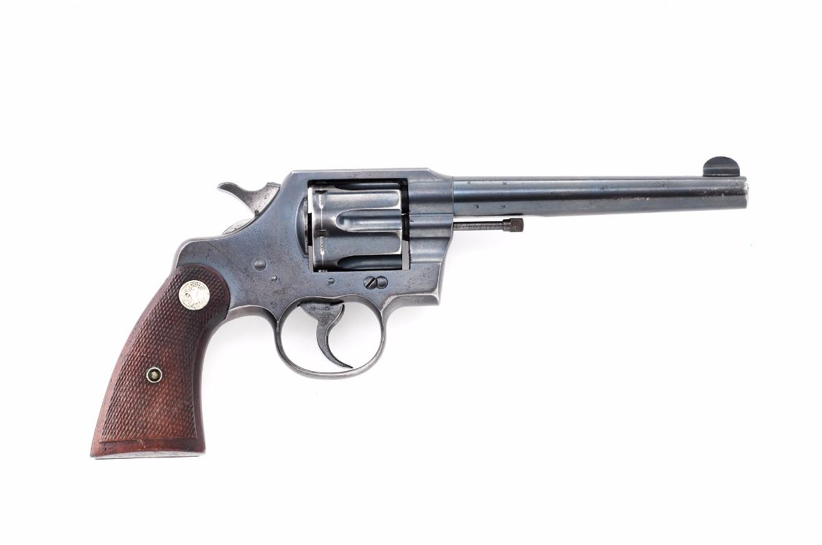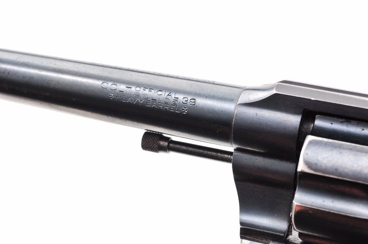 Colt Official Police Double Action Revolver, #683541, .38 cal., 6'' heavy police barrel, blue finish, factory checkered walnut grips, with fixed sights and half-moon front. Barrel marked ''Colt Official Police/Heavy Barrel .38''. Mfg'd 1942. Condition is very good retaining approx. 85%-90% original blue with light overall freckling and some micro-scratching. There is a small area of pitting on the left side of the frame over the cylinder and to top of barrel. What appears to be a driver's license number has been lightly scratched to the bottom of the butt strap and under the barrel flat. Grips are very good with a few small dents. Action is tight, bore is bright with strong rifling. Est.: $450-$750. (C&R/PPT)