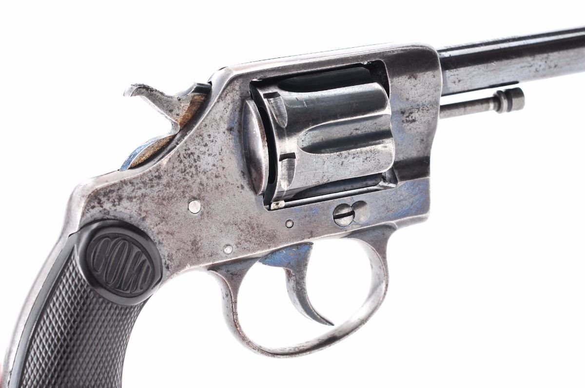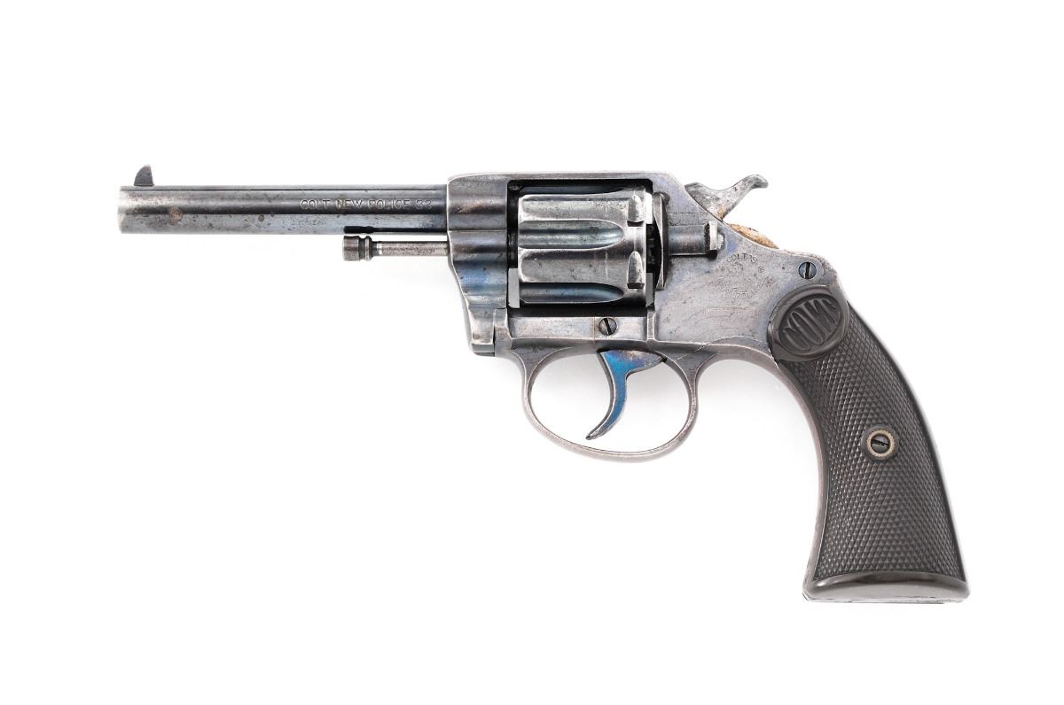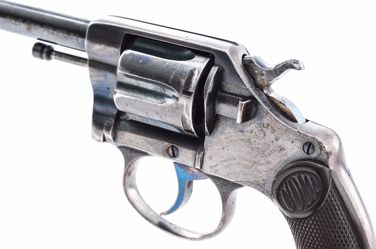 Colt New Police Model Double Action Revolver, #28871, .32 New Police cal., 4'' barrel, blue finish, hard rubber grips, with fixed service style sights. Mfg'd approx. 1905. Last patent date on barrel is 1900. Condition is good retaining approx. 60% original blue with overall freckling and minor scratches and one area of corrosion on the rear grip strap. Front sight has been ground to a narrow point with light marks remaining on top of barrel. Grips are good with one chip missing from the right rear corner. Bore and chambers are dusty but will clean to excellent. Est.: $350-$500. (C&R/PPT)