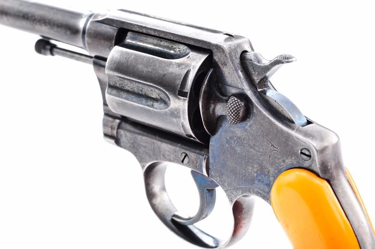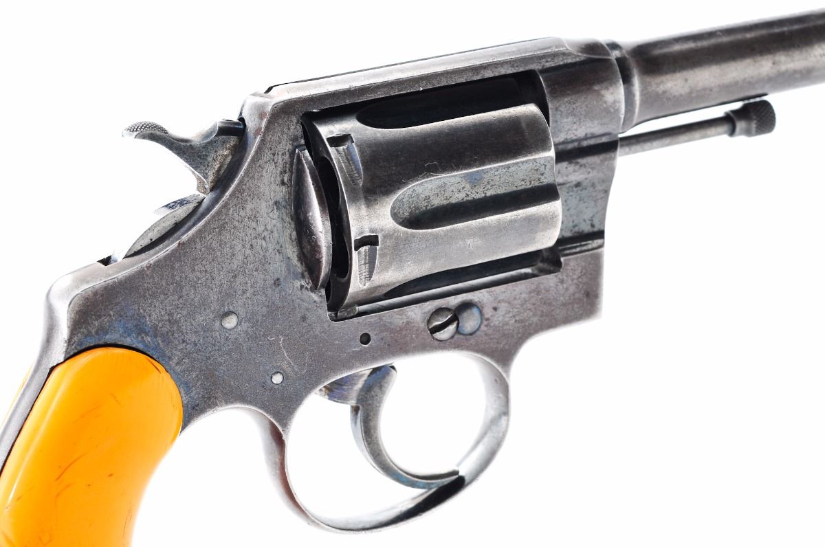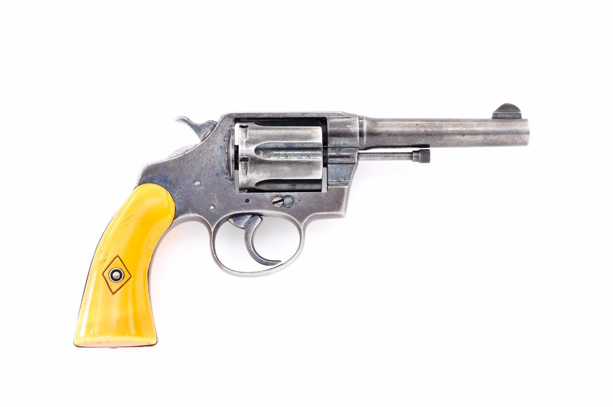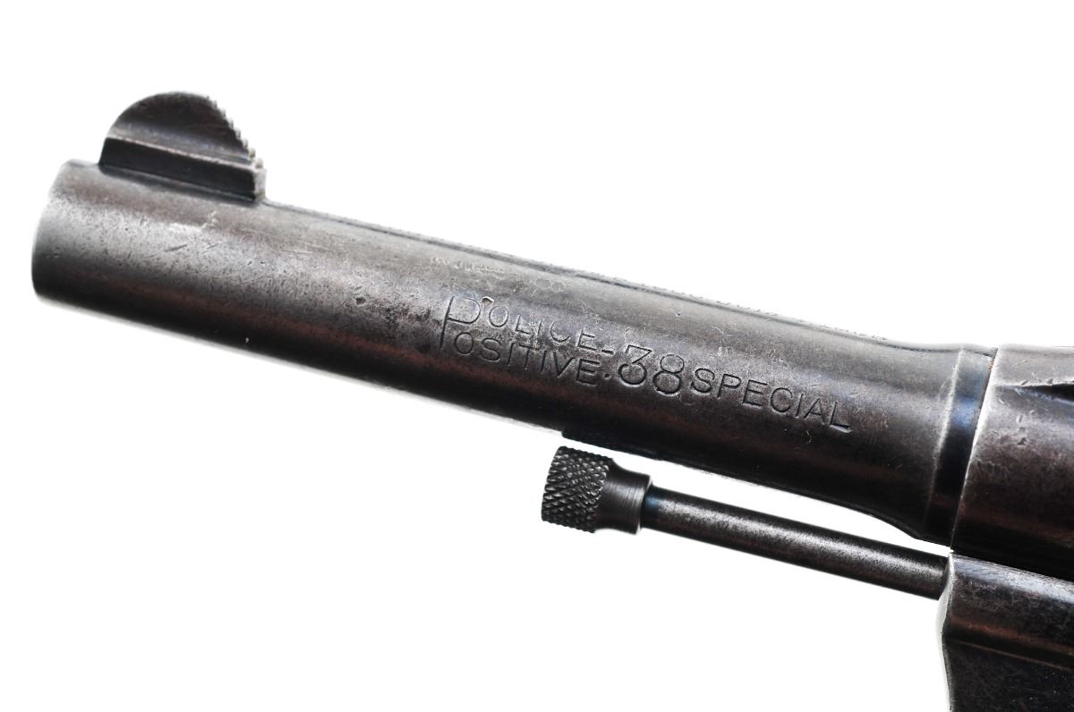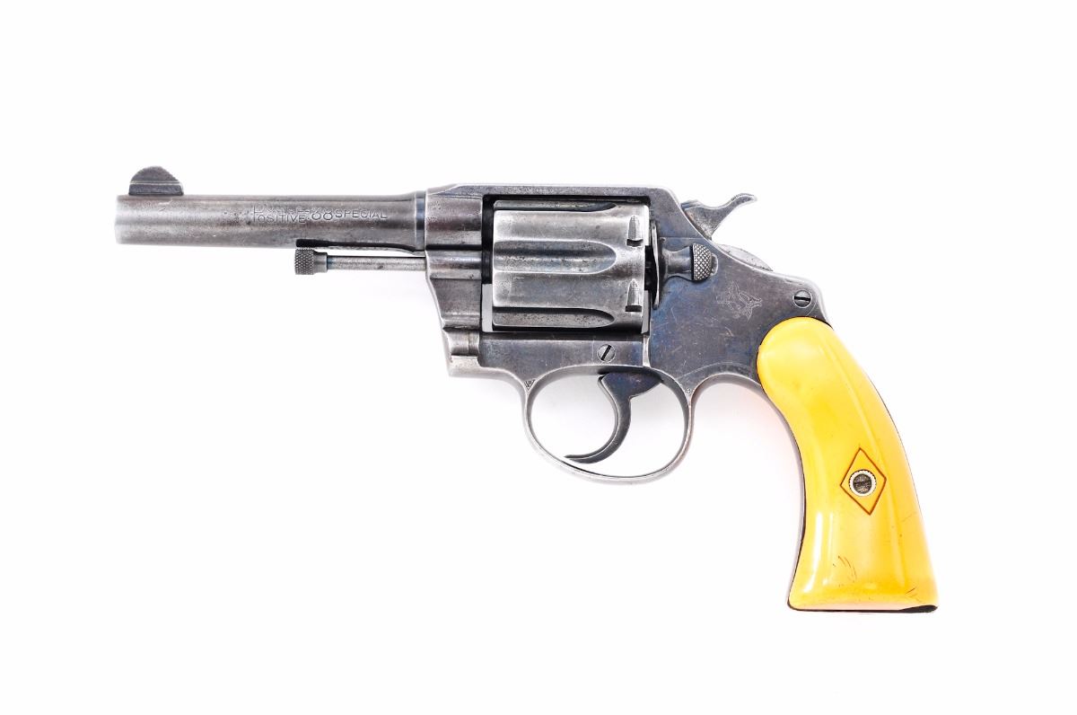 Colt Police Positive Special Double Action Revolver, #29252, .38 Spec. cal. 6-shot, 4'' barrel, blue finish, brown bakelite/Catalin grips, with ramped aerated front sight and fixed service type rear sight. Mfg'd approx. 1910. Condition is good retaining approx. 50% original blue with remainder bright or patinaed. Bore is dark with pitting, chambers are rough. Grip frame is drilled for lanyard ring which is missing. Grips have one chip missing from the left side locating pin. Action is tight, bore is dark. Est.: $150-$300 (C&R/PPT)