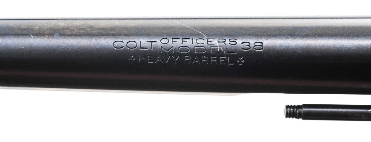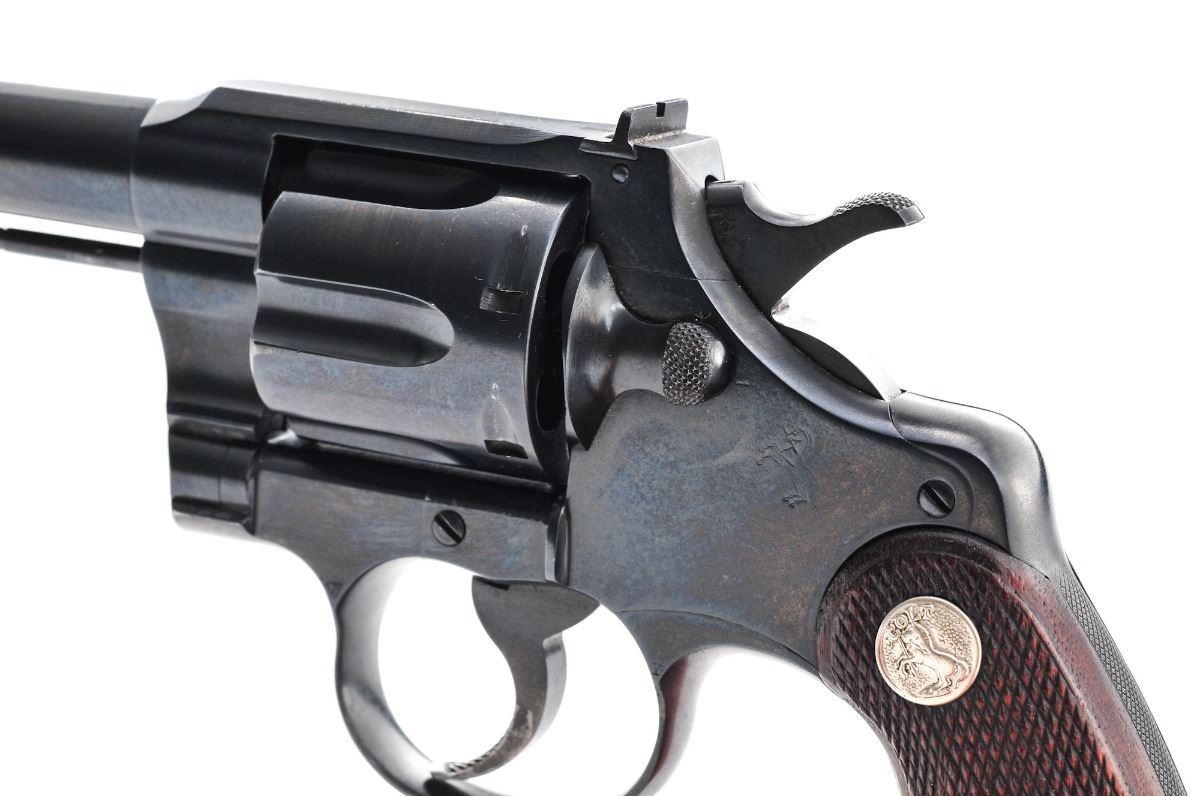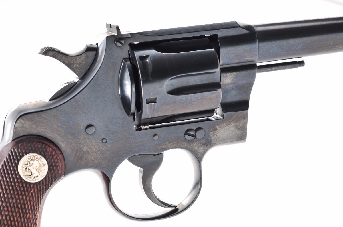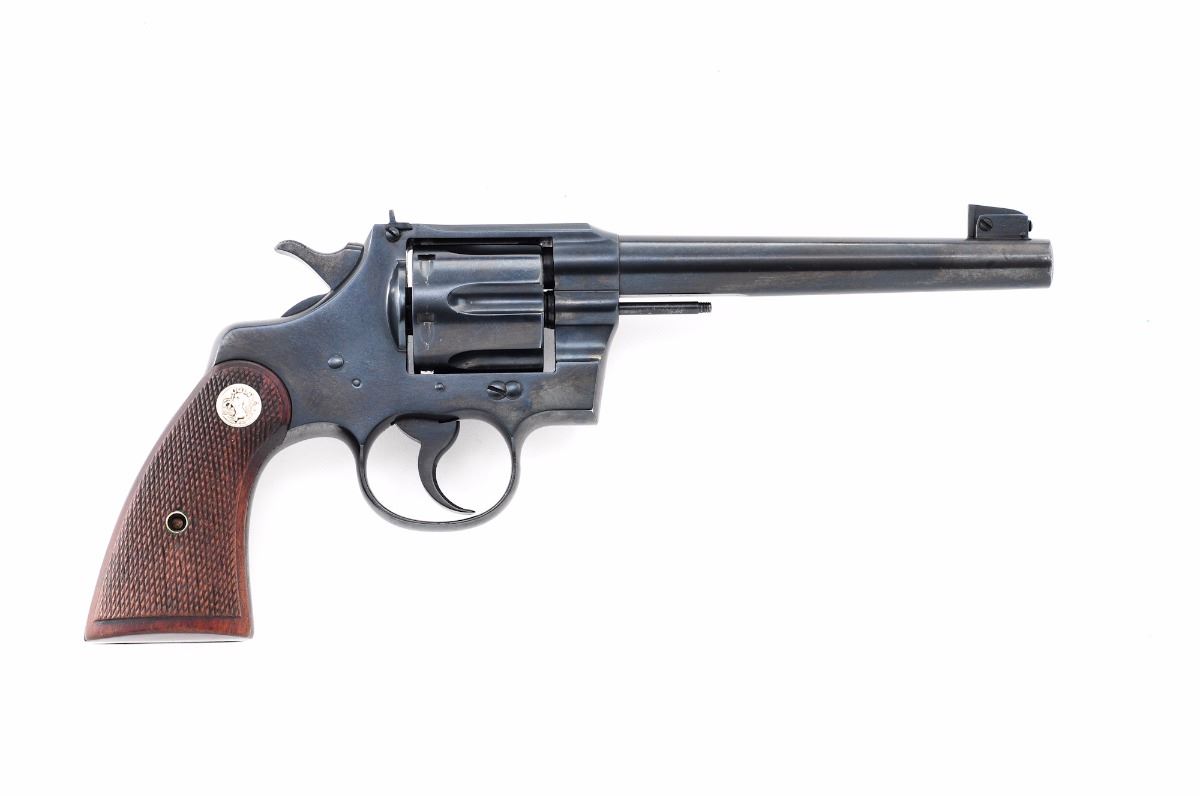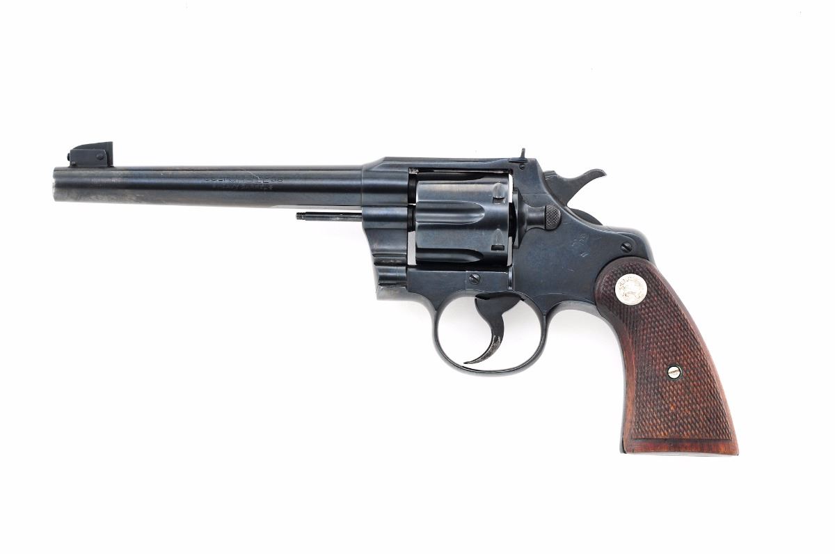 Colt Officer's Model Double Action Revolver, #656333, .38 Spec. cal., 6'' barrel, blue finish, factory checkered walnut service style grips, with Patridge front sight and drift adjustable rear sight. Barrel marked Colt Officer's Model .38/Heavy Barrel. Mfg'd 1941. Condition is excellent as lightly buffed and reblued. Bore and chambers are excellent with bright strong rifling. Walnut service style grips are in very good condition with light wear and oil filling in the checkering. Action is tight with excellent lock-up and timing. Missing the ejector rod head. A good shootable example of a pre war Colt. Est.: $500-$700 (C&R/PPT)