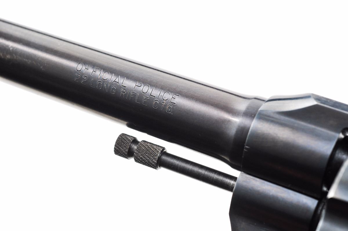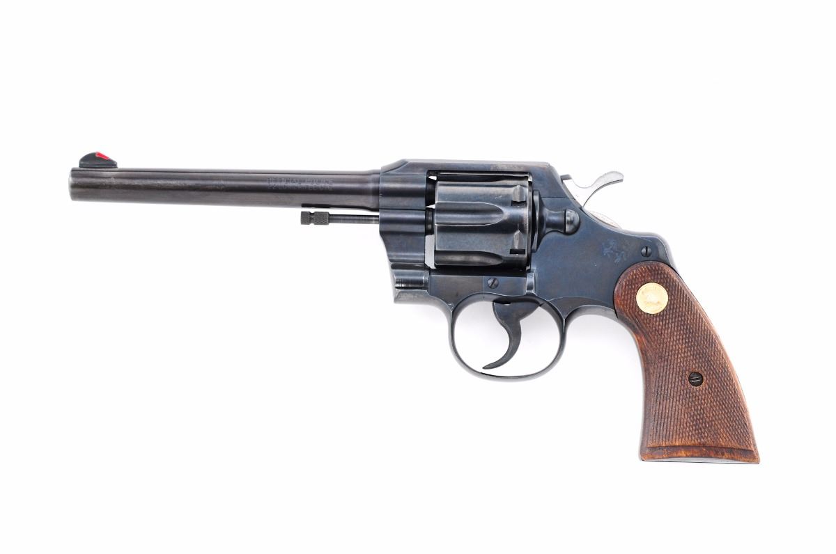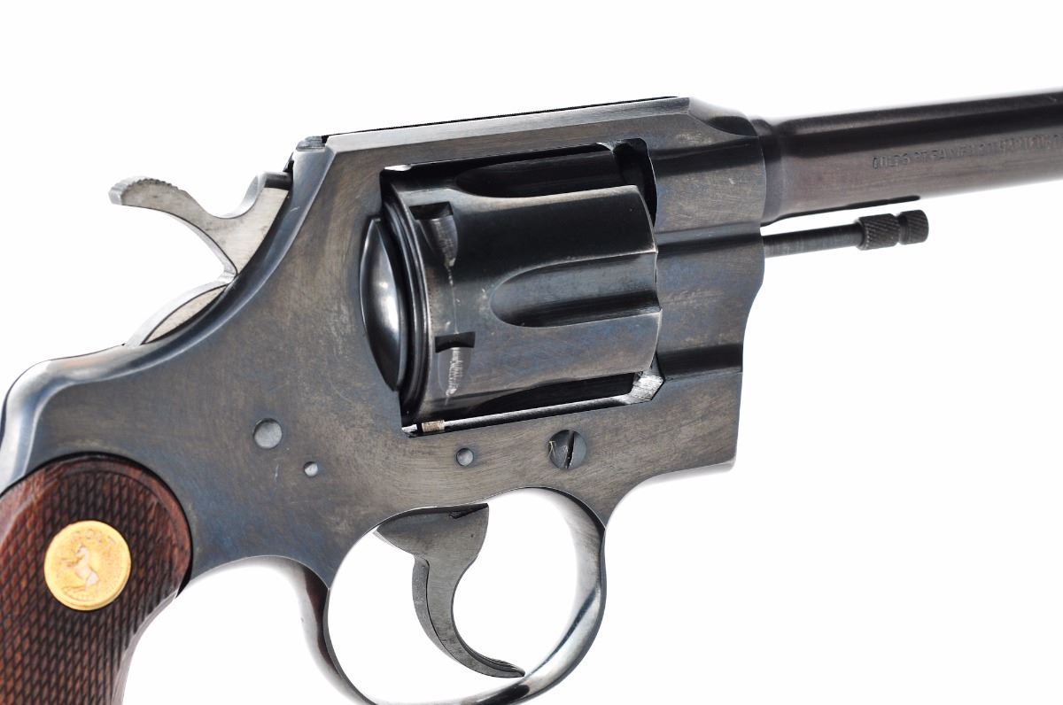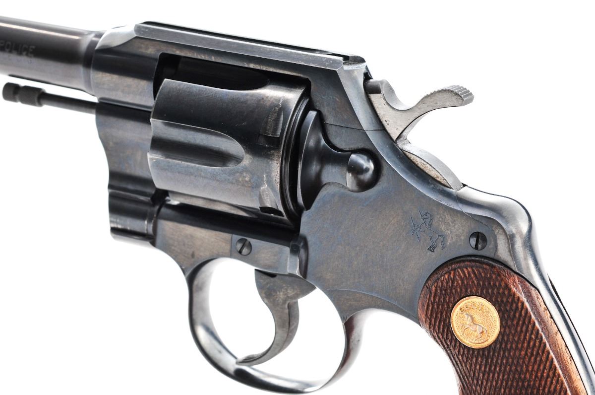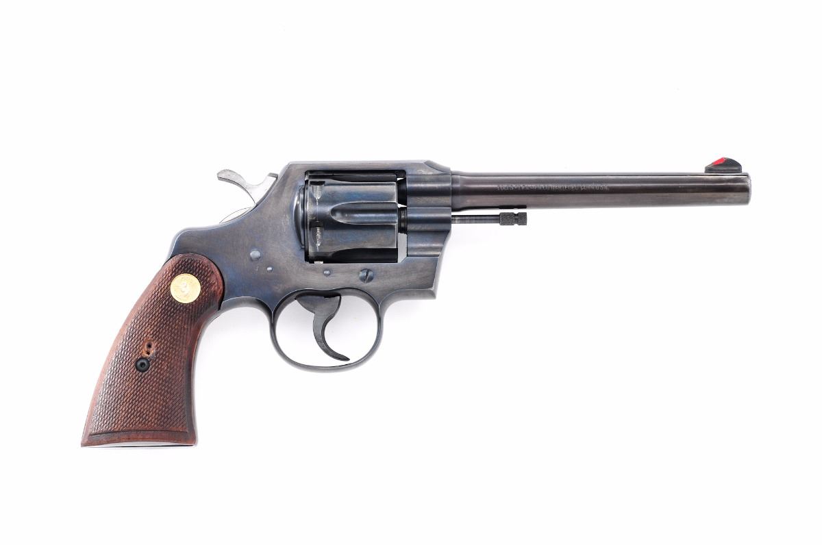 Colt Official Police Double Action Revolver, #40745, .22 LR cal., 6'' barrel, blue finish, factory checkered walnut grips, marked ''Official Police'' on barrel, with Rampant Colt logo on right side of frame, fixed sights with aftermarket red ramp insert in front. Mfg'd 1956. Condition is fine retaining approx. 99% of its original blue finish with little evidence of use, and only slight micro-scratching to the smooth rear grip strap and right side of frame. Grips show slight flattening to the checkers, and right grip panel has a pin hole where it appears to have had some sort of adornment attached at some time. Action is tight and bore is bright. Est.: $600-$900. (C&R/PPT)