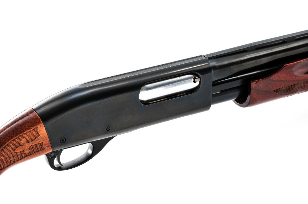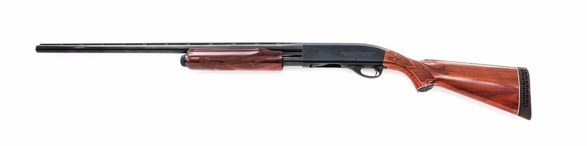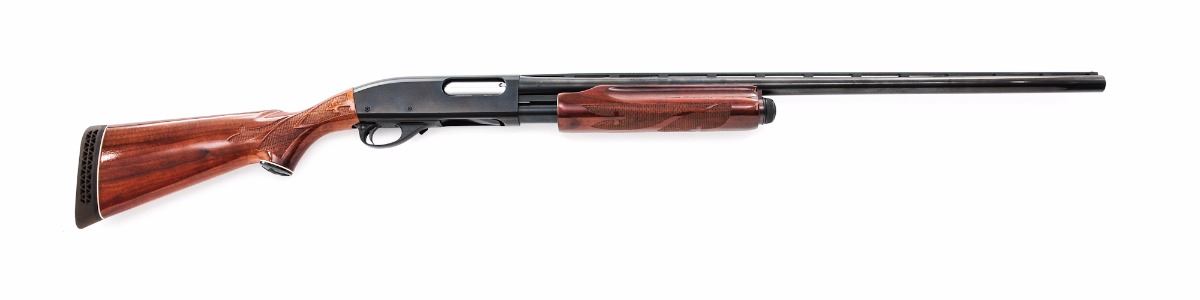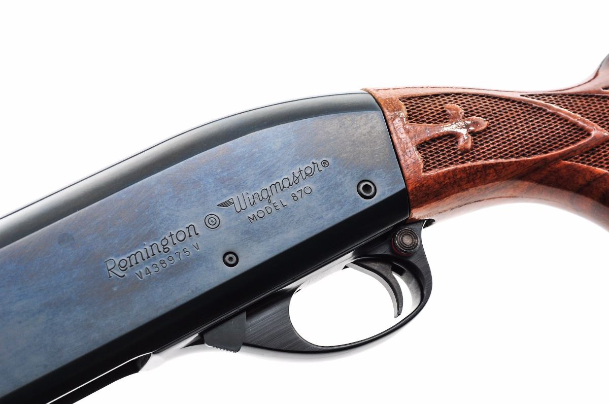 Remington Wingmaster Model 870 Slide Action Shotgun, #V438975V, 12 ga., 2-3/4'' ch., blue finish, 28'' barrel with matted 5/16'' ventilated rib, front steel bead and Modified choke; receiver has a triggerguard mounted push-button safety; pistol-grip hardwood stock and handle have a gloss finish with pressed checkering. Length of pull is 13-7/8'' over a 1'' black Remington recoil pad; weight is 7-3/8 lbs. Mfg'd ca. 1980. Condition is excellent, appearing to have been used a few times, with a lightly fouled bright bore, a few cycling scuffs and small handling marks. Est.: $300-$500. (Modern)