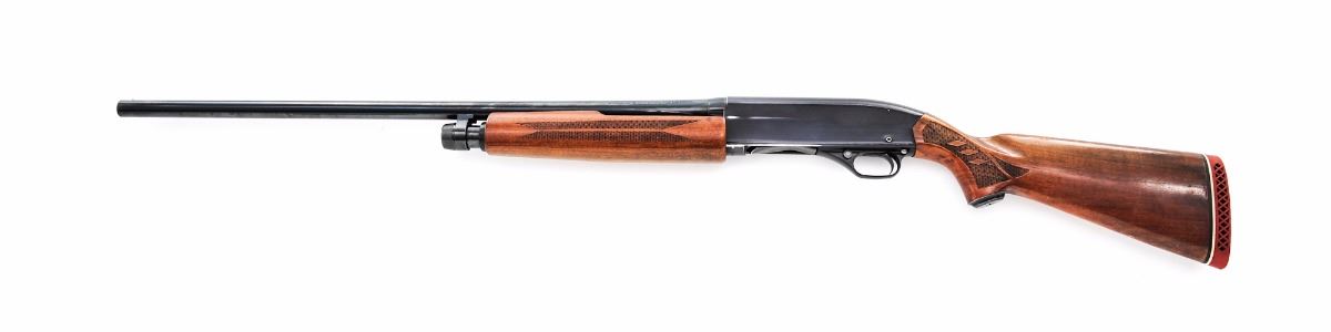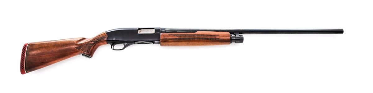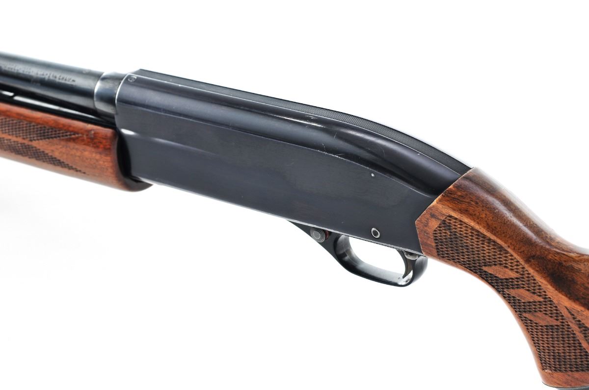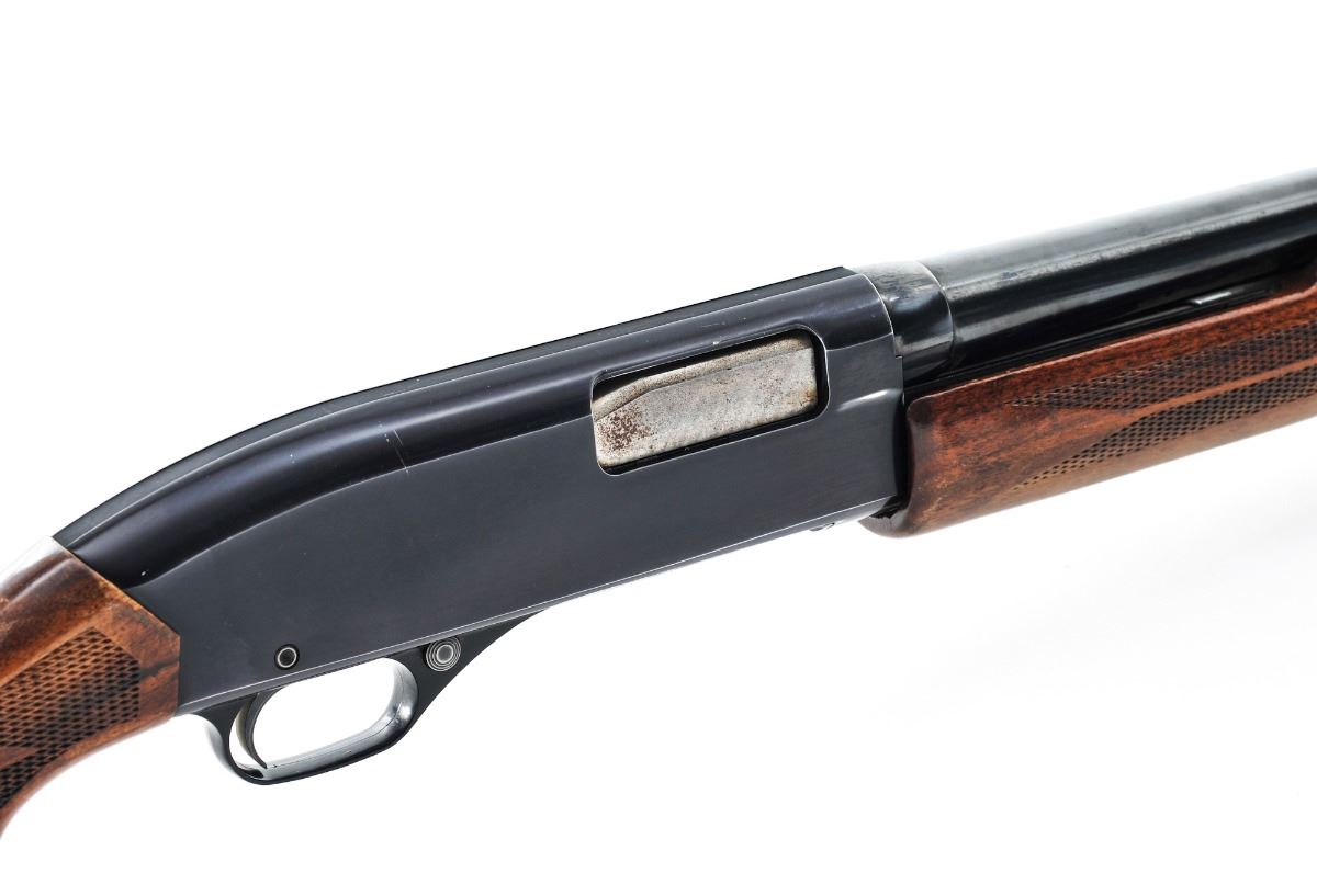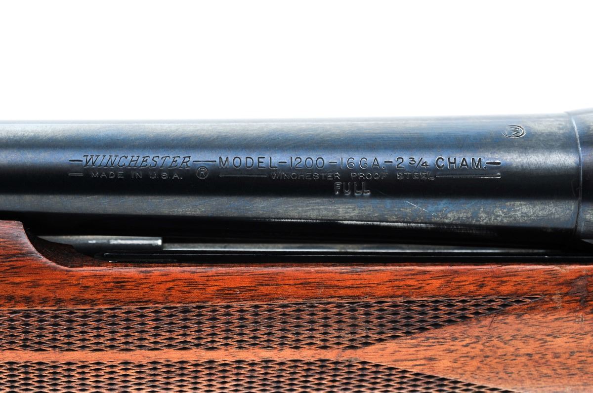 Winchester Model 1200 Pump Action Shotgun, #120117, 16 ga. chambered for 2-3/4'' shells, Full choke, 28'' barrel, blue finish, pressed checkered walnut stock and forend, with red rubber Winchester recoil pad and silver bead front sight. Condition is very good. Metal surfaces retain approx. 90%-92% blue with general marks from handling and high edgewear. Stock with thinning and flaking to the finish, scuffs and scratches, mainly in the handling areas. Action is tight, bore is excellent. Est.: $200-$350. (C&R)