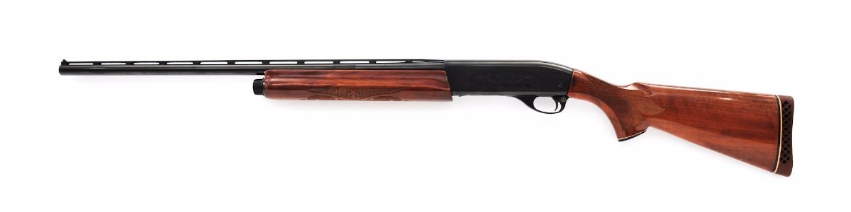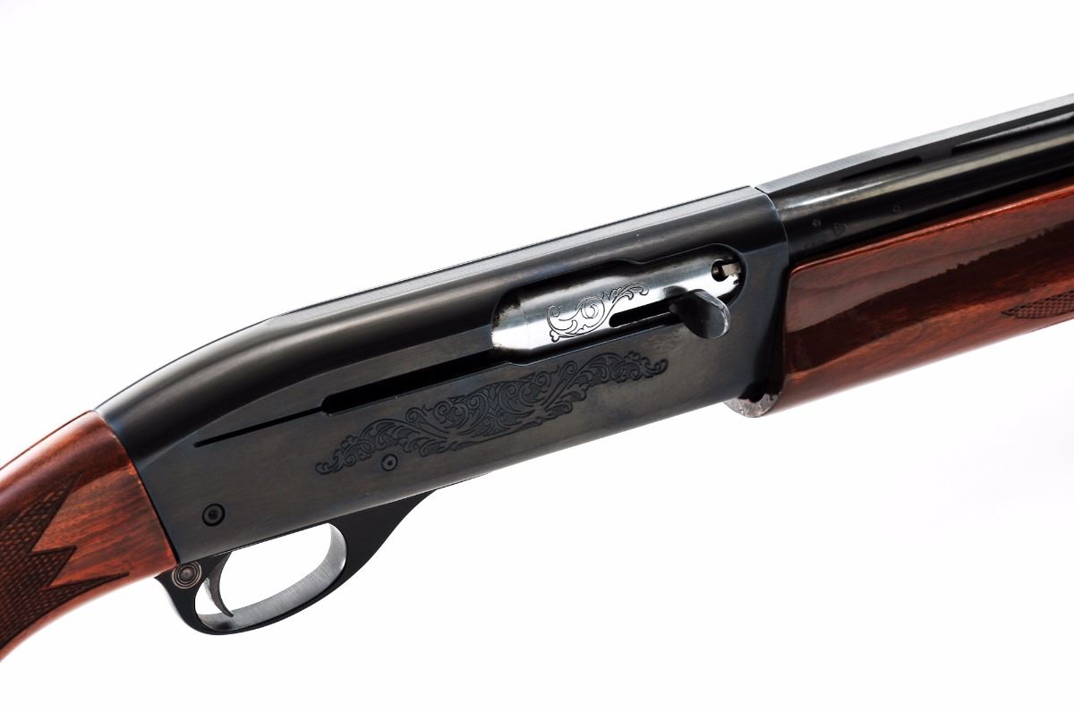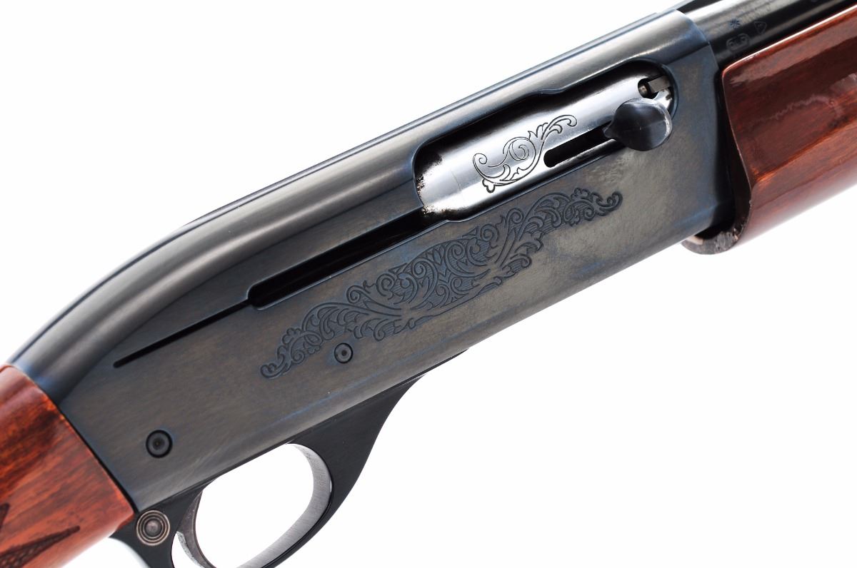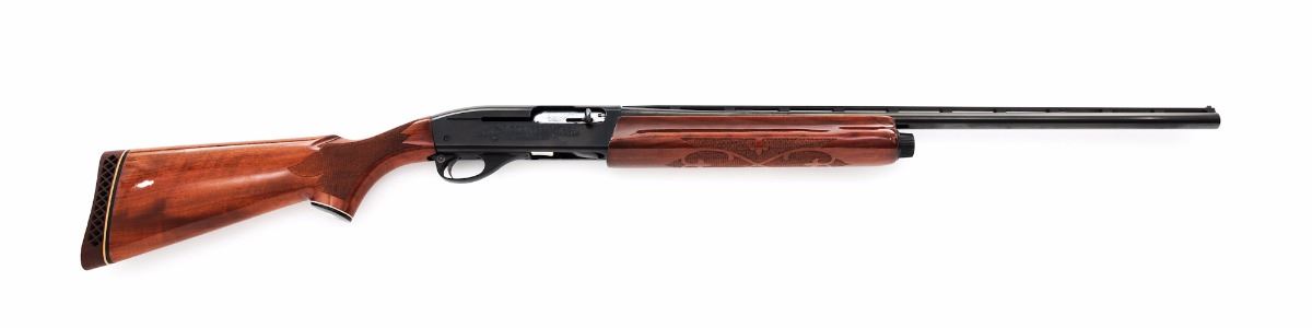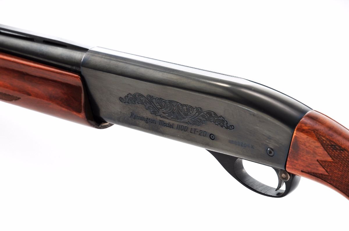 Remington Model 1100 LT-20 Semi-Automatic Shotgun, #N911204K, 20 ga., 2-3/4'' ch., blue finish, 25'' barrel with matted 5/16'' ventilated rib, front and middle white beads and Full choke; receiver has an impressed scroll design with triggerguard mounted push-button safety; pistol-grip walnut stock and forearm have a gloss finish with 14-3/4'' length of pull over a 1'' brown Pachmayr recoil pad; weight is 7-1/8 lbs. Mfg'd ca. 1981. Overall condition is very good with indications of moderate use and powder residue in the bore. Blue finish is 98% with small scratches and light freckling. Buttstock is from a different Remington shotgun and has scuffs in the finish from shaping the added recoil pad. Est.: $350-$500. (Modern)