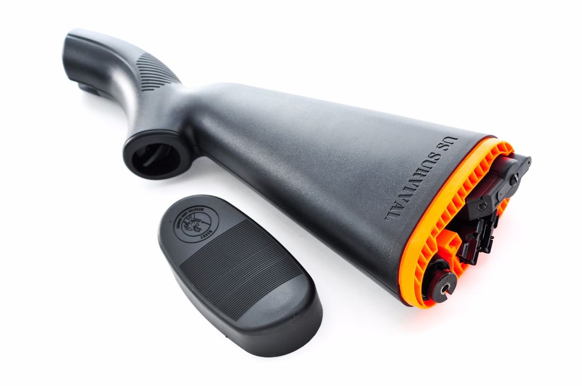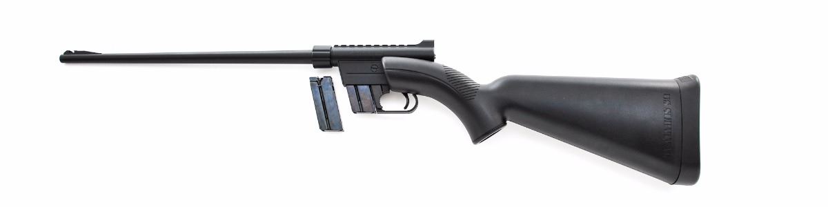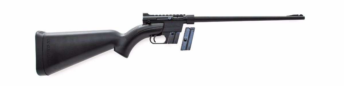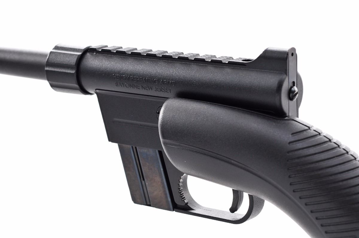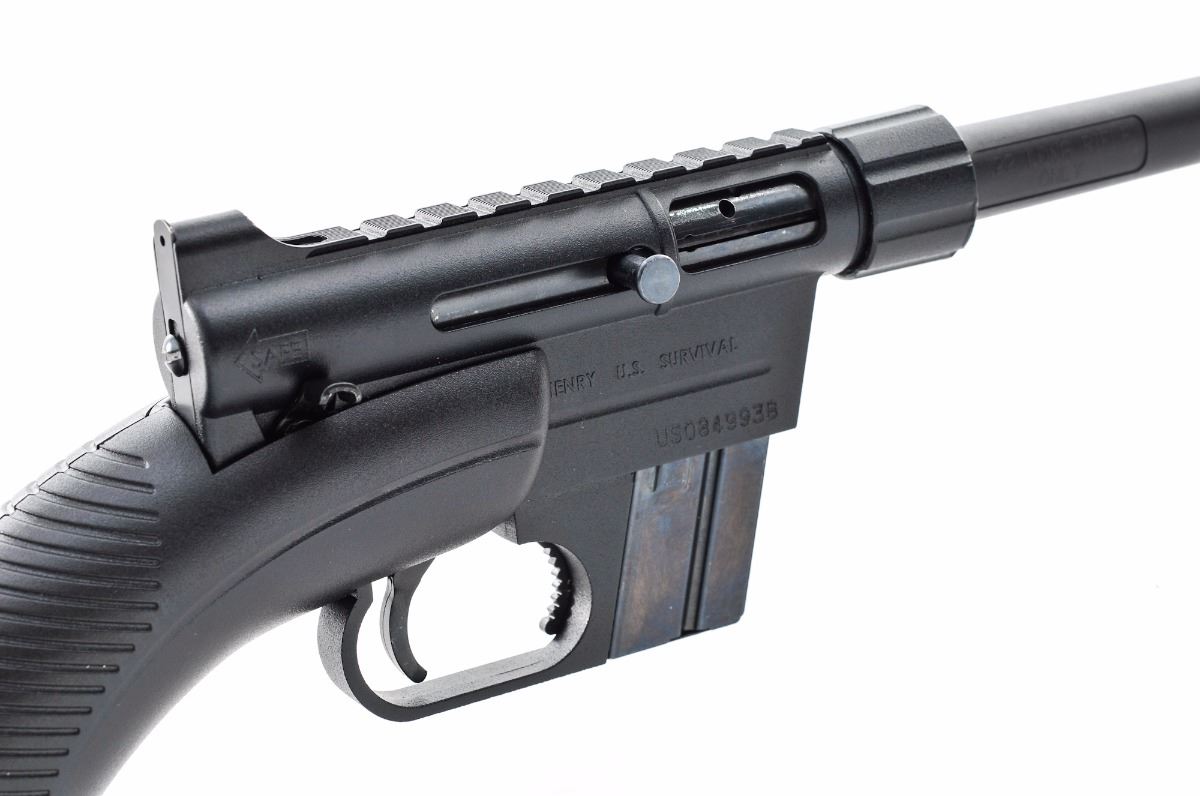 Henry U.S. Survival Rifle, #US084993B, .22 LR cal., 16'' barrel, matte black finish, black plastic ABS stock, with one magazine. Takedown design, barrel and receiver can be stored in the stock. Condition is excellent, appearing as new, showing only light use. Missing front sight blade. Est.: $175-$275. (Modern)