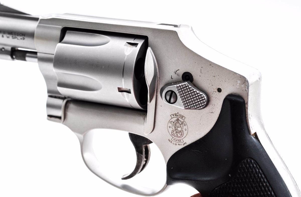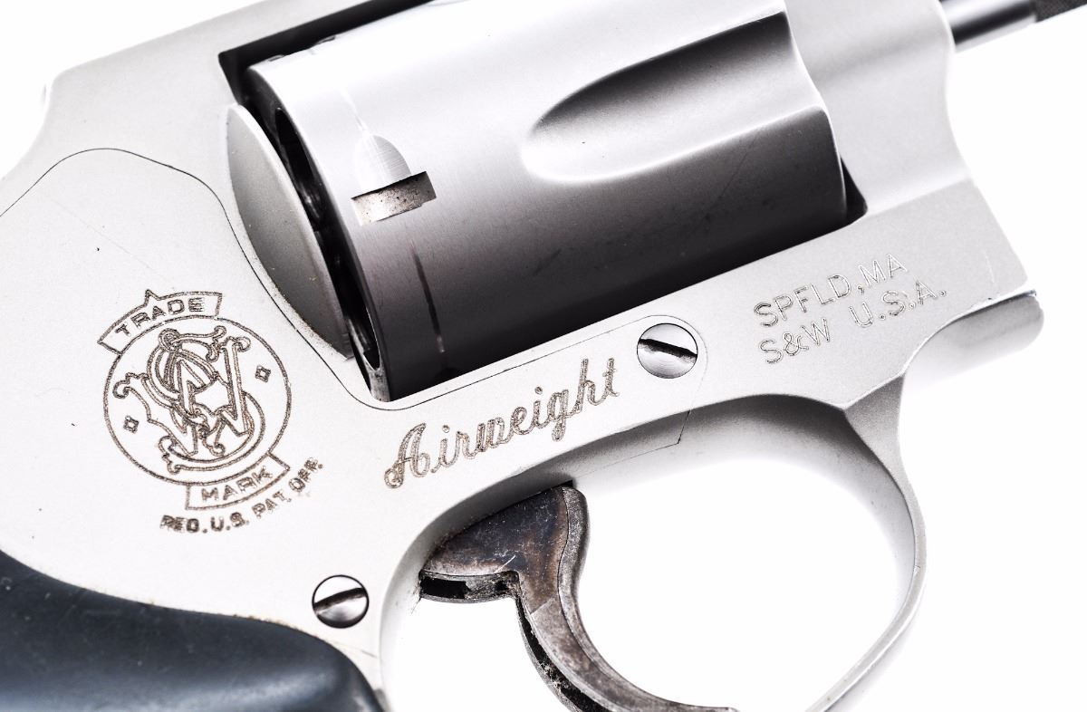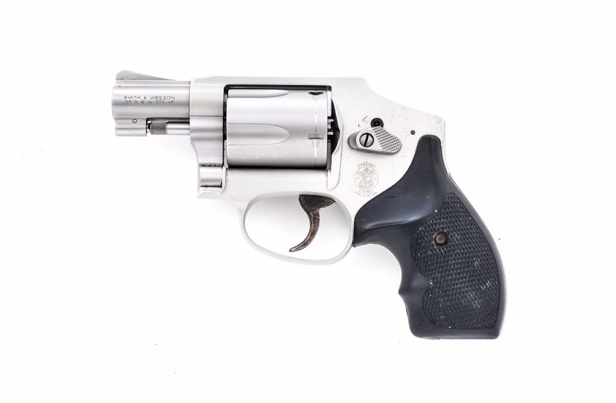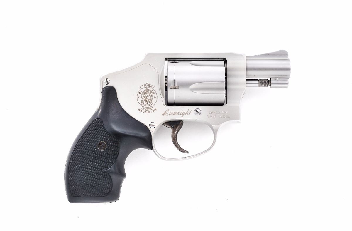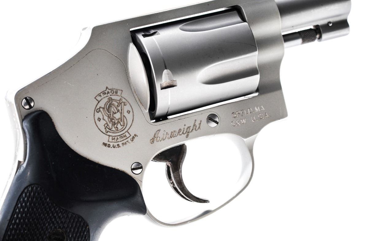 Smith & Wesson Model 642-2 Airweight ''Centennial'' Double Action Revolver, #CHR6623, .38 Spec.+P cal., 1-7/8'' barrel, alloy frame, stainless steel barrel and cylinder, checkered black hard rubber grips, case hardened trigger, with standard sights. Condition is very good showing general moderate wear with a substantial amount being to the back grip strap. Grips with scratches and impressions. Case colored trigger with some darkening. Action is crisp, bore is fine showing normal signs of range use. Est.: $250-$350. (Modern/PPT)