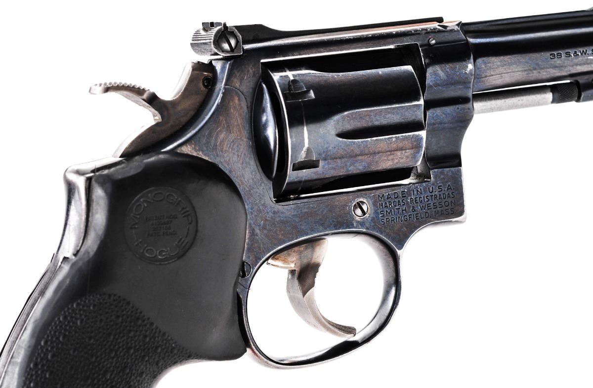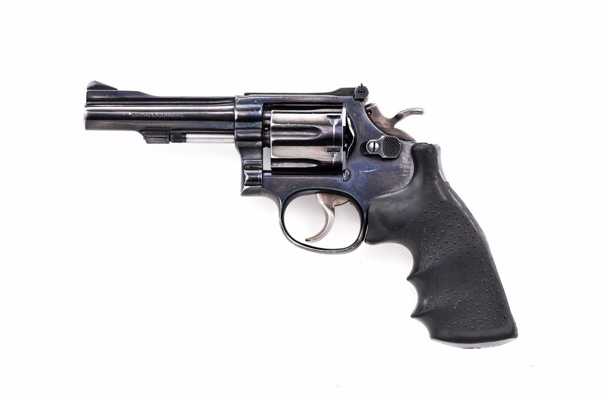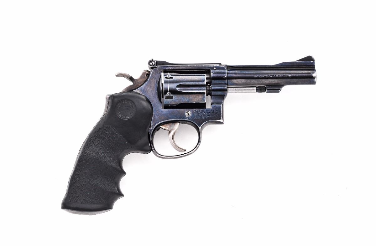 Smith & Wesson Model 15-4 Double Action Revolver, #20K7828, .38 Spec. cal., 4'' barrel, blue finish, Hogue rubber grips, standard adjustable rear sight, with target trigger and target hammer. Condition is very good retaining approx. 85% thinning blue. Grips with mild smoothing. Good action and bore. Est.: $300-$500. (Modern/PPT)
