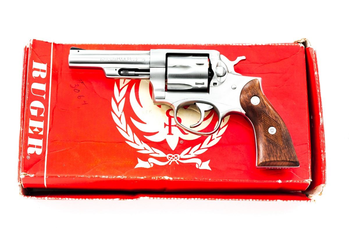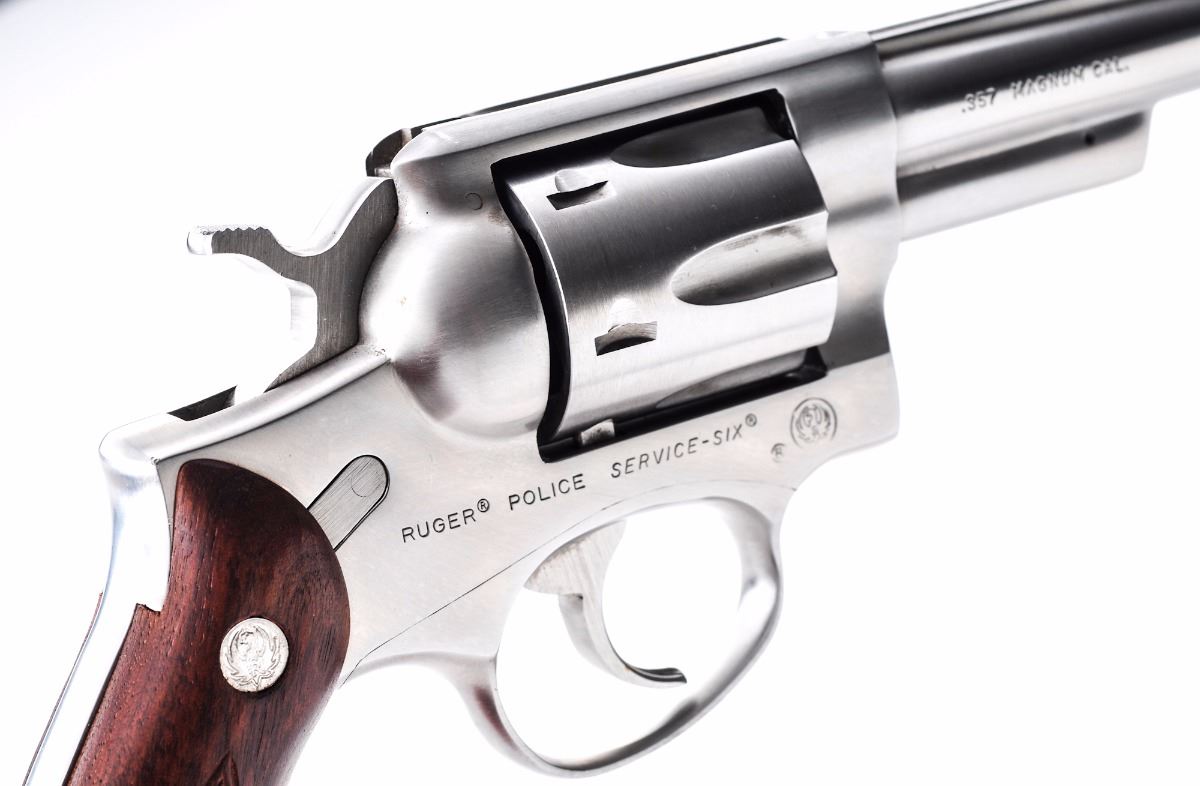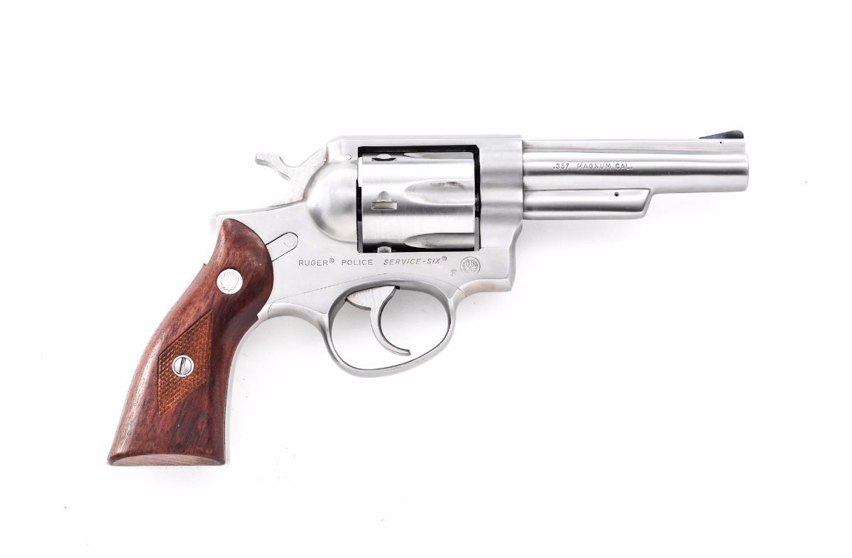 Ruger Police Service-Six Model 107 Double Action Revolver, #151-11780, .357 mag. cal., 4'' barrel, stainless finish, checkered diamond pattern walnut grips with inlaid Ruger medallions, and standard fixed sights. In period red Ruger box with instructions. Condition is fine. Stainless surfaces with mostly fine micro-scratching, including a few more pronounced scratches to right side of frame and barrel. Grips are near excellent with some impressions to the bottom edge. Action and bore are excellent. Box shows substantial damage, but end label remains bright and clear. Est.: $300-$500.