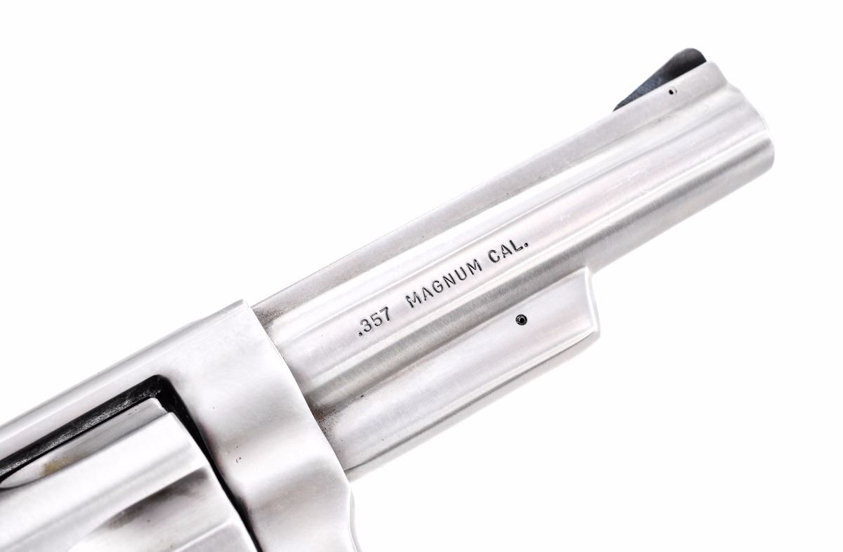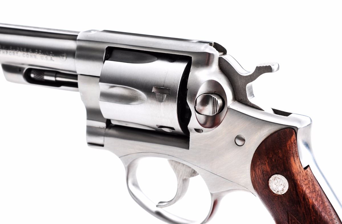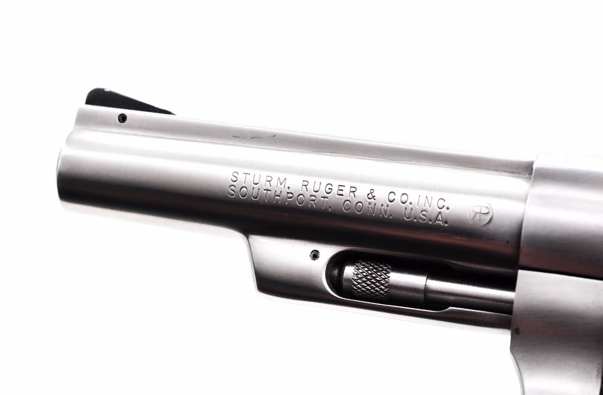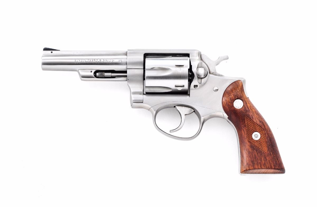 Ruger Police Service-Six Model 107 Double Action Revolver, #151-11780, .357 mag. cal., 4'' barrel, stainless finish, checkered diamond pattern walnut grips with inlaid Ruger medallions, and standard fixed sights. In period red Ruger box with instructions. Condition is fine. Stainless surfaces with mostly fine micro-scratching, including a few more pronounced scratches to right side of frame and barrel. Grips are near excellent with some impressions to the bottom edge. Action and bore are excellent. Box shows substantial damage, but end label remains bright and clear. Est.: $300-$500.