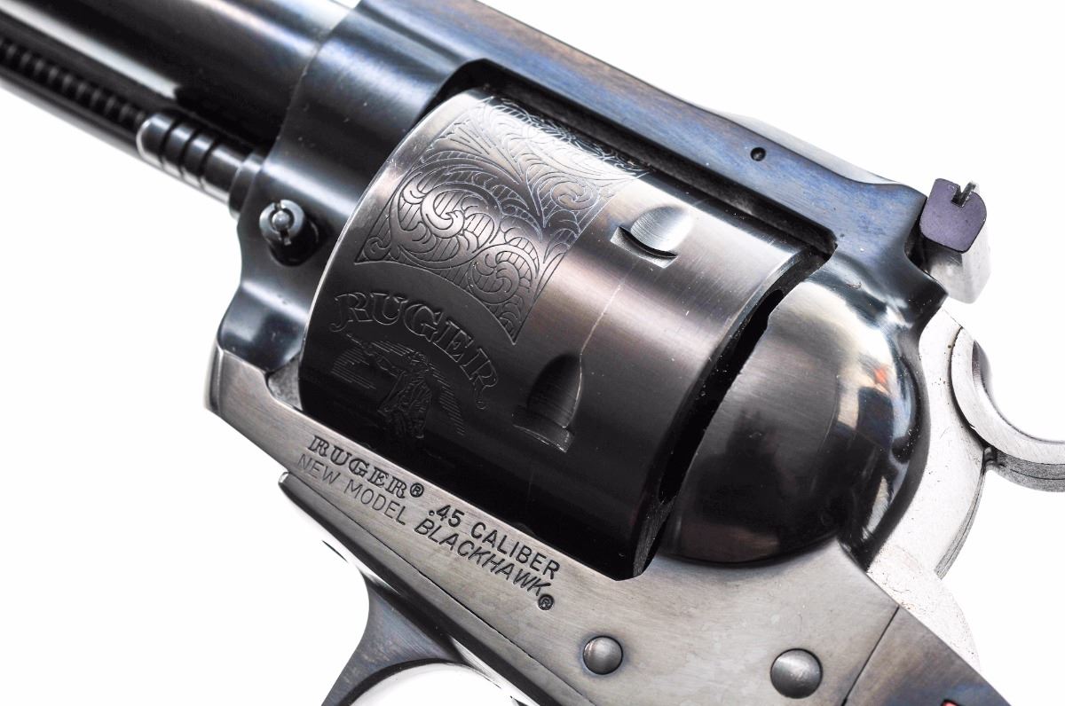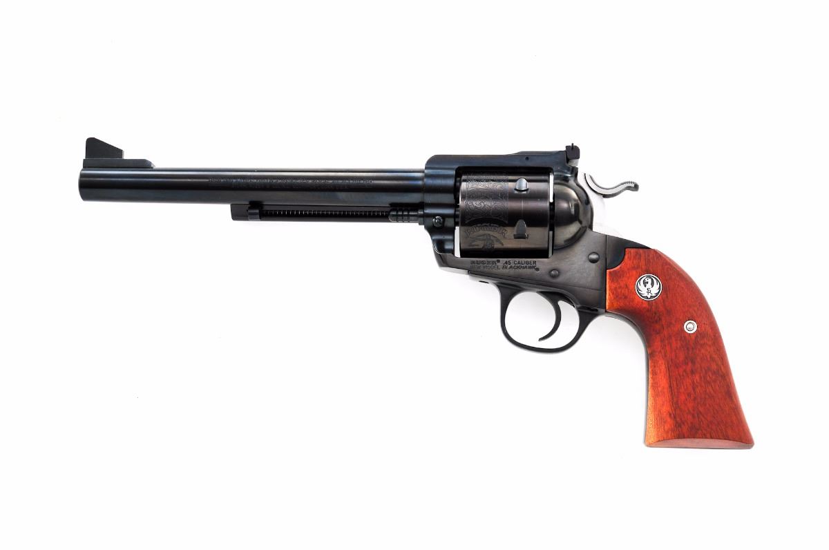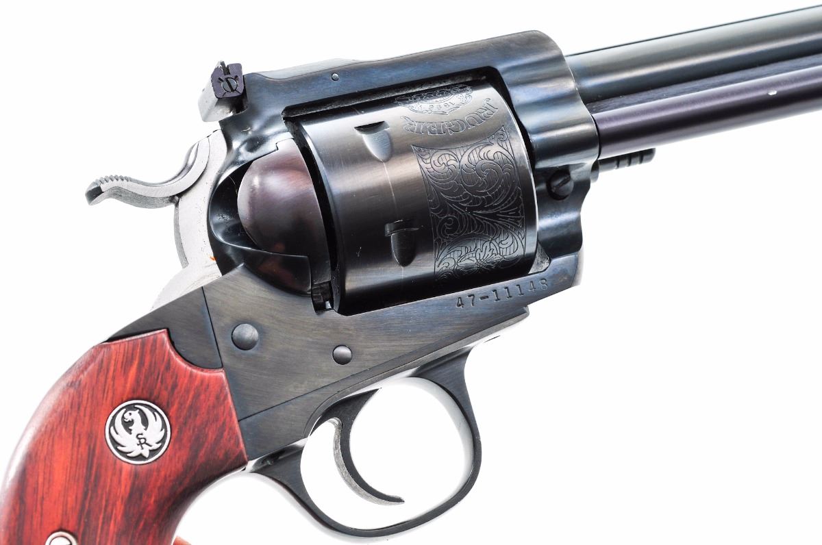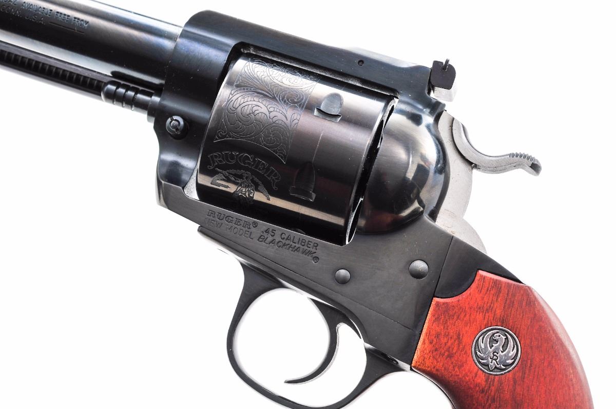 Ruger New Model Blackhawk ''Bisley'' Single Action Revolver, #47-11148, .45 LC cal., 7-1/2'' barrel, dark blue finish, roll engraved cylinder, serrated stainless steel hammer, standard sights, smooth factory two-piece walnut grips with inlaid Ruger medallions. Condition is excellent retaining approx. 98%-99% blue, with a few scattered light marks from handling, small impression to the ejector rod housing, and light dragline. Grips show only minor wear. Action is crisp, bore is bright. Est.: $400-$600. (Modern/PPT)