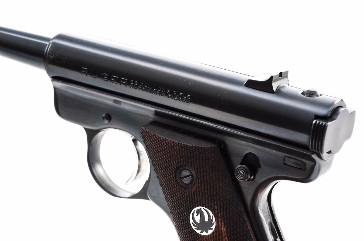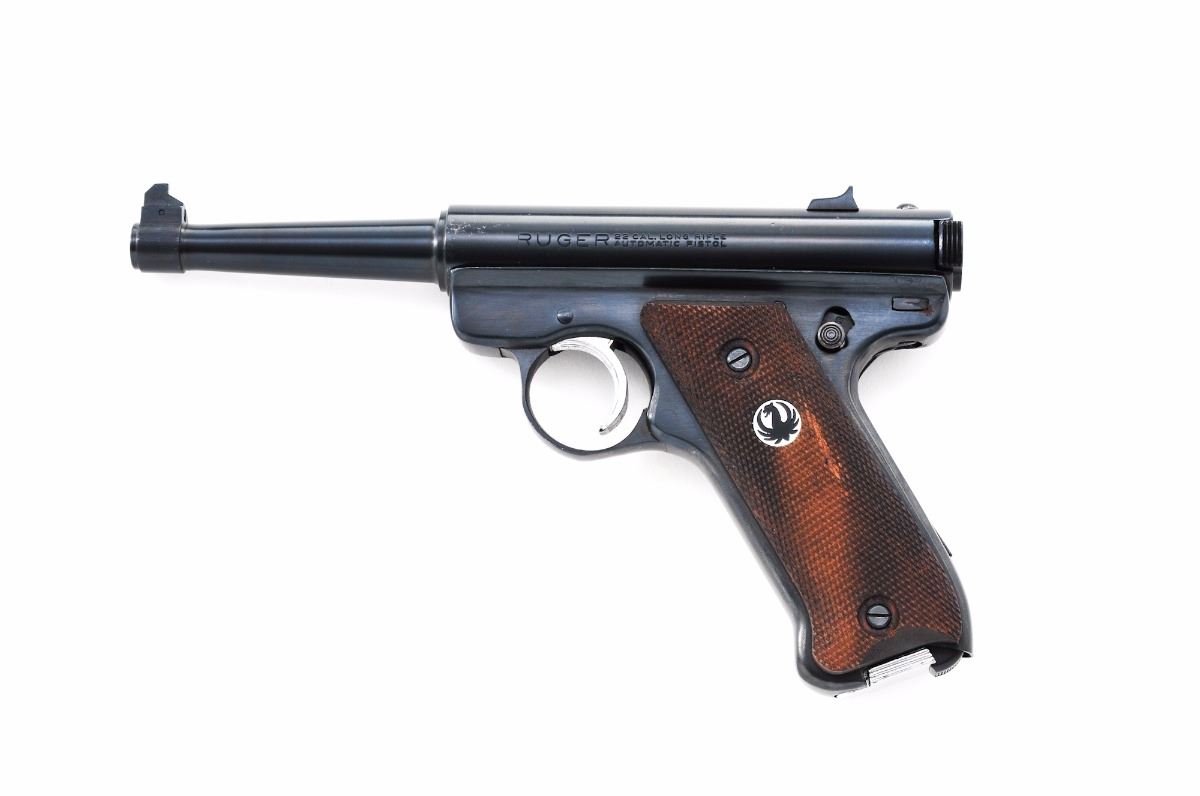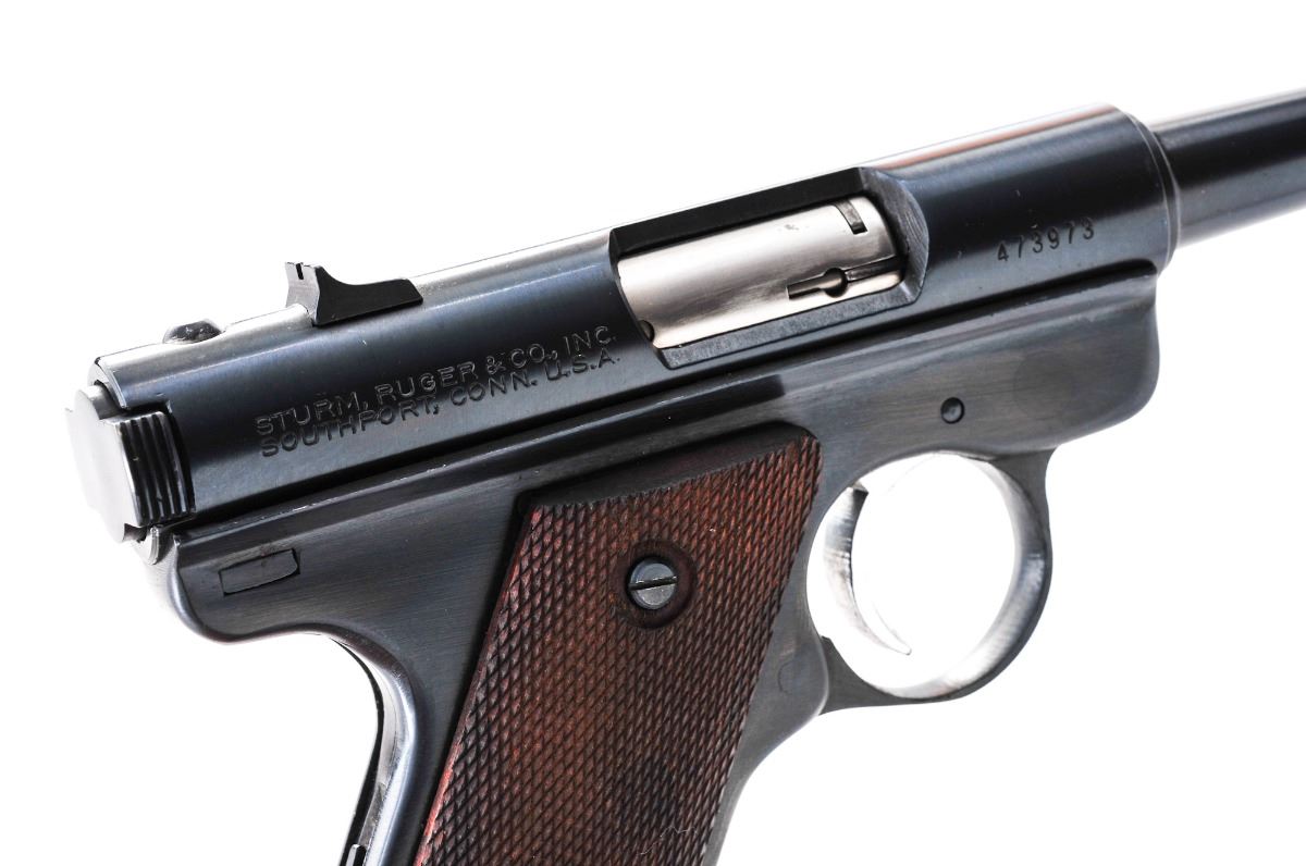 Late 60's Ruger MK I Semi-Automatic Pistol, #473973, .22 LR cal., 4-3/4'' tapered barrel, dark blue finish, factory checkered two-piece hardwood grips with inlaid Ruger medallion to left grip panel, serrated bright plated trigger, fixed blade front sight, notched rear sight, with one magazine. Mfg'd 1968. Condition is fine retaining approx. 97% blue overall with general light marks from handling, and one small patch of fine corrosion to left side of frame near barrel. Grips with some mild flattening to checkering, including one pronounced scratch to left grip near medallion. Action and bore are excellent. Est.: $300-$500. (Modern/PPT)