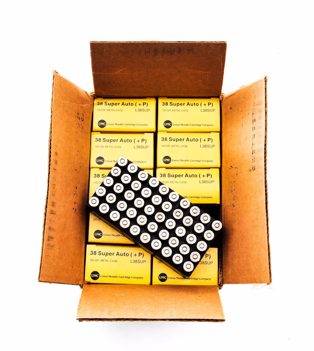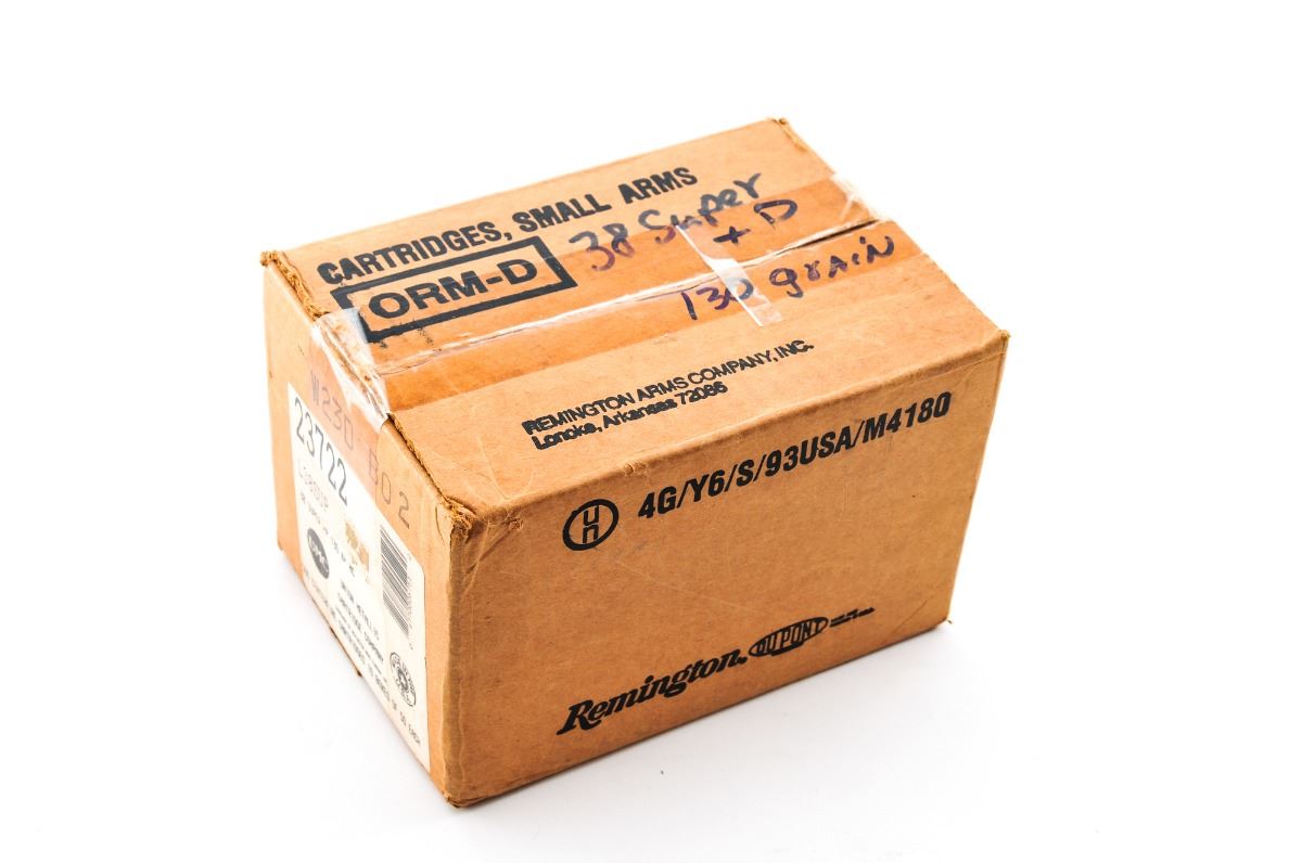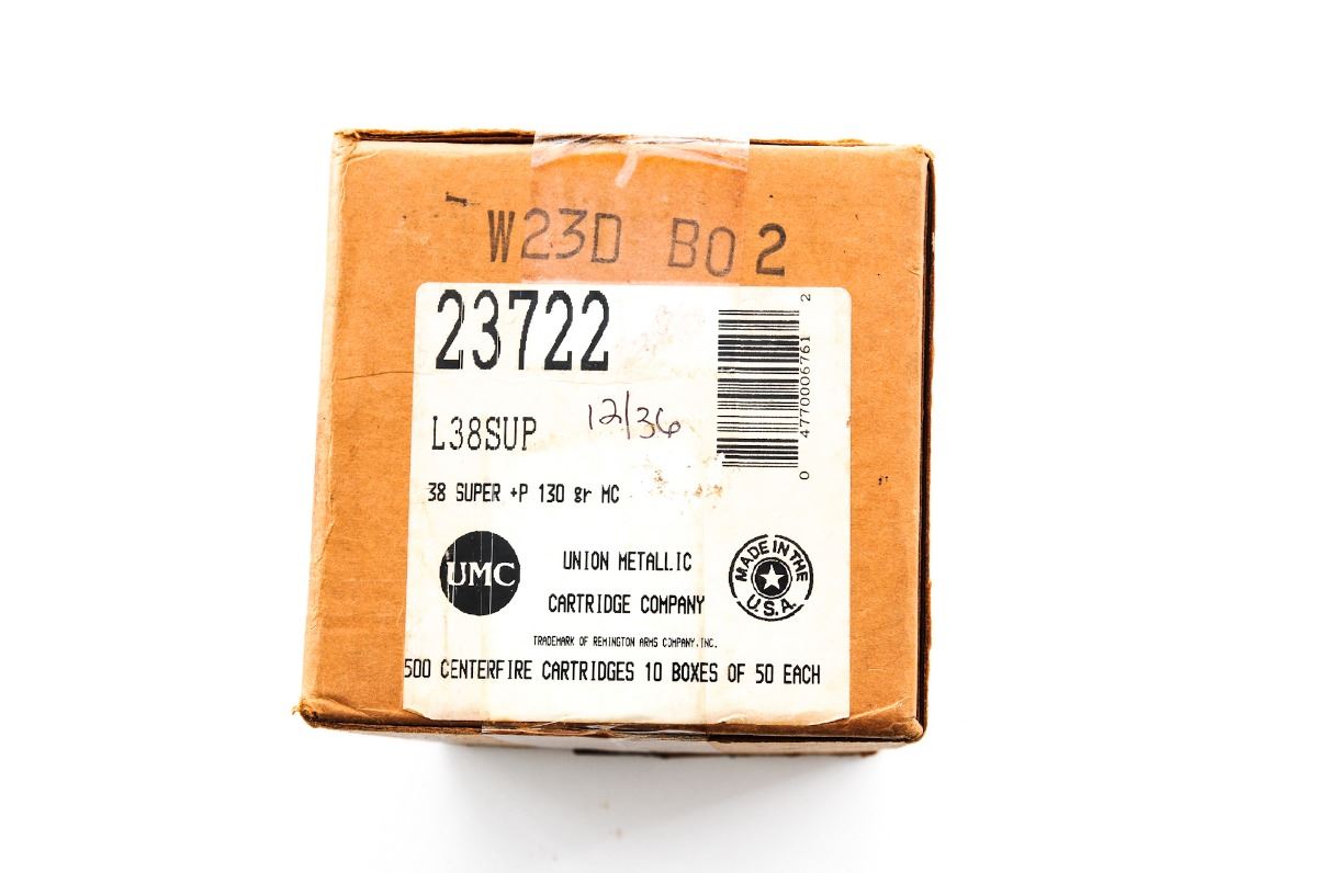 Ammo Lot: 500 Round Case of Remington-UMC .38 Super +P 130-grain Cartridges. Mfg. Part No. L38SUP. Contains ten (10) 50-round boxes. Condition is excellent and as new, sealed in original shipping box. Est.: $150-$250.
