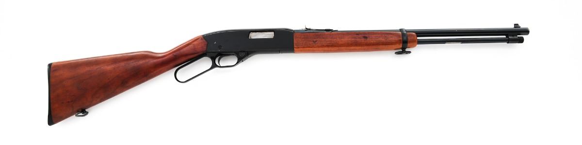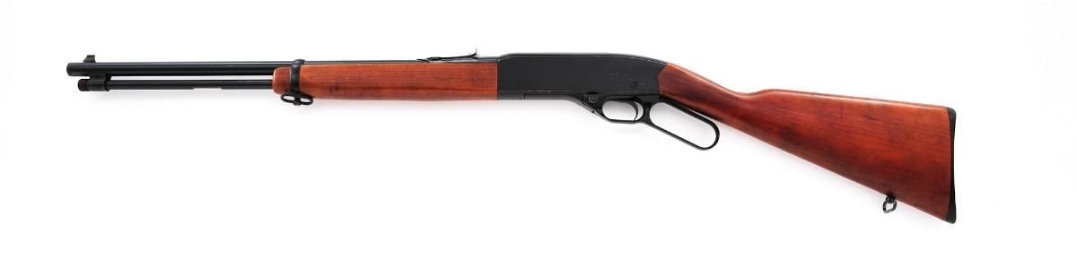 Winchester Model 150 Lever Action Rifle, #545010, .22 S-L-LR cal., 20'' blue barrel, black receiver, smooth straight hardwood stock and forend, silver bead front sight, notched rear sight with handmade replacement elevator, factory black plastic Winchester buttplate, and sling swivels. Condition is good retaining approx. 90% blue/black finish with general moderate scratches, as well as scattered fine surface rust to the barrel and a few larger patches near the muzzle. Stock with overall light to moderate scuffs and impressions. Action is crisp, bore is excellent. Est.: $125-$250. (Modern)