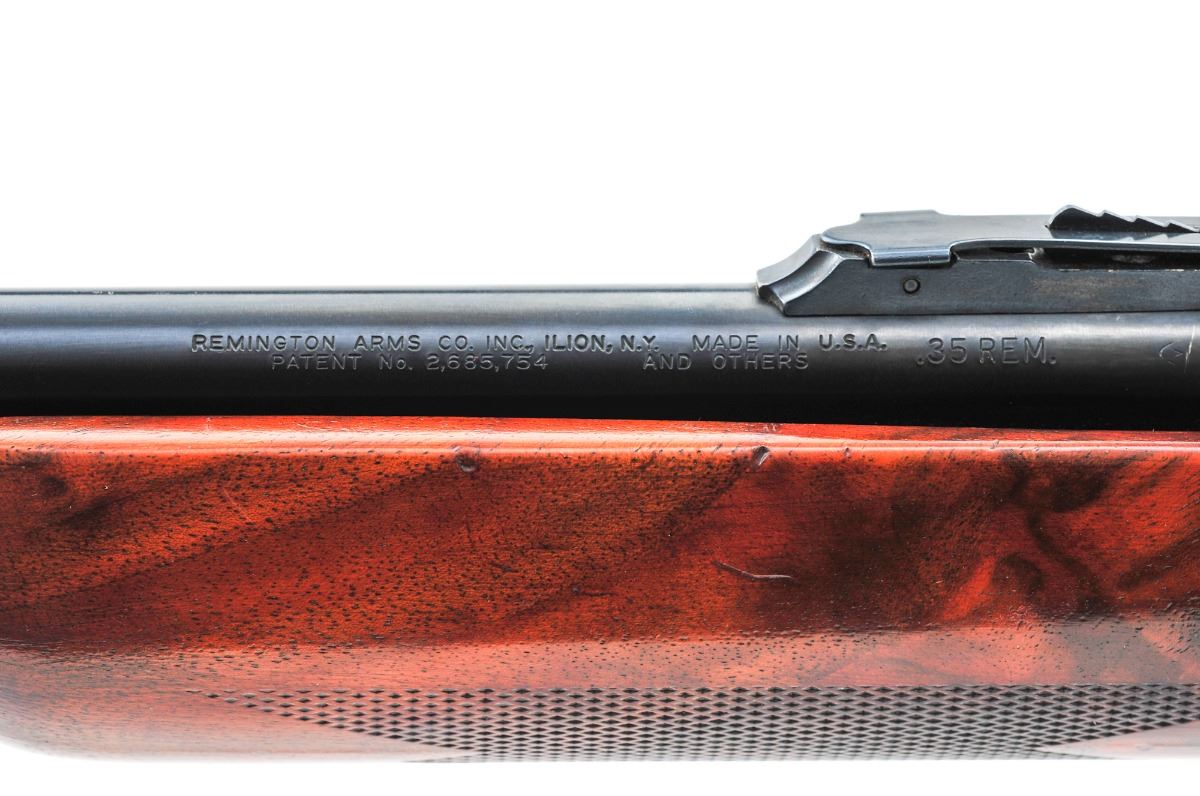Remington Model 760 Gamemaster Pump Action Rifle, #421834, .35 Rem. cal., 22'' barrel, blue finish, press checkered walnut stock and forend, factory checkered steel Remington buttplate, brass bead front sight, notched rear sight with elevator, and one magazine. Top of receiver is tapped for scope base. Condition is near fine retaining approx. 96% blue with wear to the high edges, as well as small amounts of scattered light surface rust that should easily clean. Stock and forend with normal light marks from handling. Buttstock appears to have been lightly sanded with an additional coat of varnish. Action and bore are excellent. Est.: $300-$450. (Modern)
