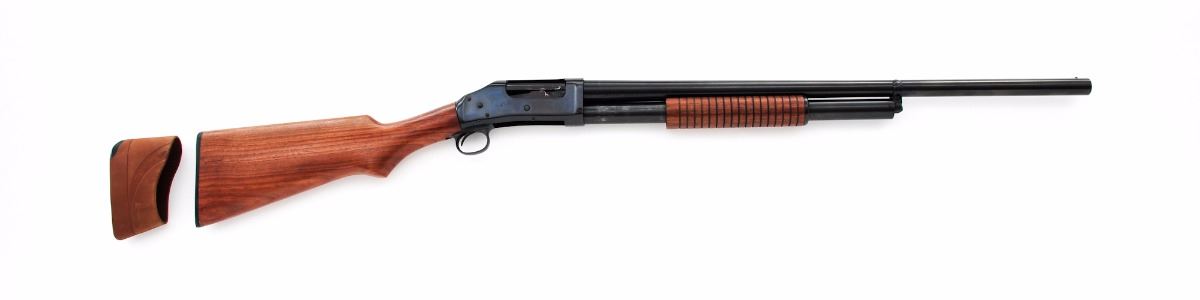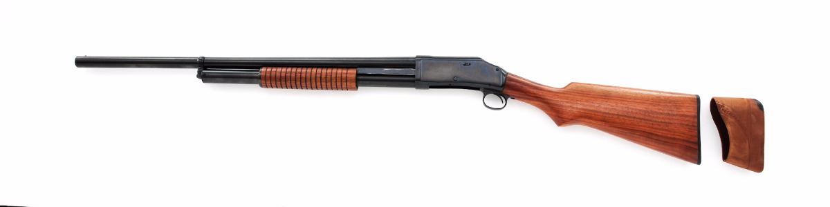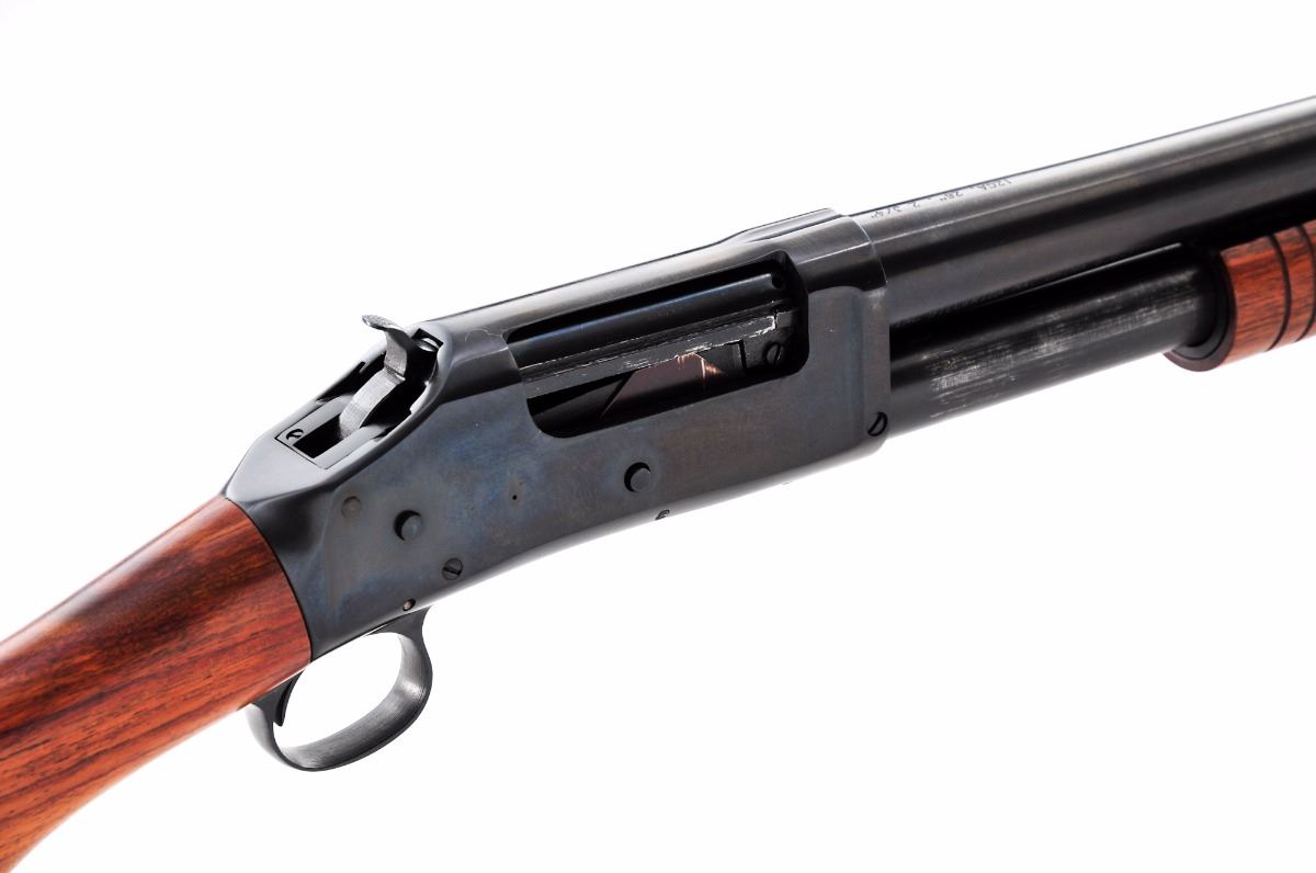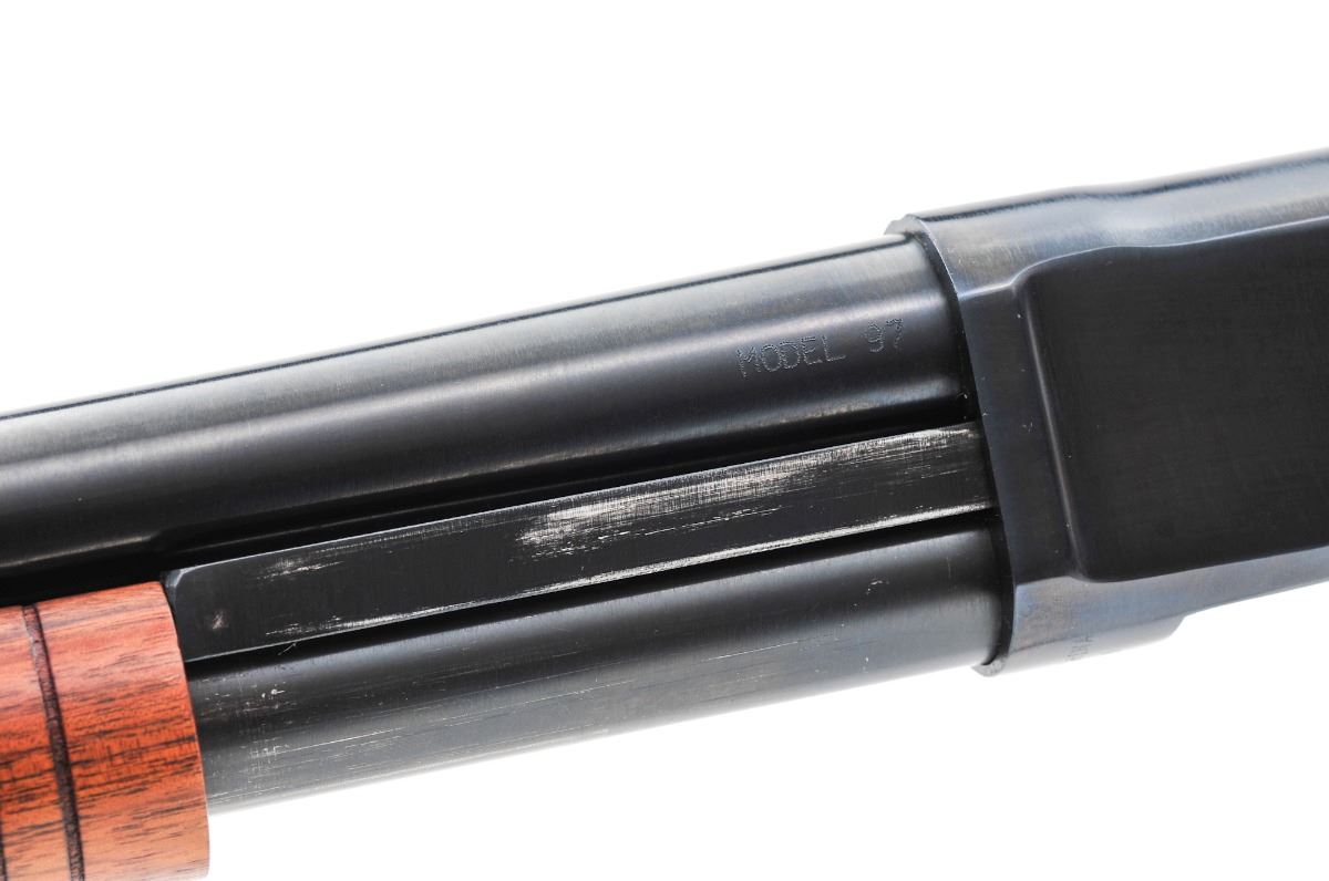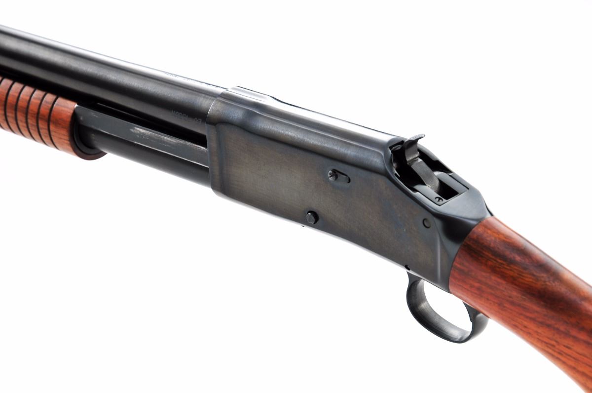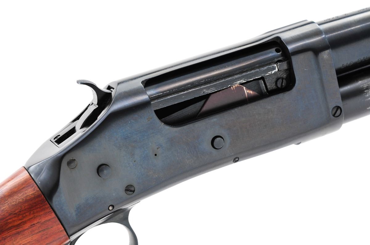 Interesting Chinese Copy of a Winchester Model 97 Slide-Action Hammer Shotgun, by Norinco, #0401029, 12 ga., 2-3/4'' ch., blue finish, 26'' barrel with front brass bead and Modified choke; importer marked ''IAC BILLERICA MA. CHINA S.D.I.'' The walnut pistol grip stock and handle have a semi-matte finish with a 13-5/8'' length of pull to checkered plastic buttplate; weight is 7-5/8 lbs. Overall condition is excellent, appearing to have been fired only a few times. Action is tight; bolt and magazine tube have scuffs from cycling. Est.: $250-$350. (Modern)