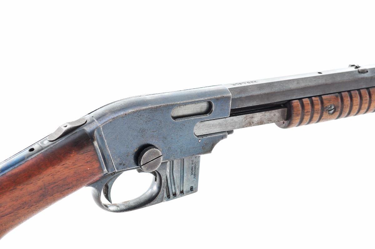 Savage Model 1903 Pump Action Rifle, #99059, .22 S-L-LR cal., 24'' octagonal barrel, blue finish, smooth pistol-grip walnut stock with grooved forend, factory metal buttplate with Savage trademark logo, standard front sight, rear sight has been removed and plugged with a dovetailed block and screw. With one factory magazine. Condition is good. Barrel shows crisp maker's marks and an overall light brown patina. Receiver retains approx. 60% high gloss finish with general moderate surface rust. Upper tang is tapped for sight. Stock and forend with very little finish remaining. Action is crisp, bore is very good with some frosting. Est.: $250-$400. (C&R)