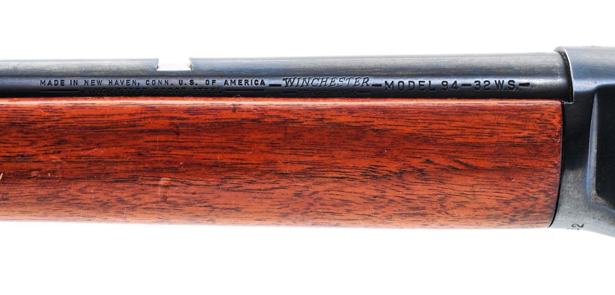 Pre-64 Winchester Model 94 Lever Action Rifle, #1597132, .32 WS cal., 20'' round barrel, dark blue finish, straight walnut stock and forend, checkered steel buttplate, Lyman blade front sight, Williams adjustable receiver sight, with sling swivel studs. Mfg'd 1949. Condition is fine retaining approx. 98% dark blue finish with some small scratches and other marks from use. Top edge of the front sight blade is damaged. Stock with general impressions, scratches, and some thinning and gumming to the finish. Action is crisp, bore is bright. Est.: $450-$650. (C&R)