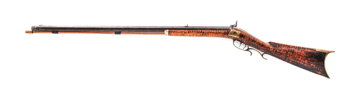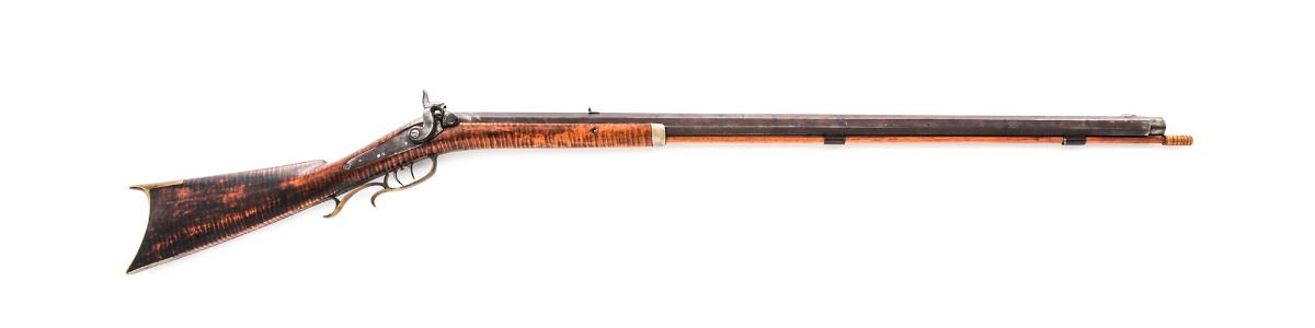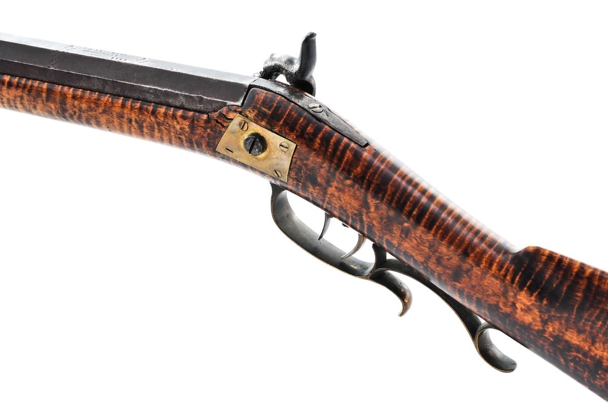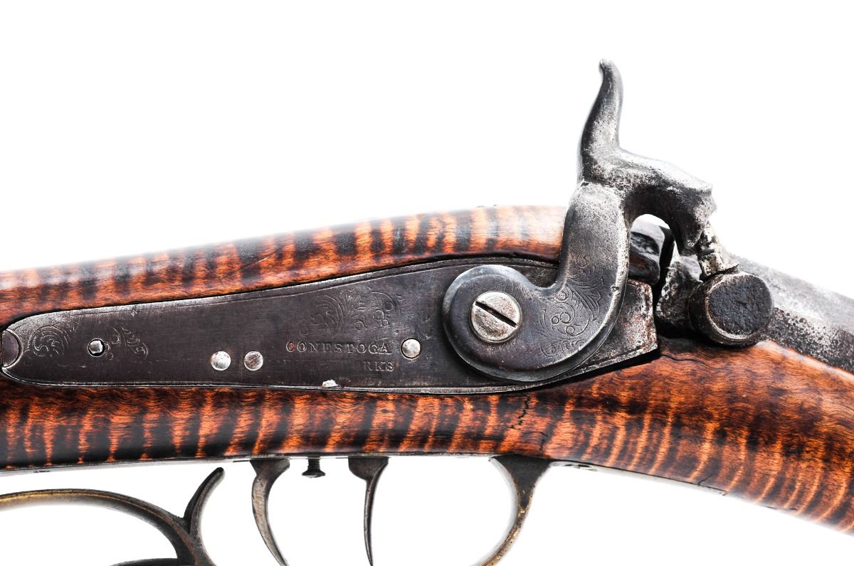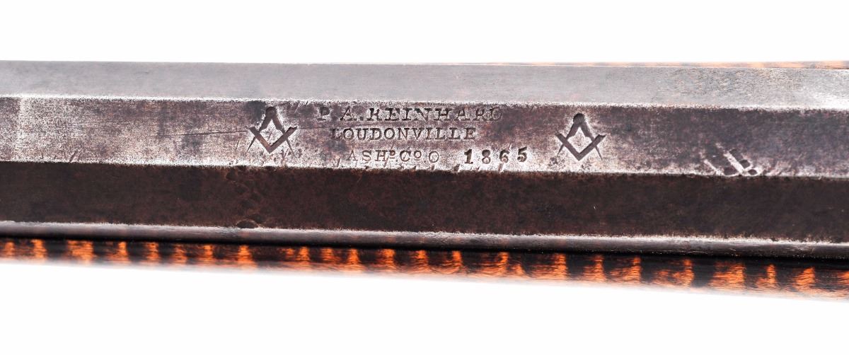 P.A. Reinhard marked Single Shot Percussion Rifle, NVSN, approx. .38 cal., 33'' barrel, brown finish, adjustable double set triggers, drum style bolster, lightly engraved hammer, halfstock tiger maple stock, with dovetailed German silver blade front sight and fixed iron rear sights. Top barrel flat is marked ''P.A. REINHARD LOUDONVILLE/ASHD CO. O 1865''; lock is engraved with a floral motif and marked ''Conestoga Works''. Condition is very good. Brass triggerguard with finger and grip extension, wooden ramrod and mounted with a nice tiger stripe maple halfstock with German silver forend cap and brass crescent buttplate. Stock is repaired with a brass reinforcement at stock crossbolt. Est.: $500-$900. (Antique)
