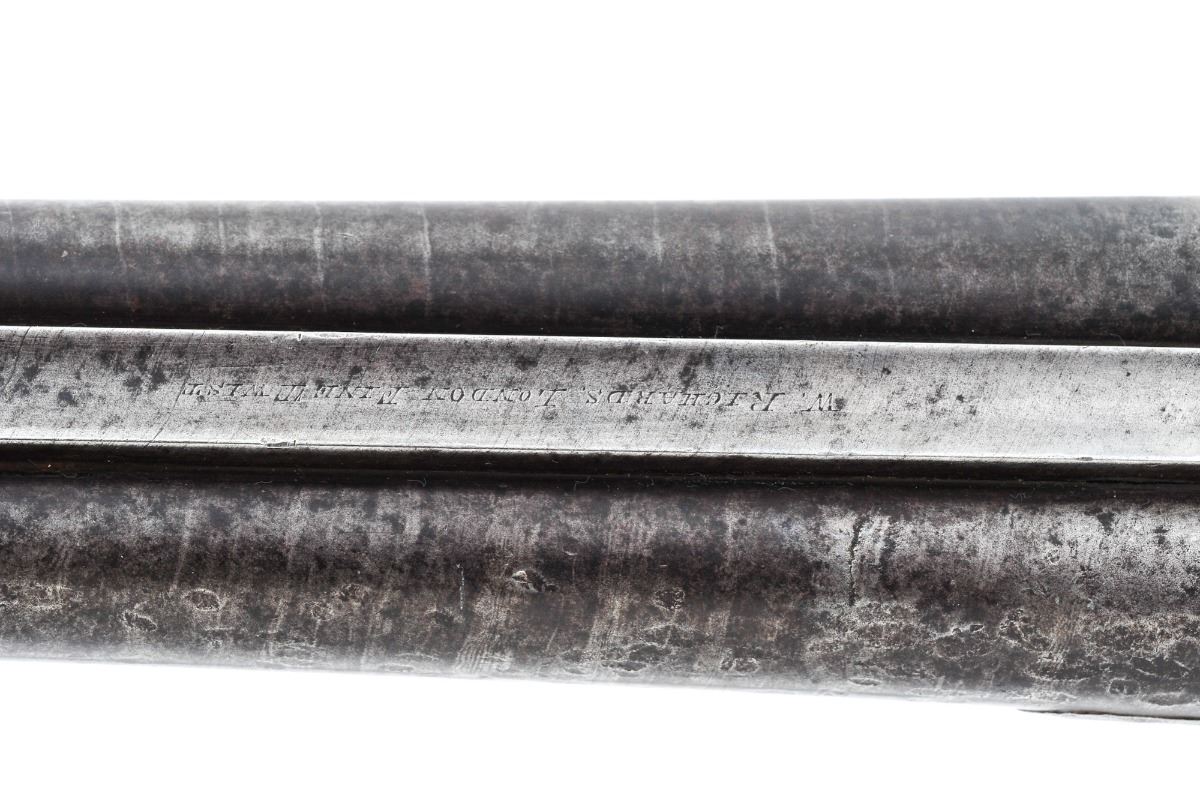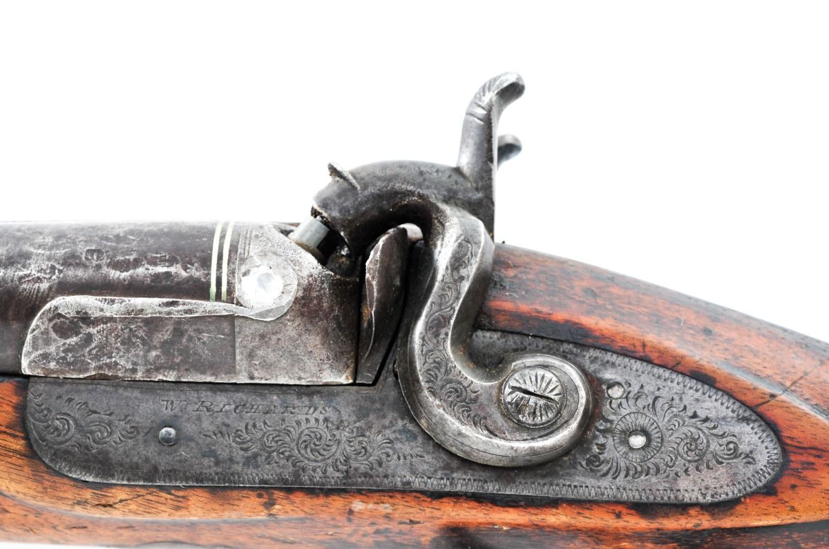 Antique Side-by-Side Halfstock Percussion Shotgun, by W. Richards, approx. 12 ga., 32'' browned twist barrels with 1/2'' concave rib marked ''W. Richards, London Fine Twist'' with silver front bead; barrels have a single Birmingham black powder proof; lockplates and hammers are scroll engraved with double triggers; checkered walnut stock with steel buttplate and brass-tipped ramrod. Condition is fair, for decorative or display purposes only. Barrels are corroded and are coming apart from rust at the breeches; top tang show crack, and checkered stock has worn smooth with numerous marks, impressions and fissures. Est.: $200-$350. (Antique)