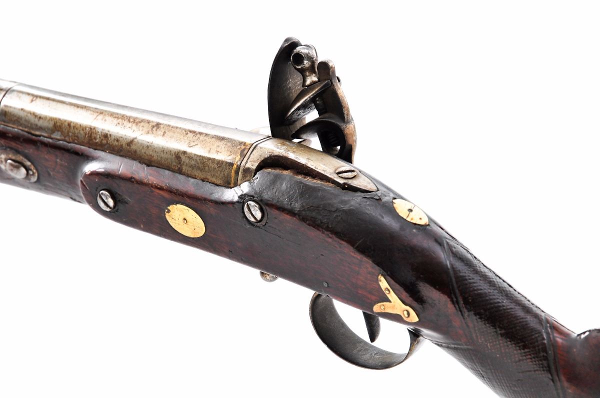 Nicely made English Flintlock Fullstock Blunderbuss, by unknown maker, NSVN, 16'' half-round half-octagon cannon-style barrel with gold band at breech, bright finish, all steel furniture with brass accents, checkered walnut stock, no ramrod. Condition is fair. Flintlock functions as designed but all markings are unreadable. Stock is dented and scratched overall with significant losses near right side at muzzle. Est.: $500-$750. (Antique)
