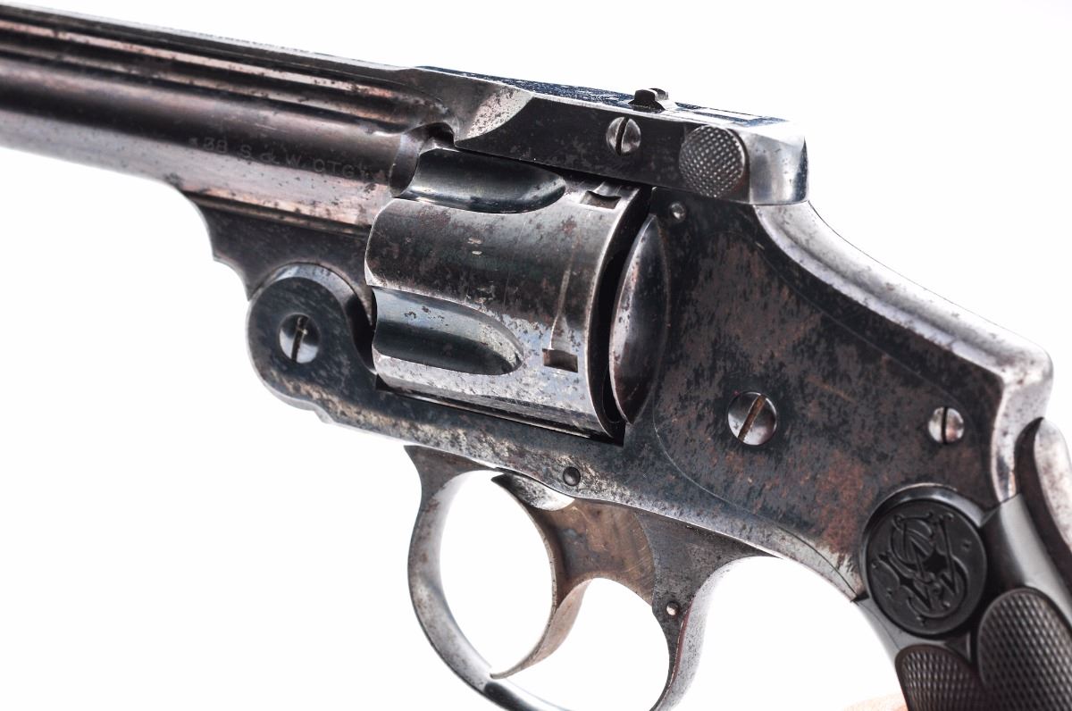 Smith & Wesson Safety Hammerless 4th Model Double Action Revolver, #146286, .38 S&W cal. 5-shot, 4'' barrel, blue finish, hard rubber grips, two-line barrel marking, with fixed front sight and rear integral sight. Condition is good. Pistol retains approx. 90% overall blue turning to patina with light surface corrosion overall. Safety bar functions as designed. Grips are very good with no chips or cracks. Action is tight, bore is bright with strong rifling. Estimate $250- $400 (C&R/PPT)