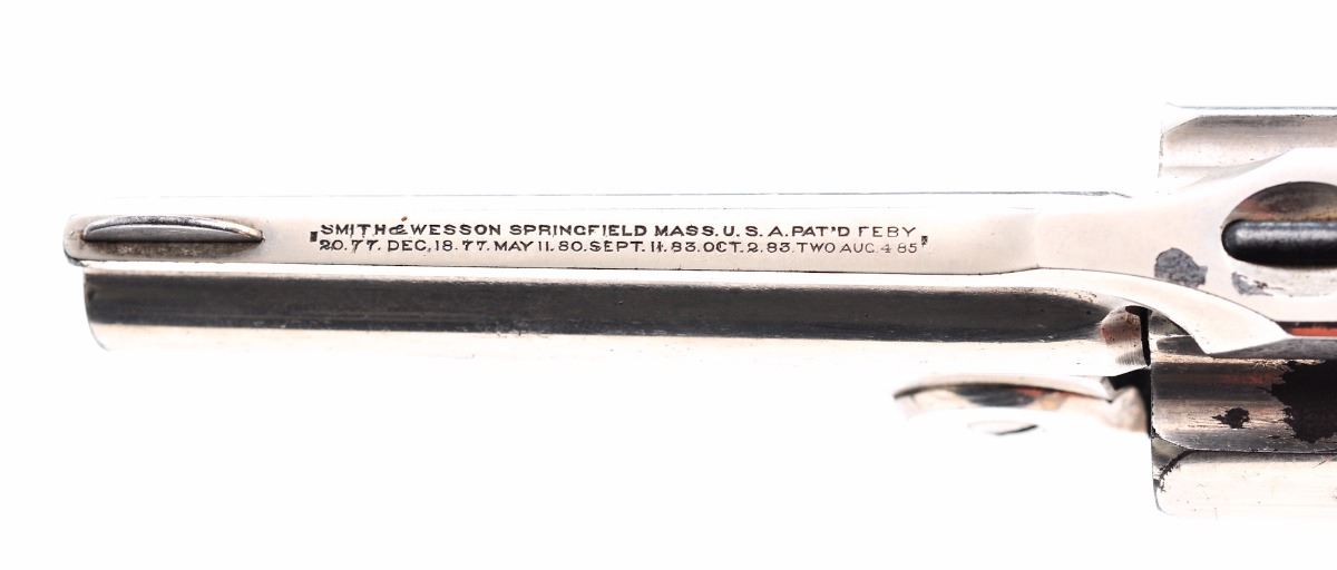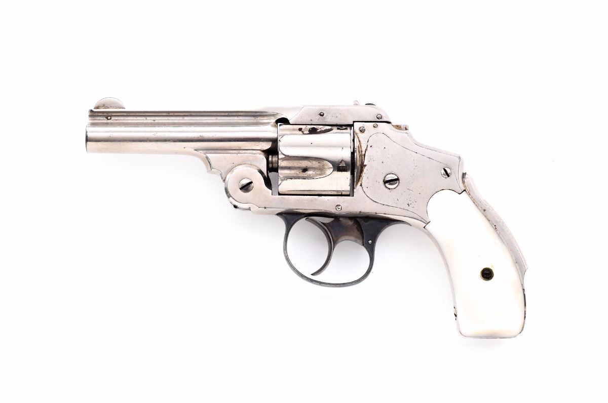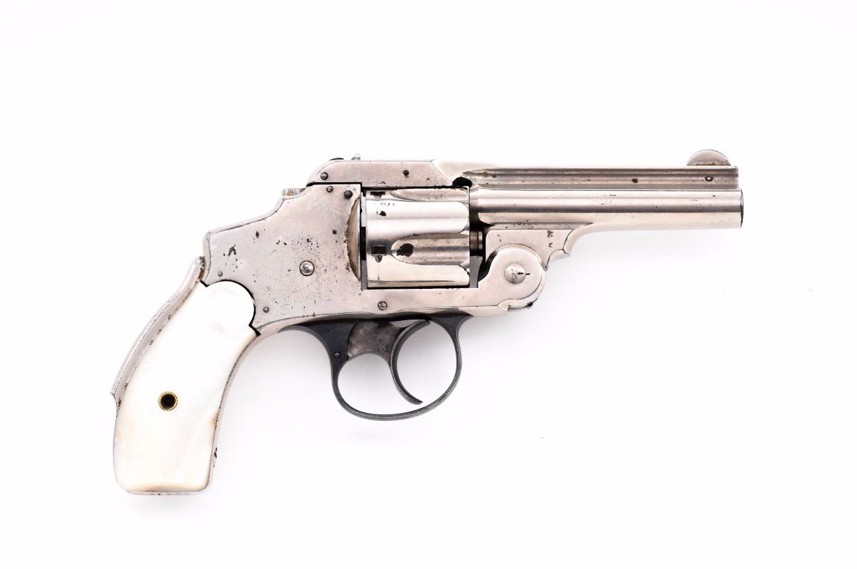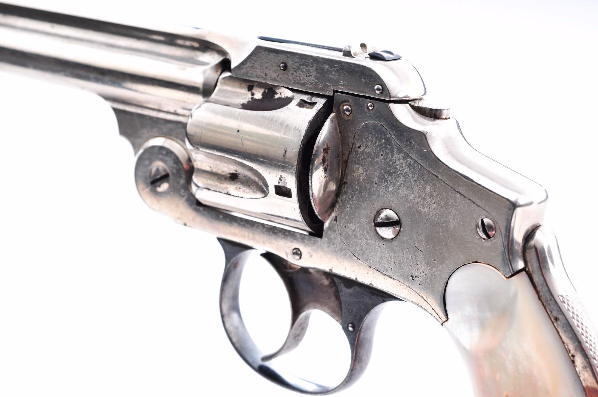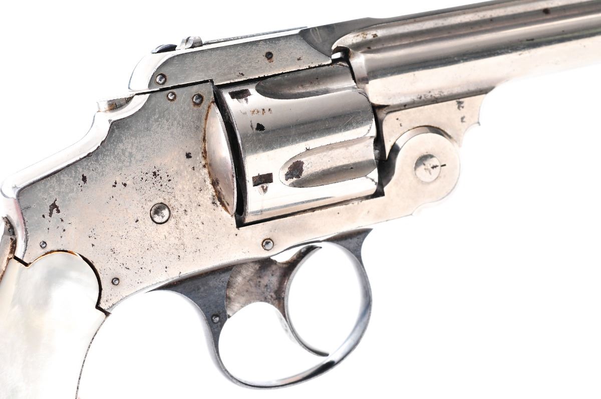 Smith & Wesson Safety Hammerless 2nd Model Double Action Revolver, #32602, .38 S&W cal. 5-shot, 3-1/4'' barrel, nickel finish, mother of pearl grips. Condition is fine retaining approx. 90% original nickel, with overall freckling and clouding and small areas of loss. Pearl grips are excellent with no cracks or losses. Approx. 50% blue remains on the triggerguard and generous amounts of case colors on the trigger. Action is tight, bore is strong with some areas of pitting. Est.: $350-$500. (Antique)