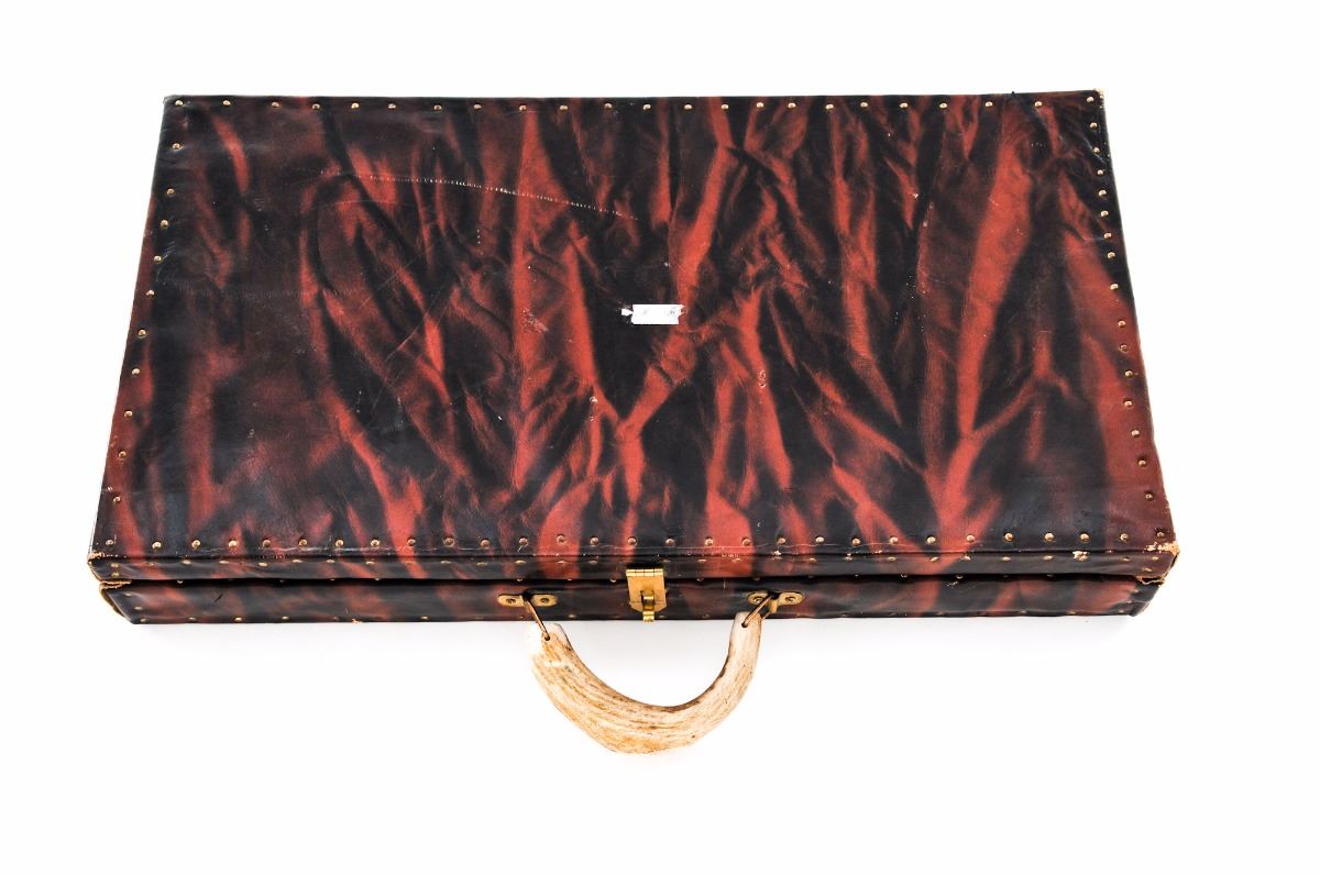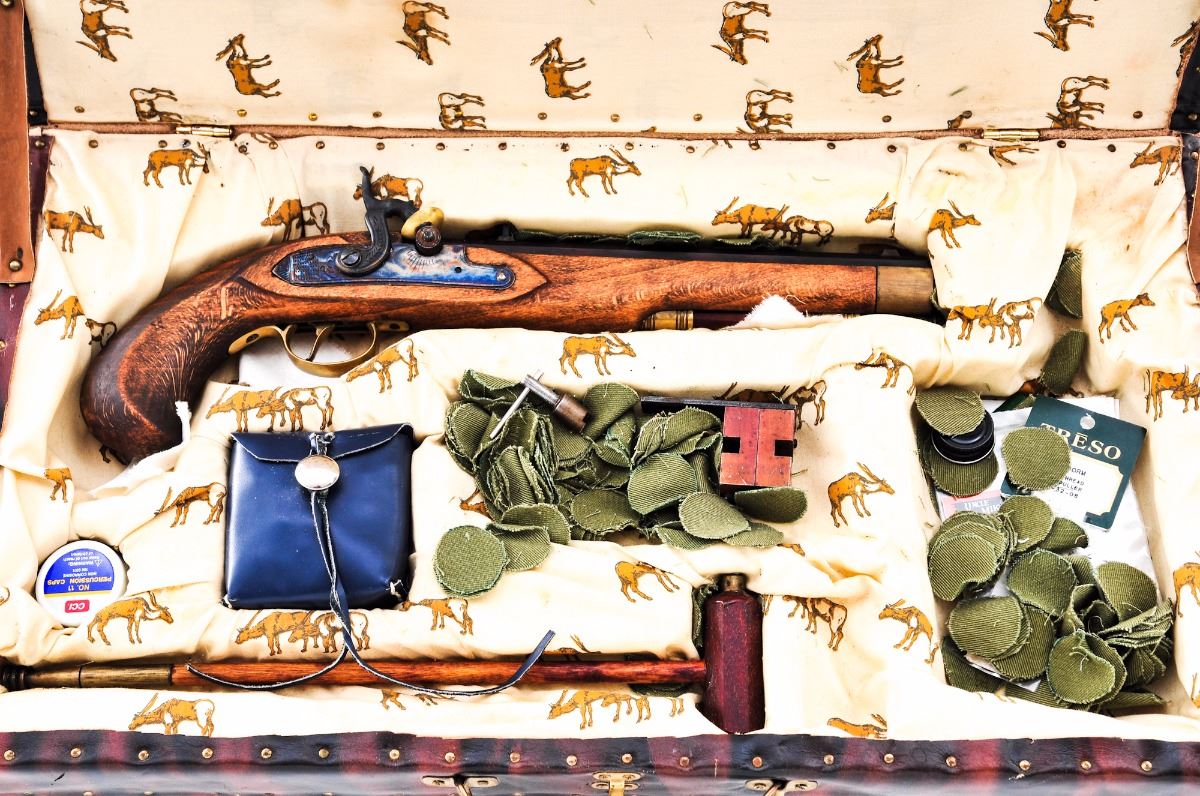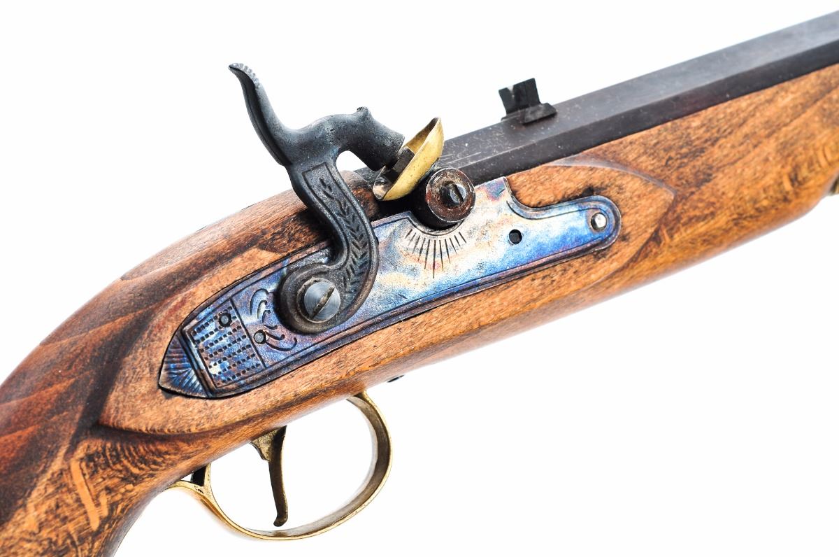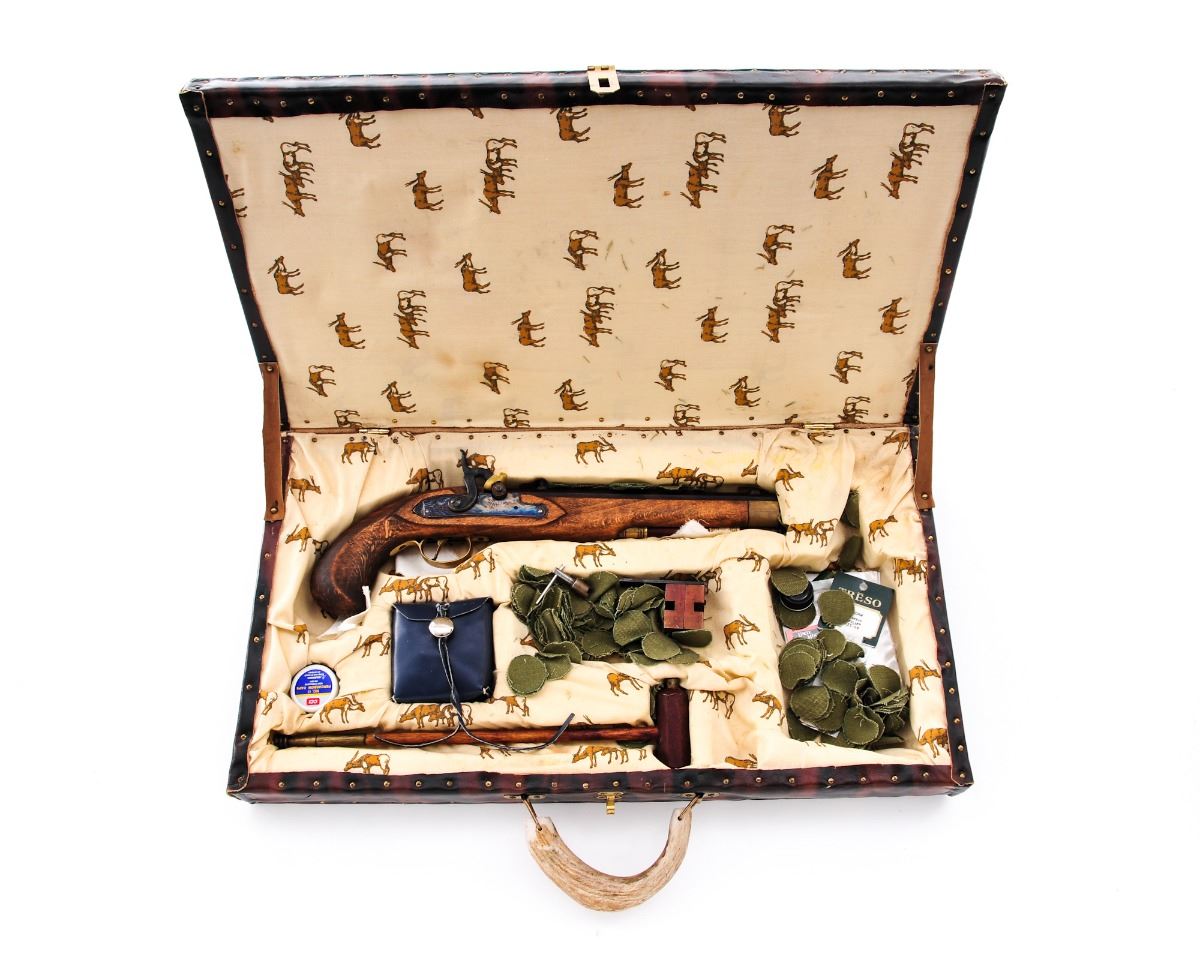 Connecticut Valley Arms Percussion Black Powder Pistol, #0068672, .45 cal., 9-3/4'' octagon barrel, blue barrel, case hardened lock, brass hardware, walnut stock, fixed sights, in hobbyist made tacked case and misc. black powder accessories, including patch puller, patches, perc. caps, balls, etc. Condition of the pistol is very good. Barrel with an overall dark patina. Case colors to lock are bright and vibrant but very little remain to the hammer. Stock with oil darkening due to lack of varnish and light marks from handling. Est.: $125-$250. (Antique)