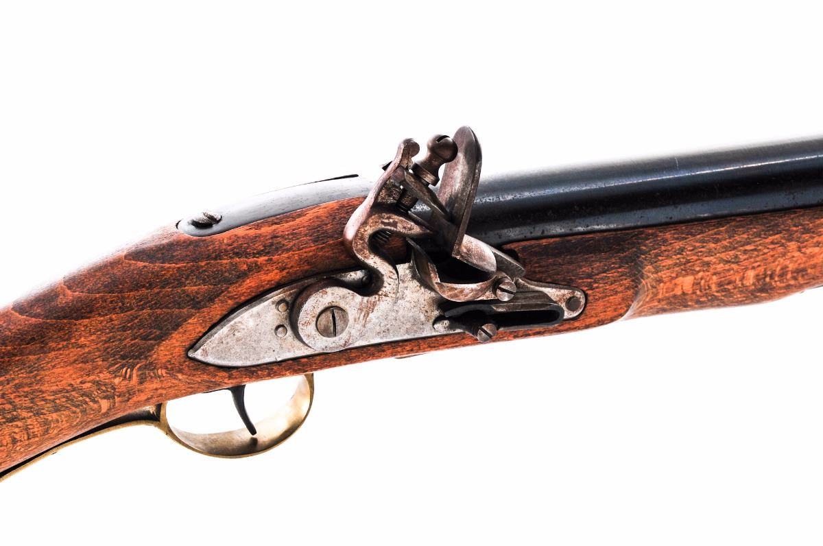 Copy of a Continental Flintlock Blunderbuss, NVSN, 14'' blue barrel, bright flintlock, beech stock, with brass hardware. Condition is good showing light discoloration from storage and surface rust to barrel. Good functioning action, bore appears unfired. Est.: $100-$200. (Antique)