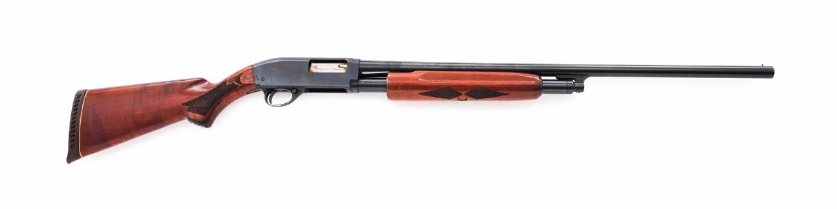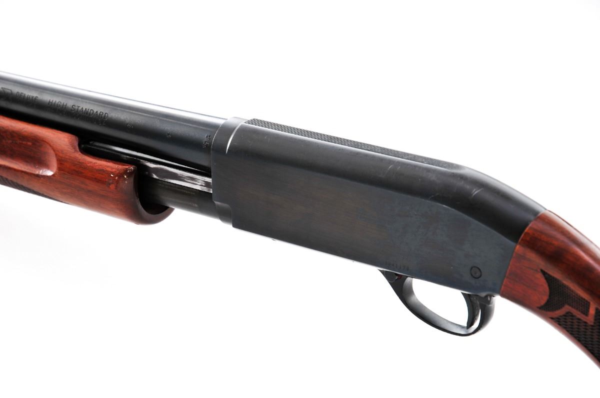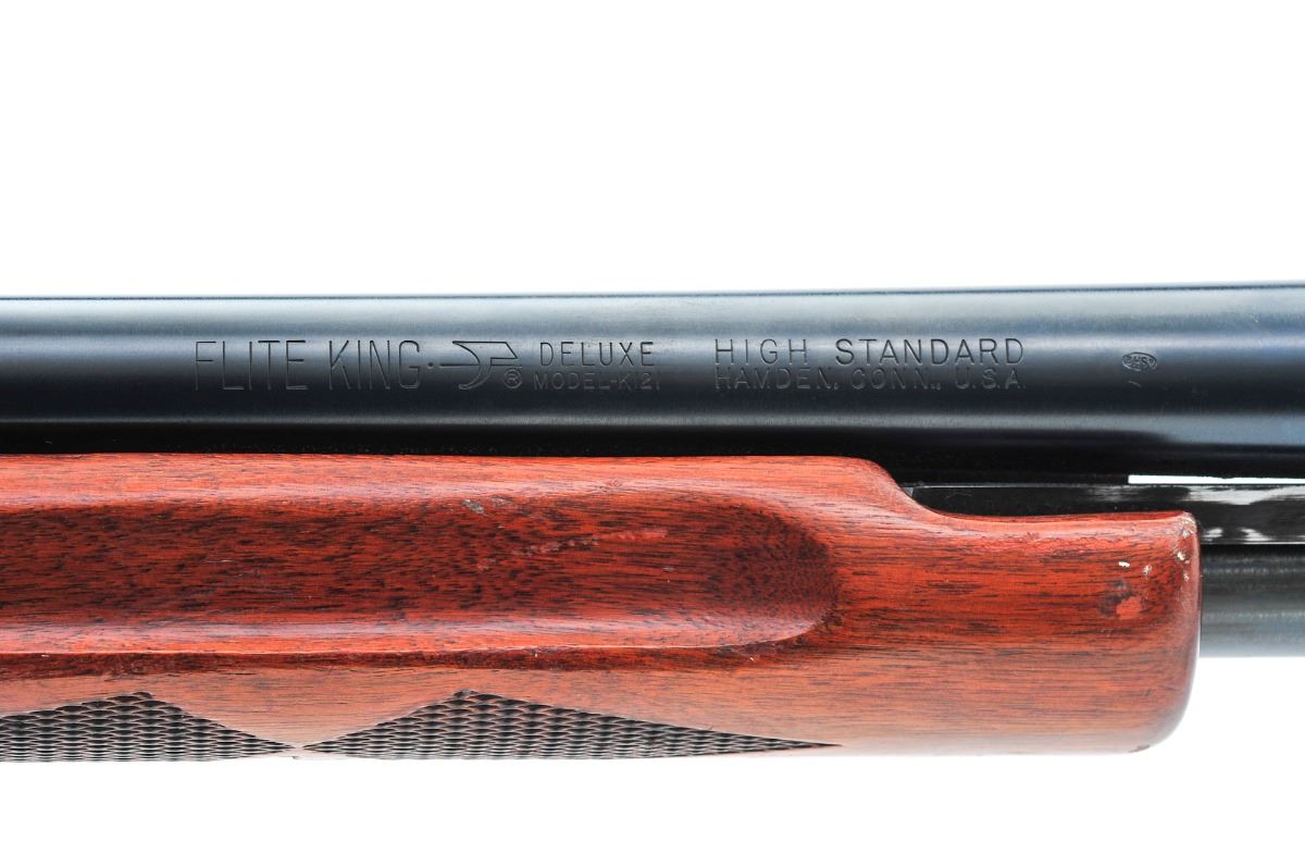 High Standard Flite King Deluxe Model-K121 Slide Action Shotgun, #3041178, 12 ga., 2-3/4'' ch., blue finish, 28'' barrel with brass front bead, Full choke, triggerguard mounted push-button safety, semi-gloss finished hardwood pistol-grip stock and handle with pressed checkering. Length of pull is 14-1/4'' over a brown 1'' recoil pad; weight is 7-5/8 lbs. Overall condition is very good with a tight action showing light use and a bright bore with residual fouling. Blue finish is 95% with scattered scratches and oxidation; barrel and magazine tube have areas of pitting; bolt and receiver interior have dried grease and staining. Stock finish has overall gloss fading with a hardened recoil pad. Est.: $175-$275. (Modern)