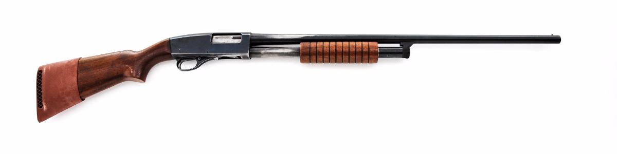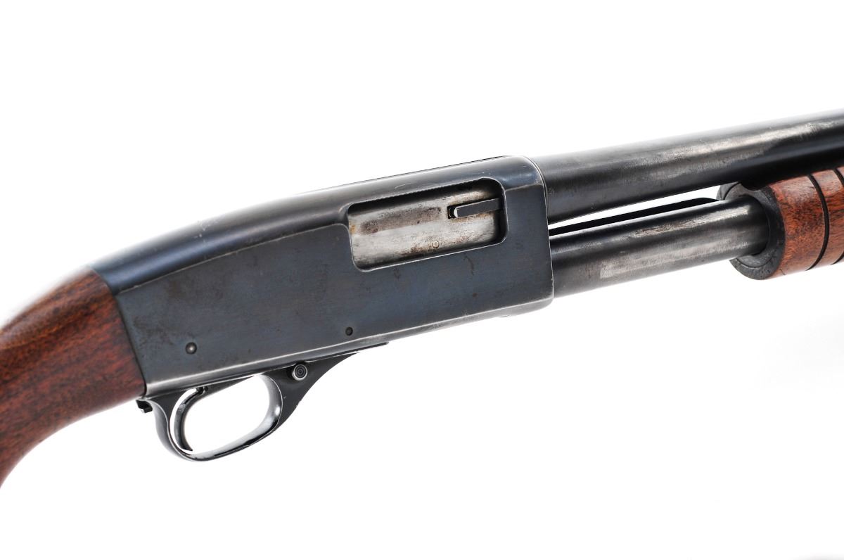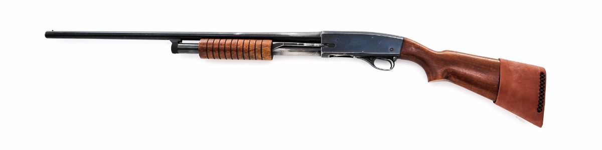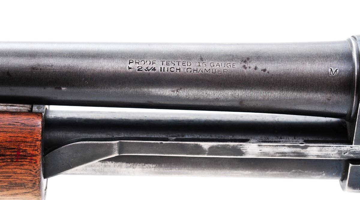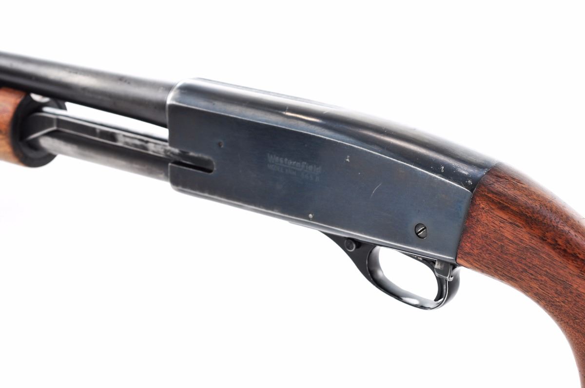 Westernfield Model XNH 565B Pump Action Shotgun, NVSN, 16 ga. for 2-3/4'' shells, 28'' barrel, blue finish, smooth pistol-grip walnut stock with grooved forend, added red rubber Pachmayr slip-on recoil pad, with brass bead front sight. No buttplate. Condition is good retaining approx. 70%-75% thinning blue, with wear to the high edges and rear portion of the barrel, and general moderate scratches and a few patches of light corrosion to the frame that should easily clean. Stock with thinning to finish in handling areas and some impressions and bruising. Action is crisp, bore is near excellent. Est.: $150-$300. (C&R)